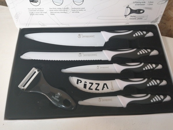 Grå silikone køkkenredskaber med træ skaft, tang og spand i metal. 12 dele i alt. Derudover knivsæt bestående af 5 knive i forskellige str., samt en skraldekniv. Ubrugt og i original emballage.