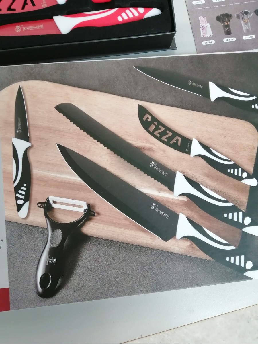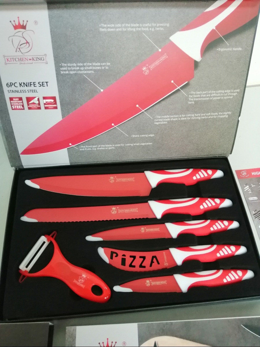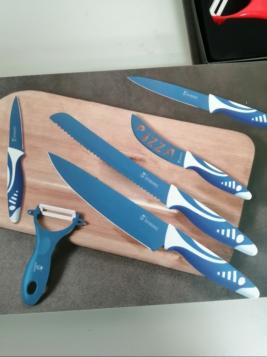 Blå, rød og sort, knivsæt med 6 dele, 3 sæt. Ubrugt