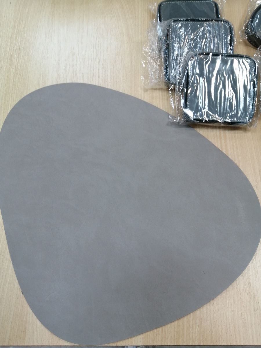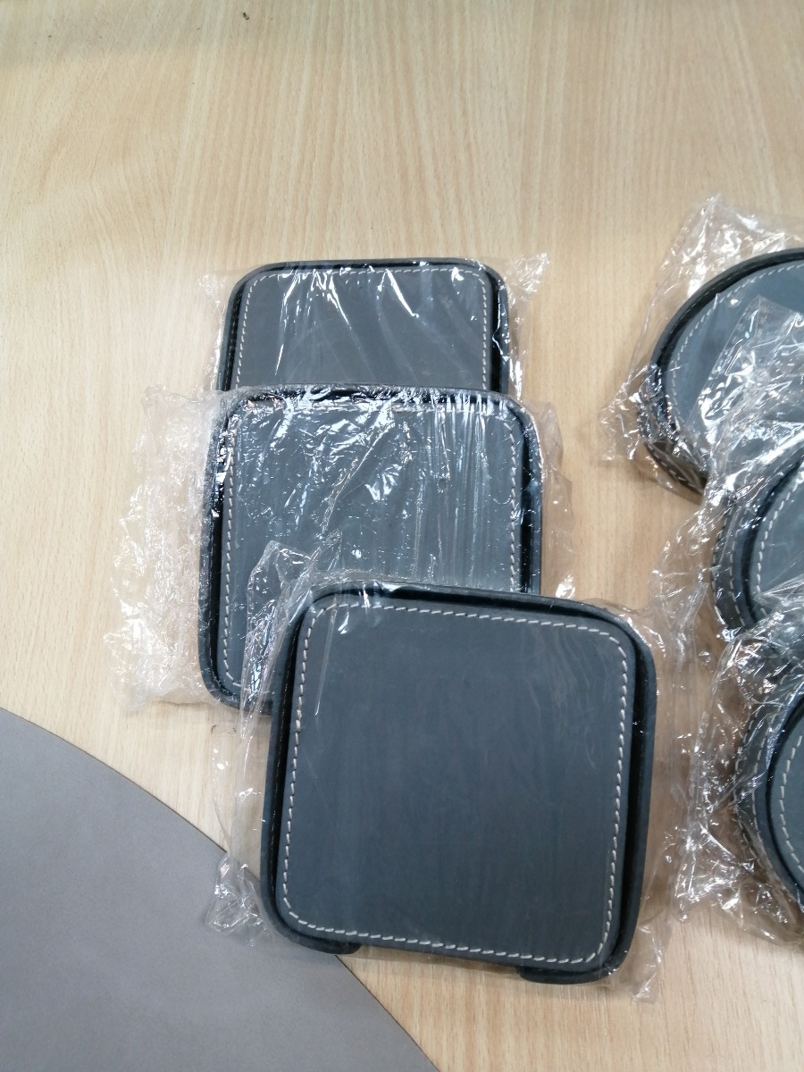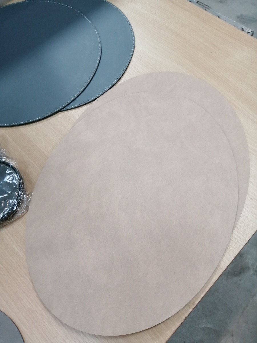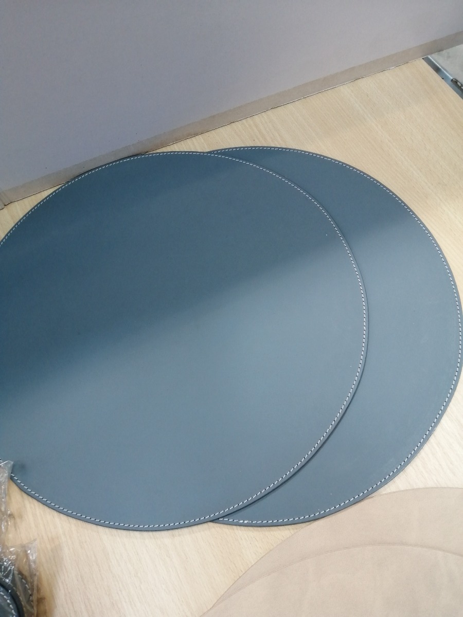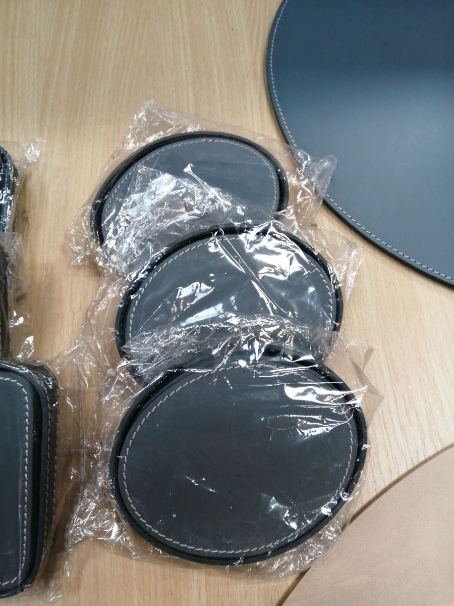 Dækkeservietter i sort og brun, 2 runde sorte, 2 brune, 1 oval.
