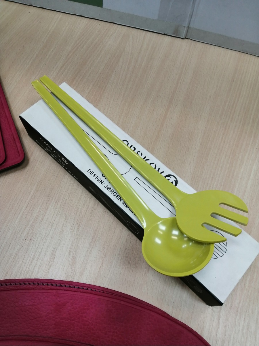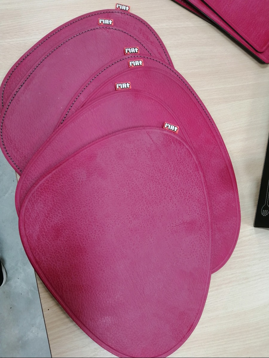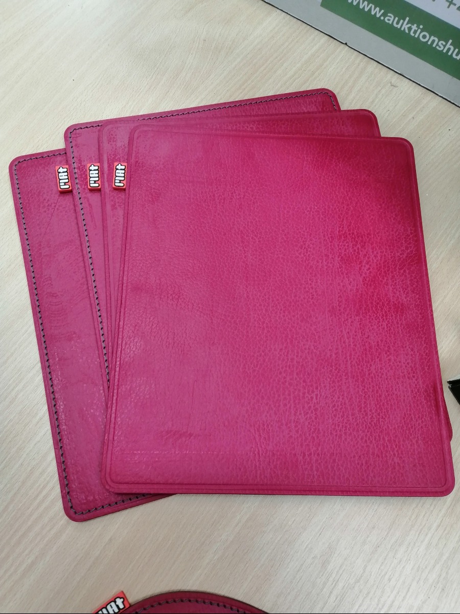 Dækkeservietter i rød, 6 oval 4 firkantet. Grøn salat bestik.