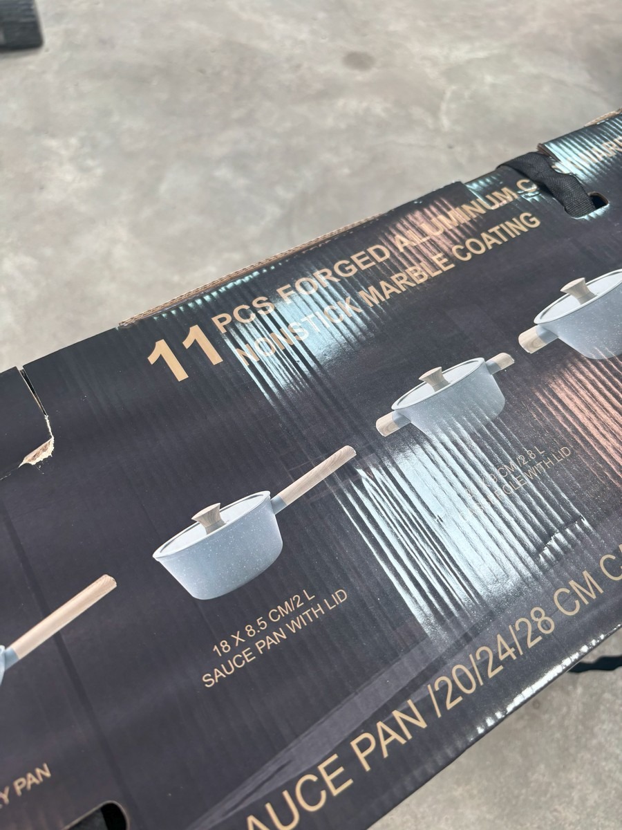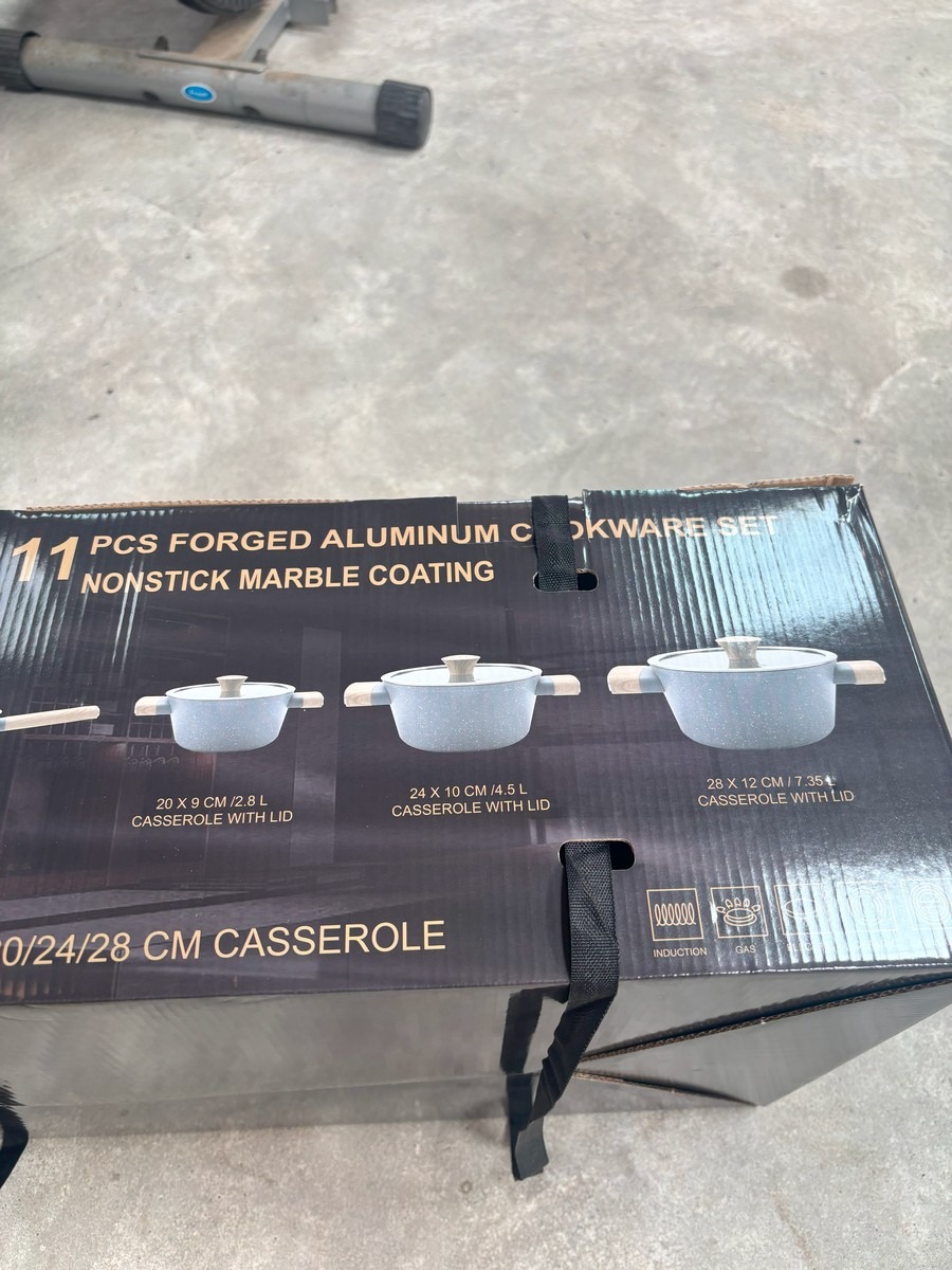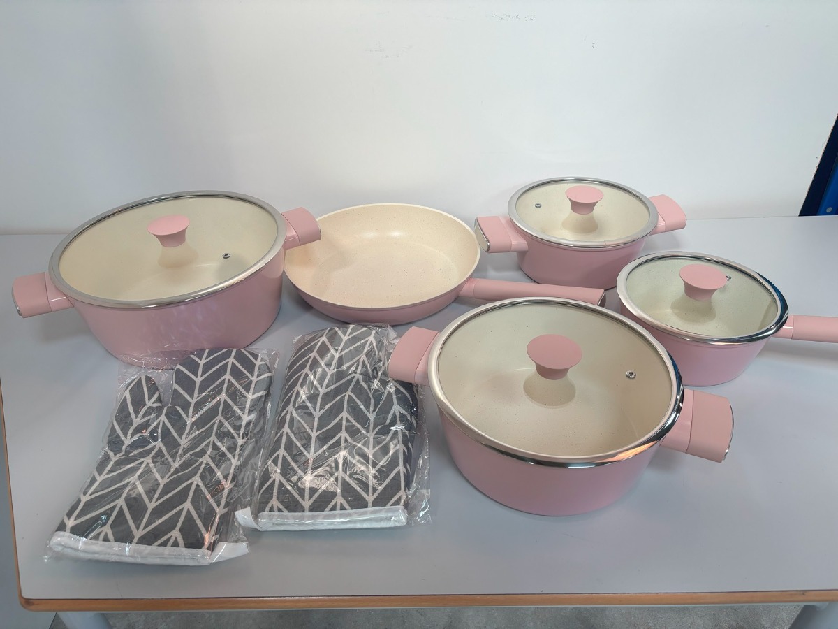 Køkkensæt m 11 dele i sart rosa. Til induktion, gas, mm. Ubrugt