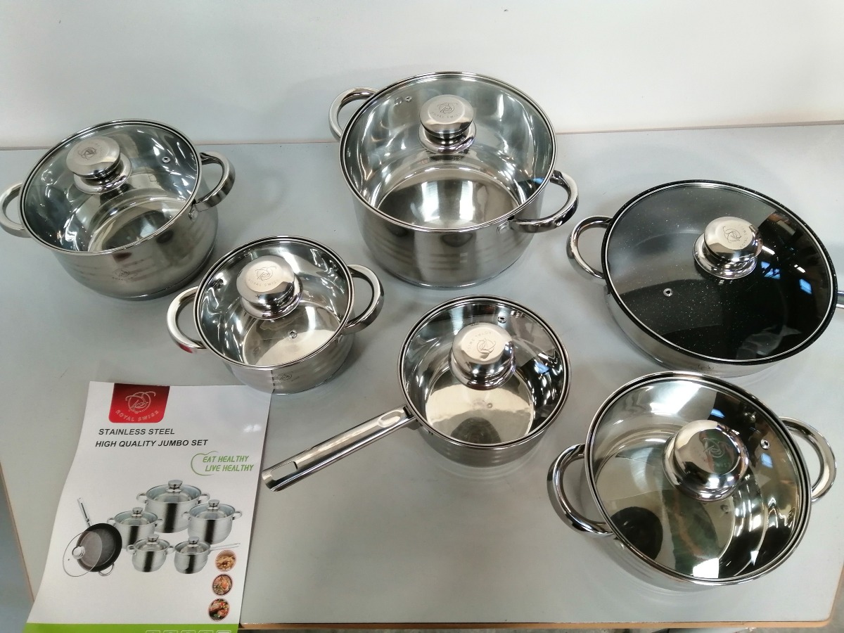 Royal Swiss grydesæt, 12 dele i stål. 5 gryder i forskellige størrelser med tilhørende låg, samt en sautépande med låg. Virker også til induktion. Perfekt sæt til køkkenet. Ubrugt og i original emballage