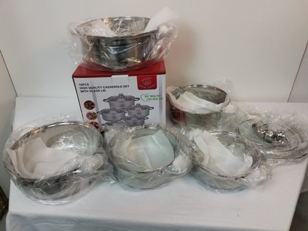10 dele Royal Swiss grydesæt i rustfrit stål. Bestående af 2,5 l. gryde med låg, 3,4 l. gryde med låg, 4,5 l. gryde med låg, 5,8 l. gryde med låg og 7,4 l. gryde med låg. Virker også til induktion. Ubrugt og i original emballage