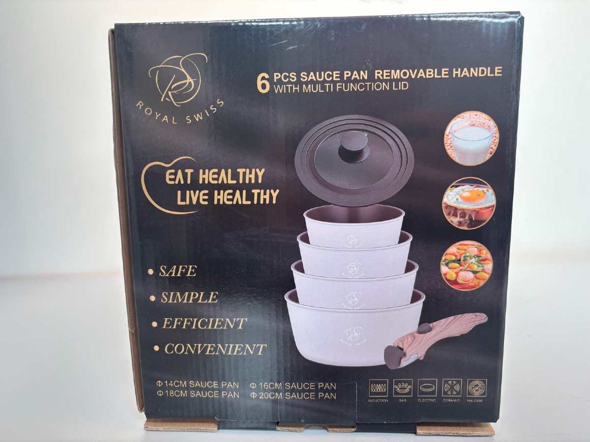 Royal swiss Grydesæt med 6 dele. 4 gryder, 1 låg & 1 aftagelig håndtag. Ø14 - Ø20. Ubrugt