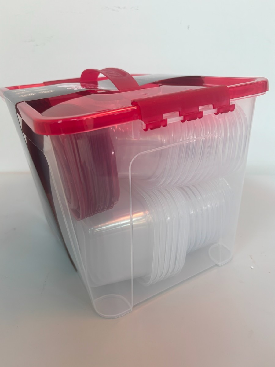 Plastopbevaringsbokse, 2 ks med i alt 120 dele. Godkendt til mikroovn, opvaskemaskine og frost. 20 stk. af 1000 ML, 1 st. 11L, 6 stk. 750ML, 11 stk. 250ML, 6 stk. 700Ml, 26 stk. 280ML. Ubrugt