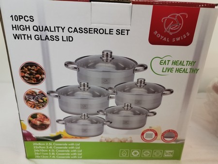 10 dele Royal Swiss grydesæt i rustfrit stål. Bestående af 2,5 l. gryde med låg, 3,4 l. gryde med låg, 4,5 l. gryde med låg, 5,8 l. gryde med låg og 7,4 l. gryde med låg. Virker også til induktion. Ubrugt og i original emballage