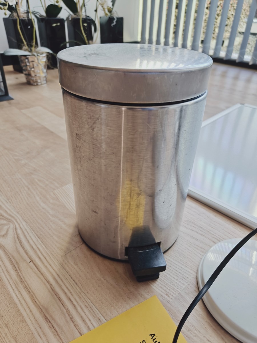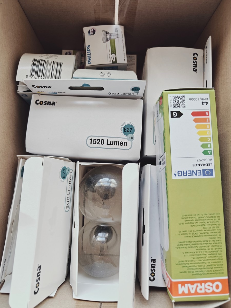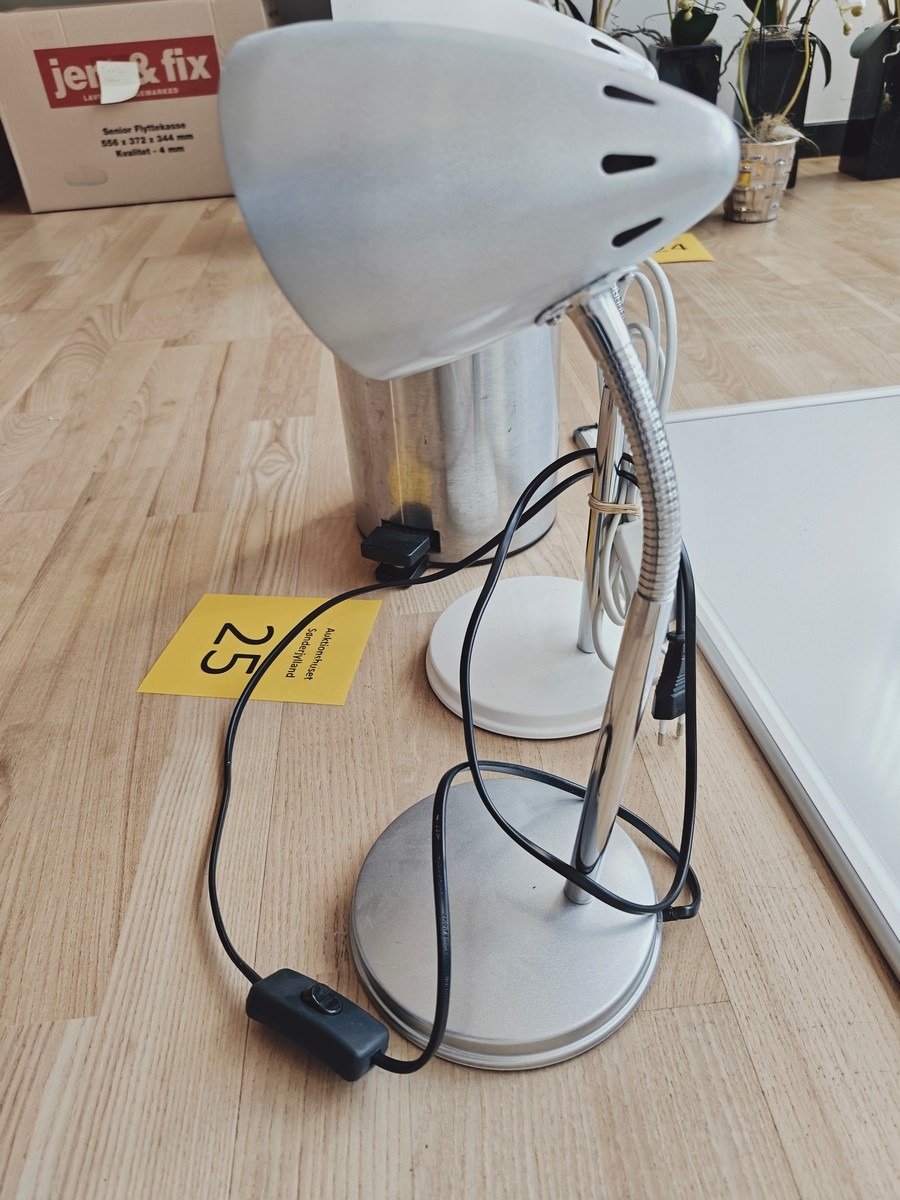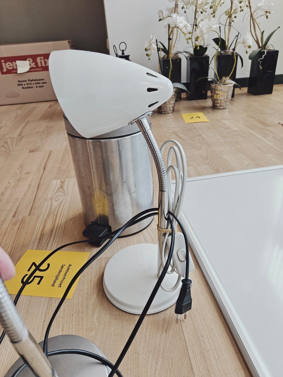 Div. kontor ting 1 whiteboard 60x90 cm. 2 bordlamper h 25 cm. 16 stk ubrugte pærer. skraldespand