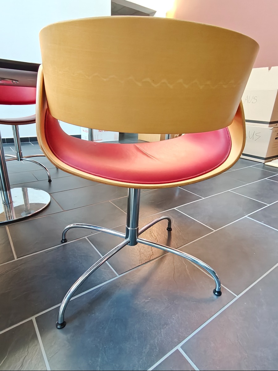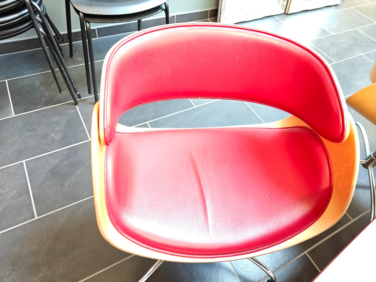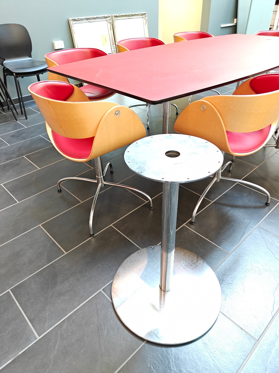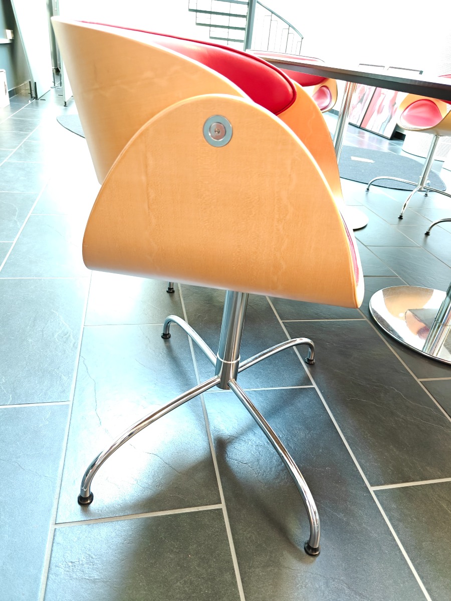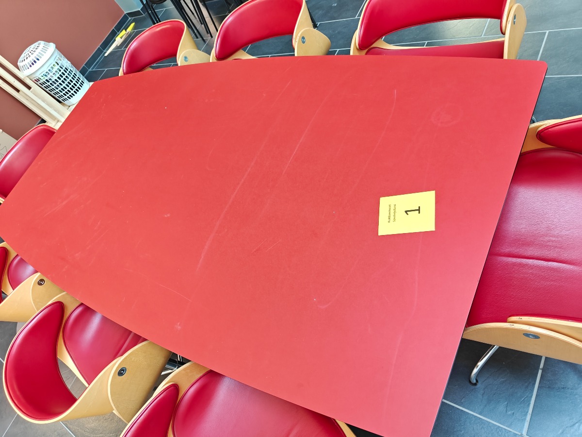Konferencebord med Magnus Olesen stole, 6 stk med drejefunktion. Bordet er fra Uffe østerlid og måler 2,4 l x 1,2 b. Bordet har brugsspor elers i ok stand. Magnus Olesen stolene, er med bøgeskal og med rødt polstret læder samt krom stel Ok stand med brugspor.