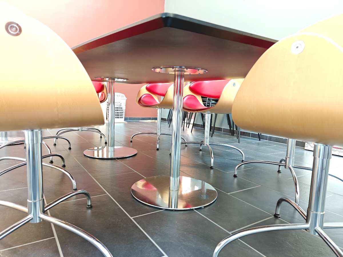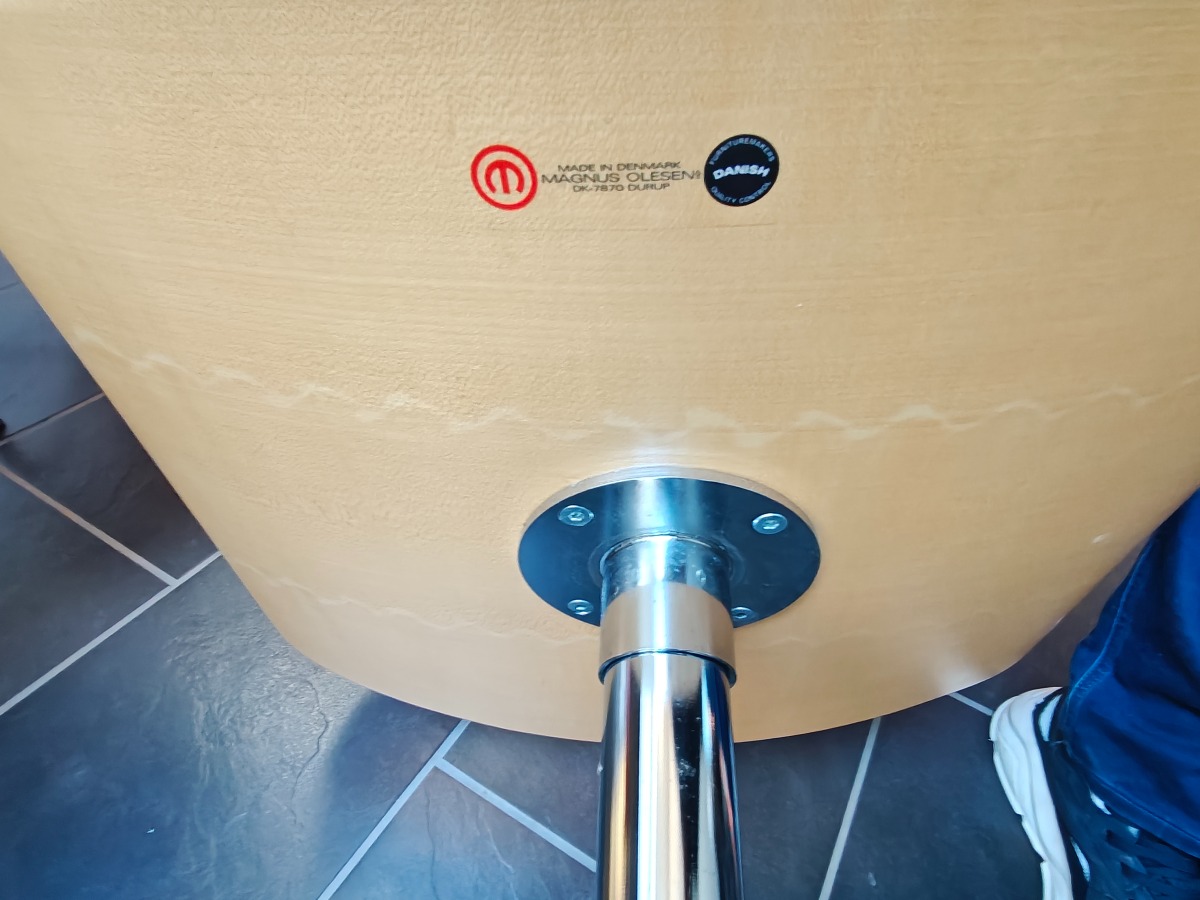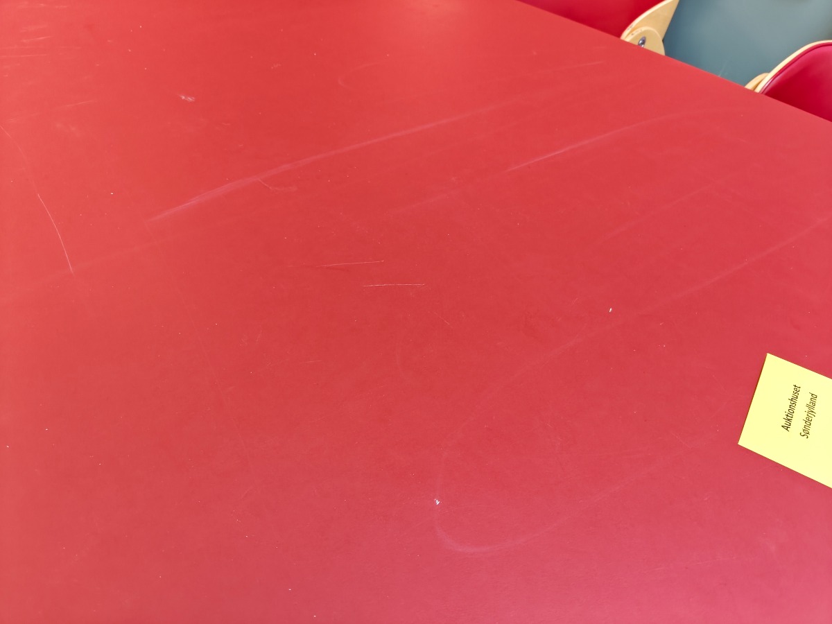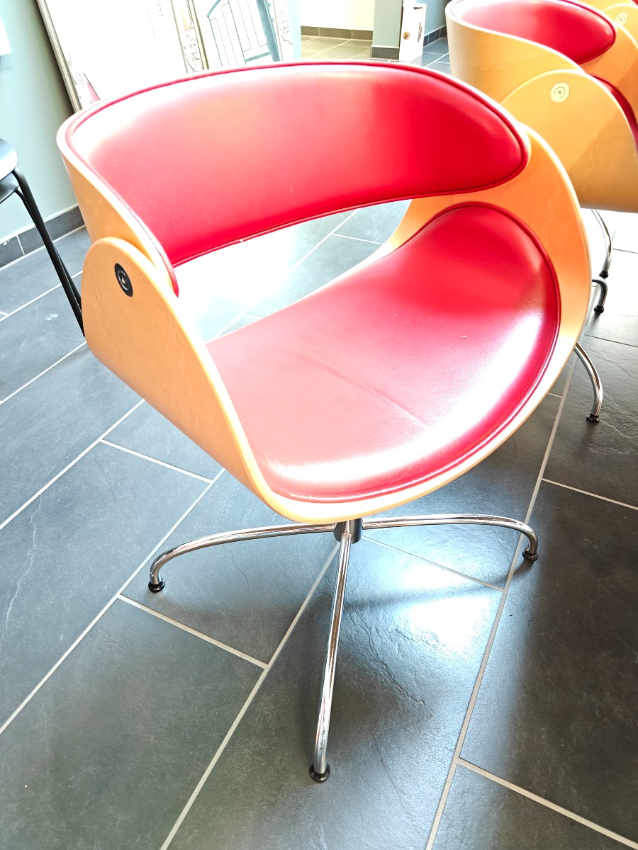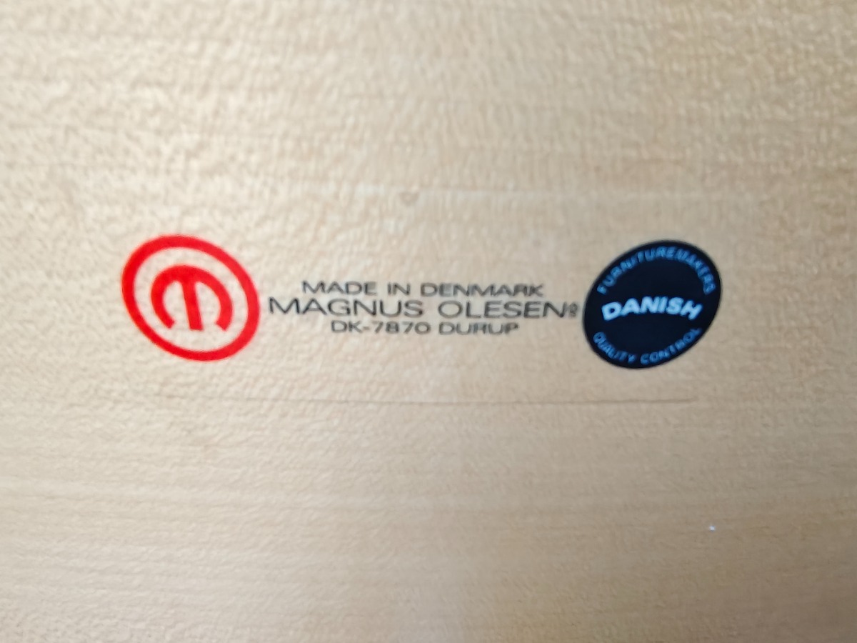 Konferencebord med Magnus Olesen stole, 6 stk med drejefunktion. Bordet er fra Uffe østerlid og måler 2,4 l x 1,2 b. Bordet har brugsspor elers i ok stand. Magnus Olesen stolene, er med bøgeskal og med rødt polstret læder samt krom stel Ok stand med brugspor.