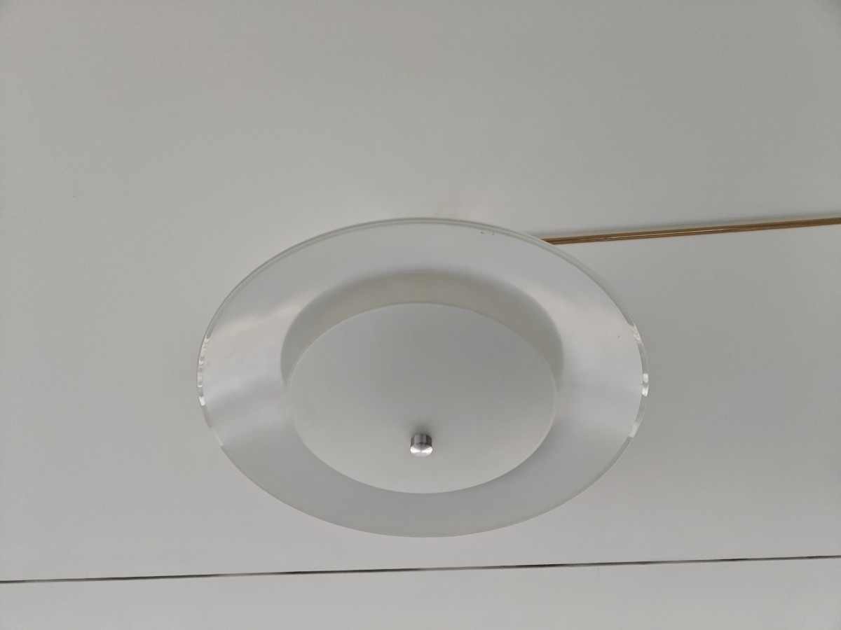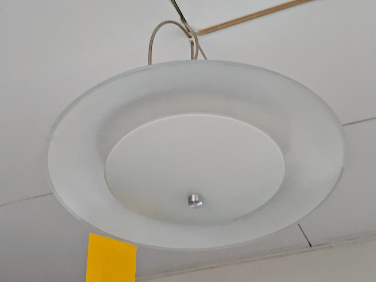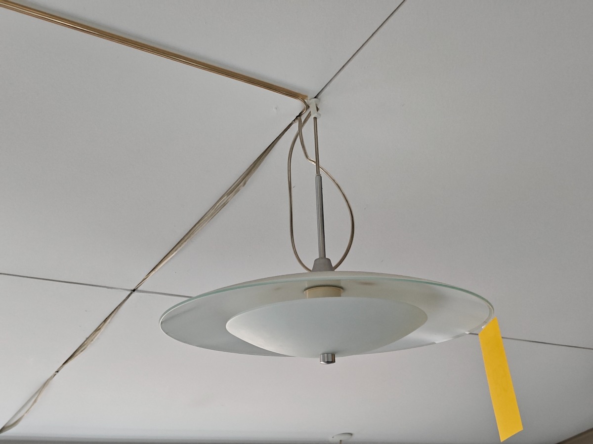 2 stk. loftpendler med glasskræm. Den ene glasskærm har en revne. Køber skal selv nedtage.