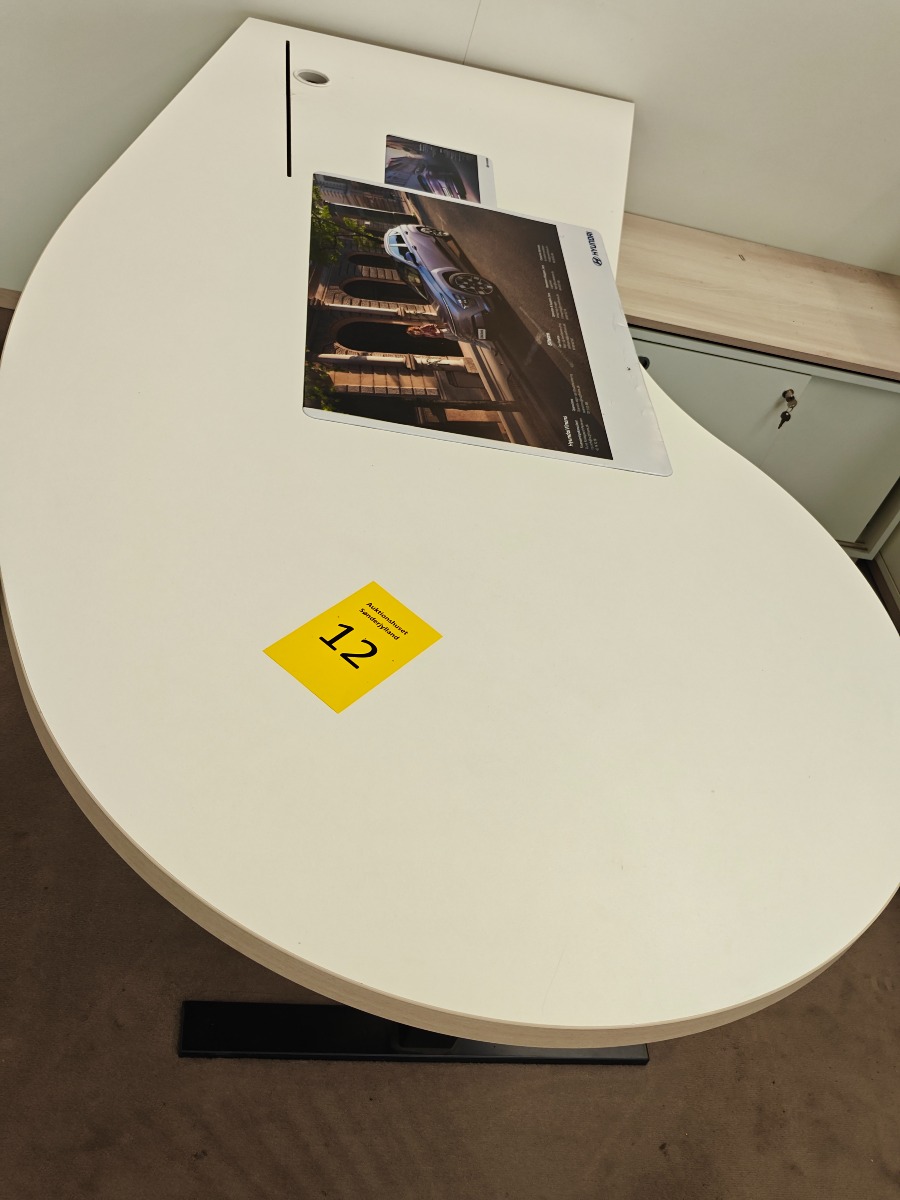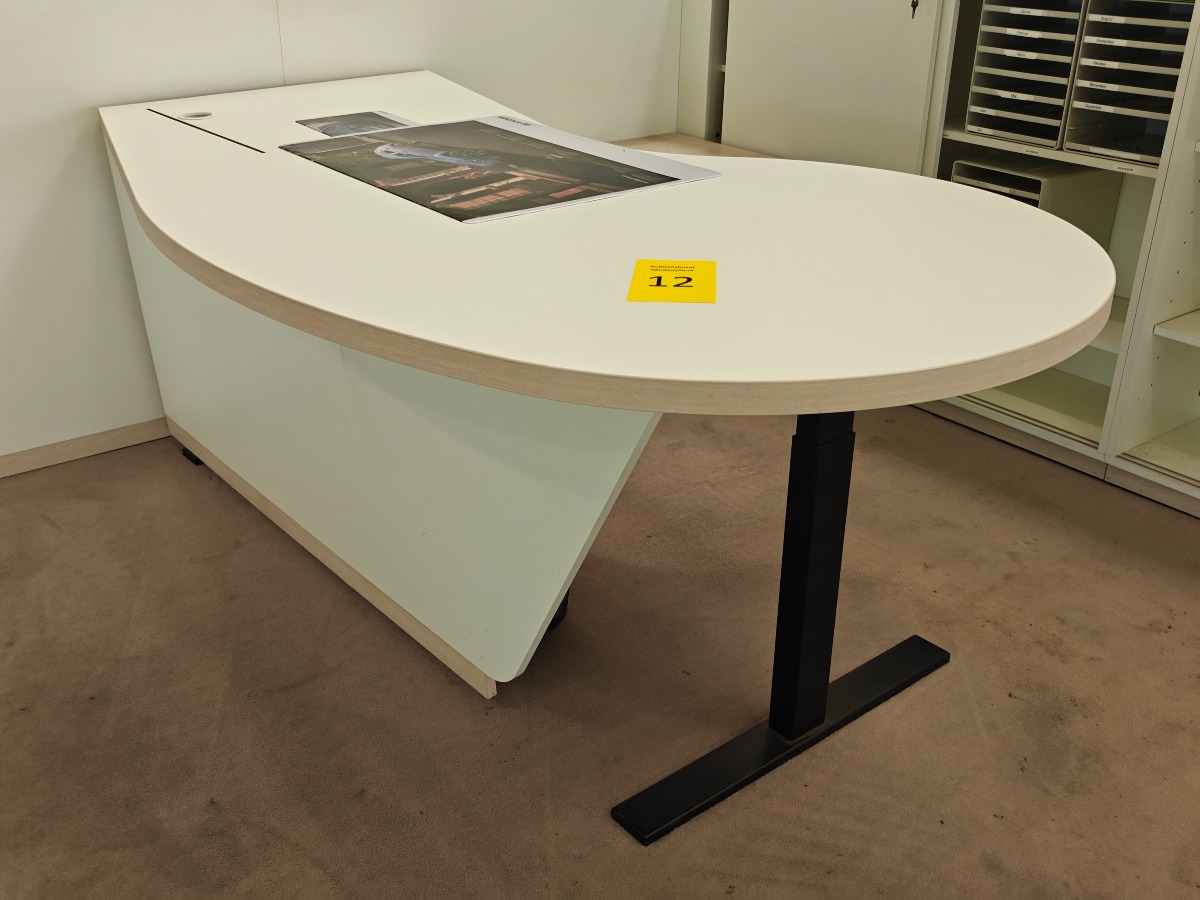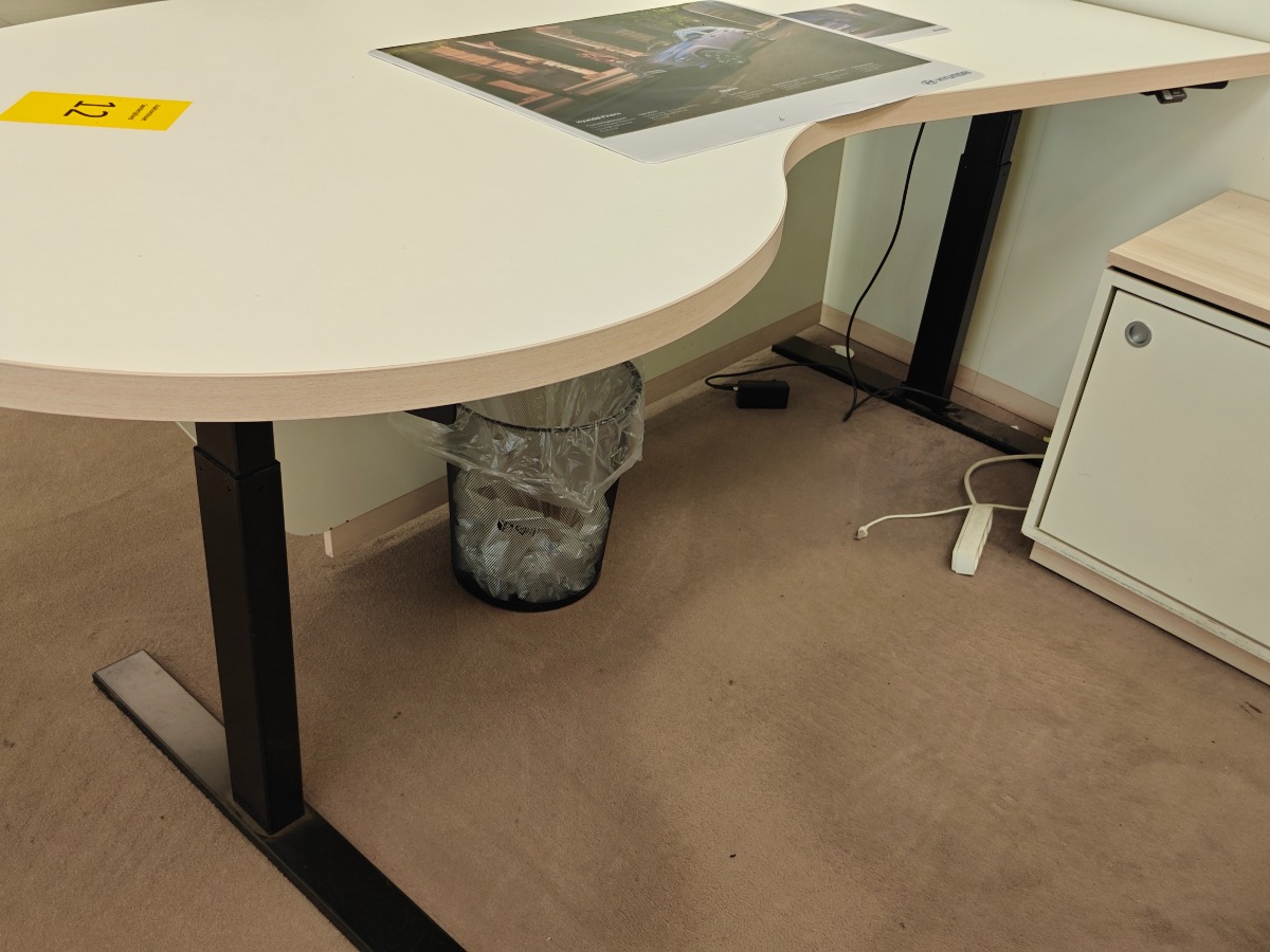 Flot buet elektrisk hæve/sænke skrivebord med lys træfarvet bordplade og en hvid frontpanel. Mål: L: 200 cm. Bue-bredde: 101 cm. Dertil hører lille kommode med skydelåger, som måler 84 x 45 x 56 cm. Derudover papir-skraldespand. Med enkelte brugsspor.