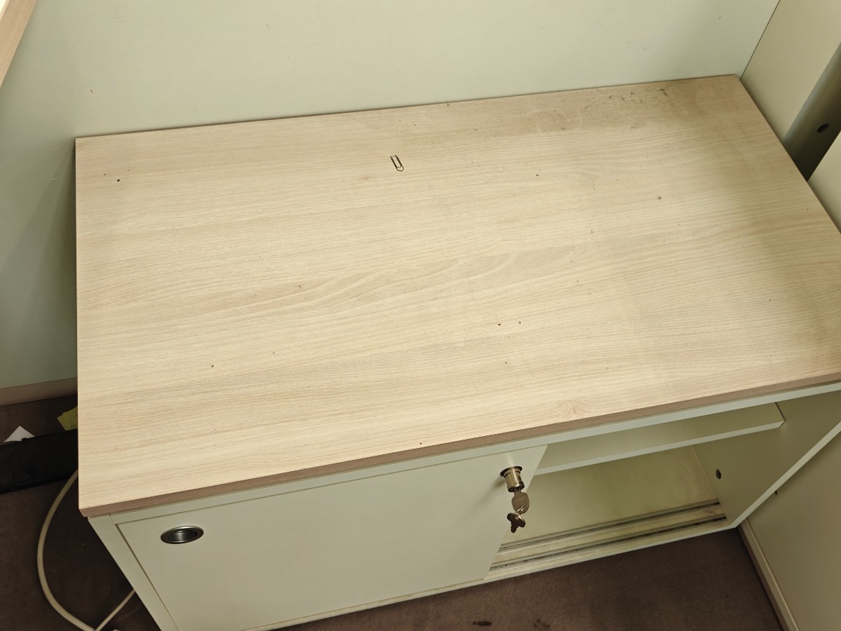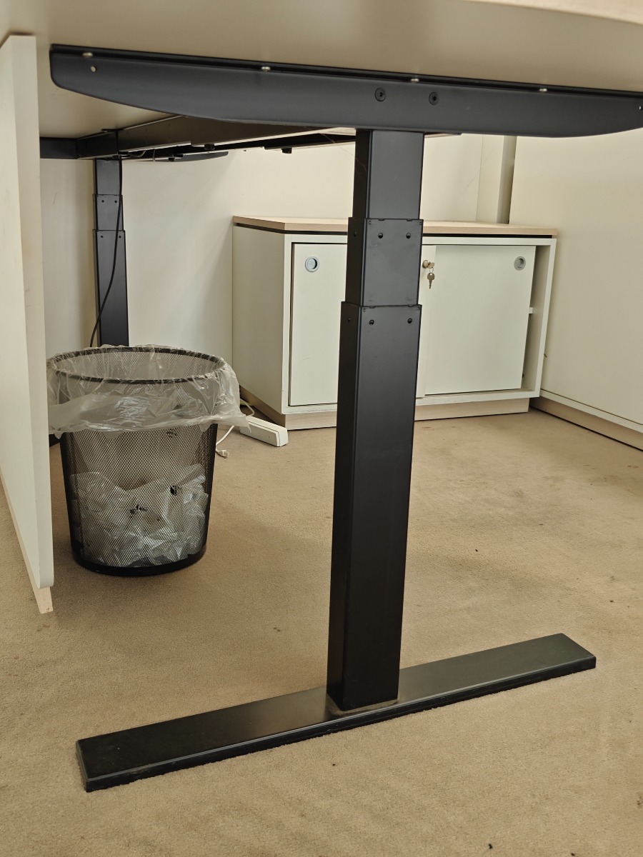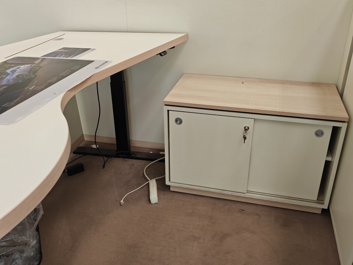 Flot buet elektrisk hæve/sænke skrivebord med lys træfarvet bordplade og en hvid frontpanel. Mål: L: 200 cm. Bue-bredde: 101 cm. Dertil hører lille kommode med skydelåger, som måler 84 x 45 x 56 cm. Derudover papir-skraldespand. Med enkelte brugsspor.