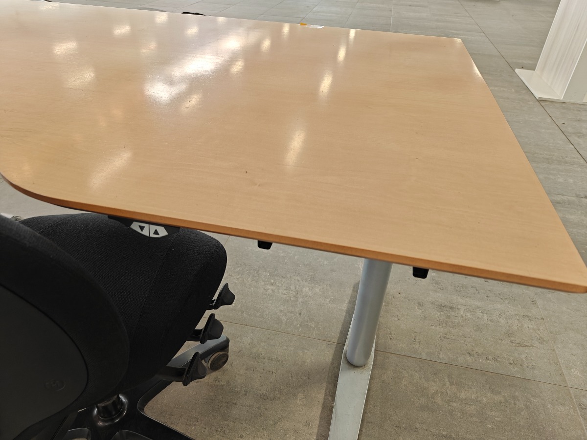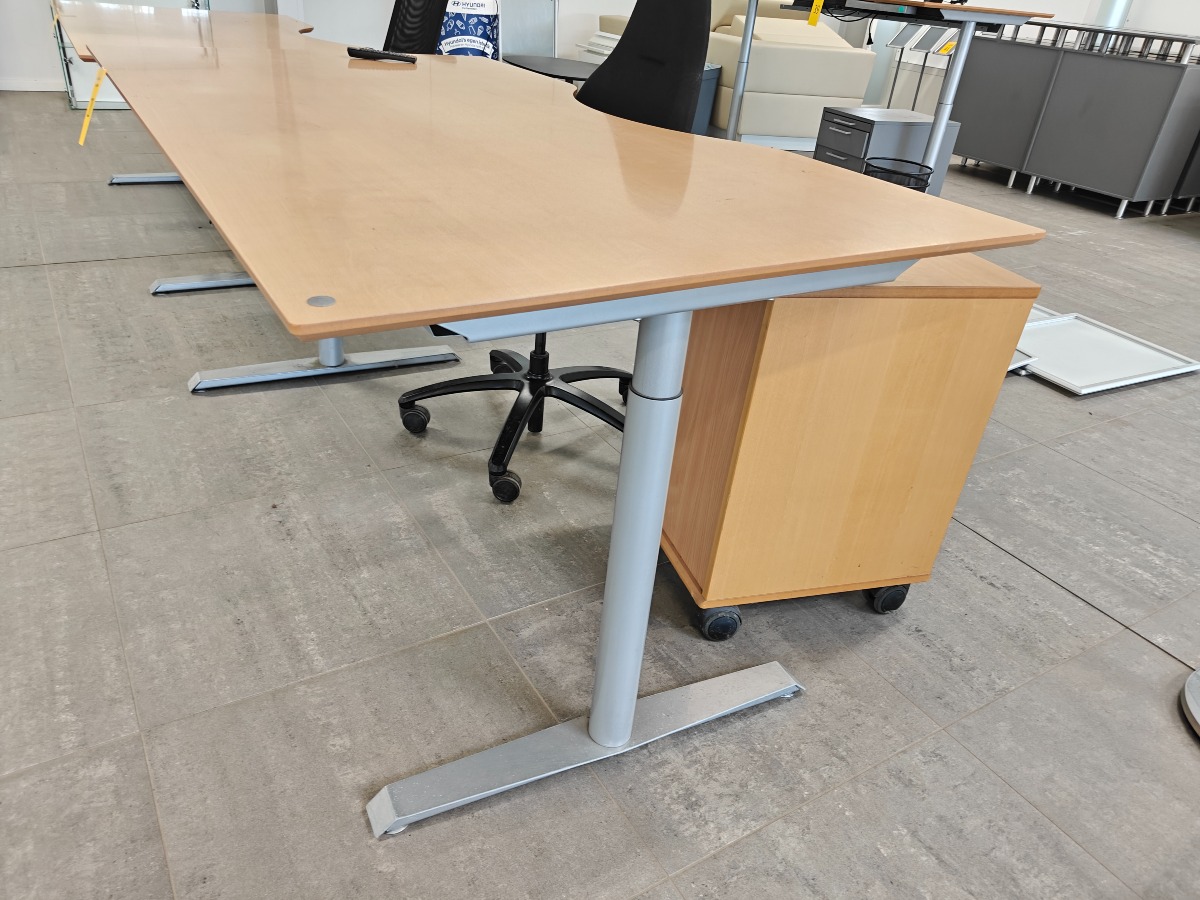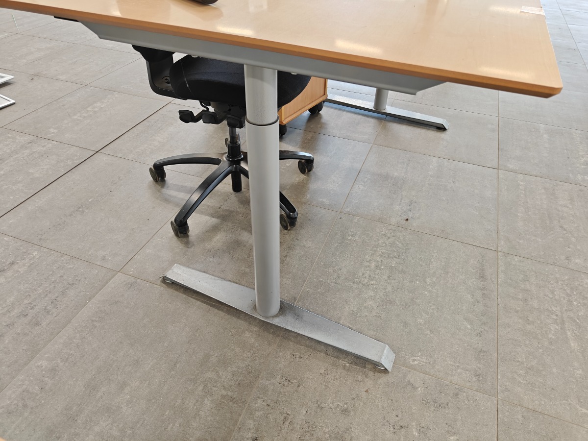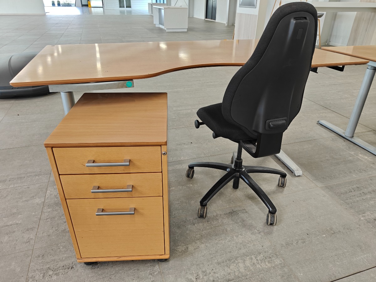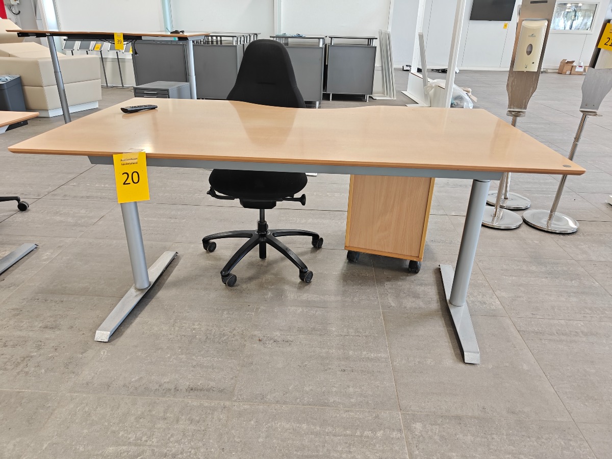 Elektrisk hæve/sænke skrivebord med træ bordplade og stålben. Mål: L: 180 cm. B: 100 cm. Dertil hører rulleskuffe med 3 skuffer, samt RH sort kontorstol. Med diverse brugsspor.