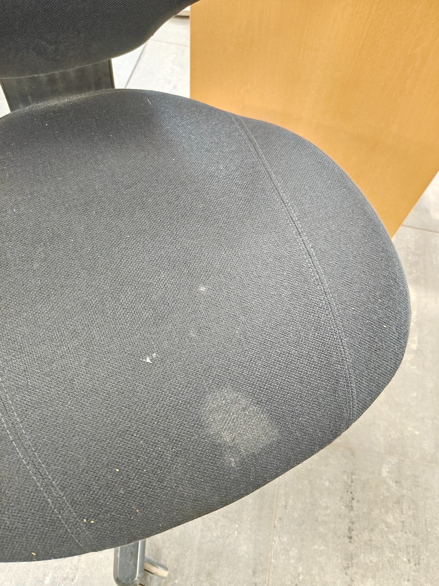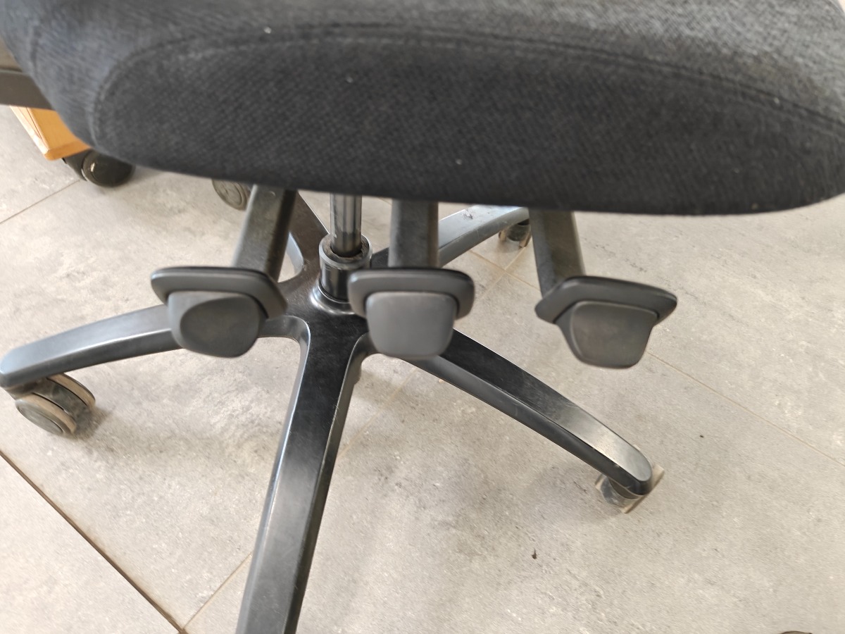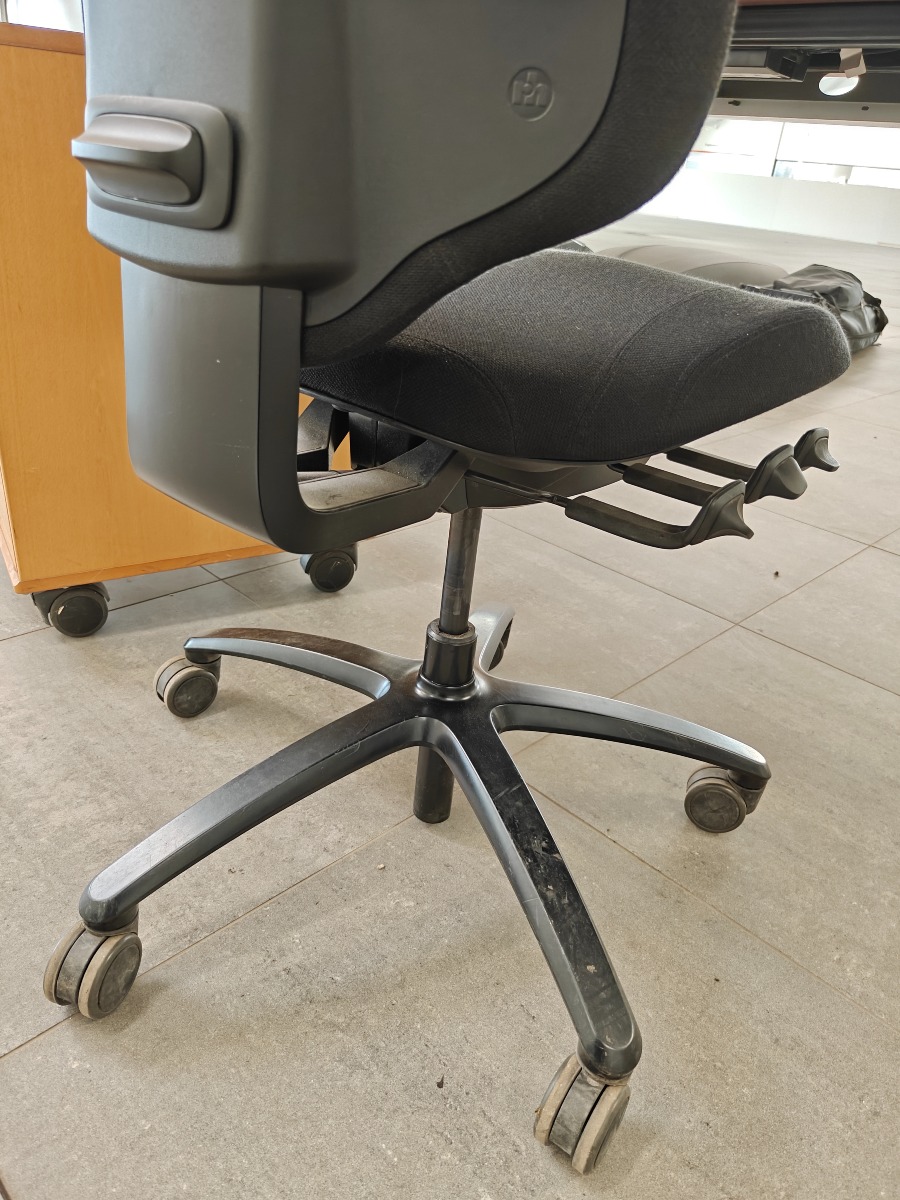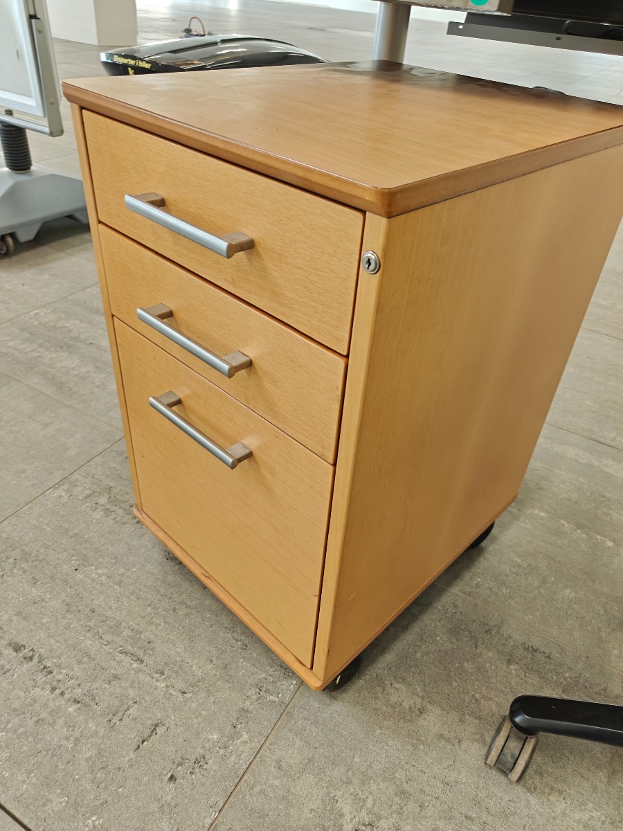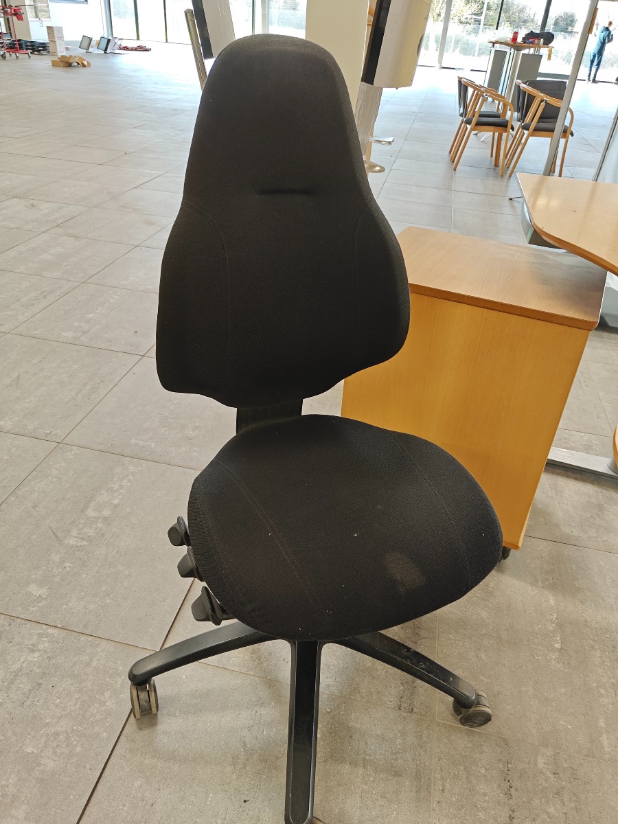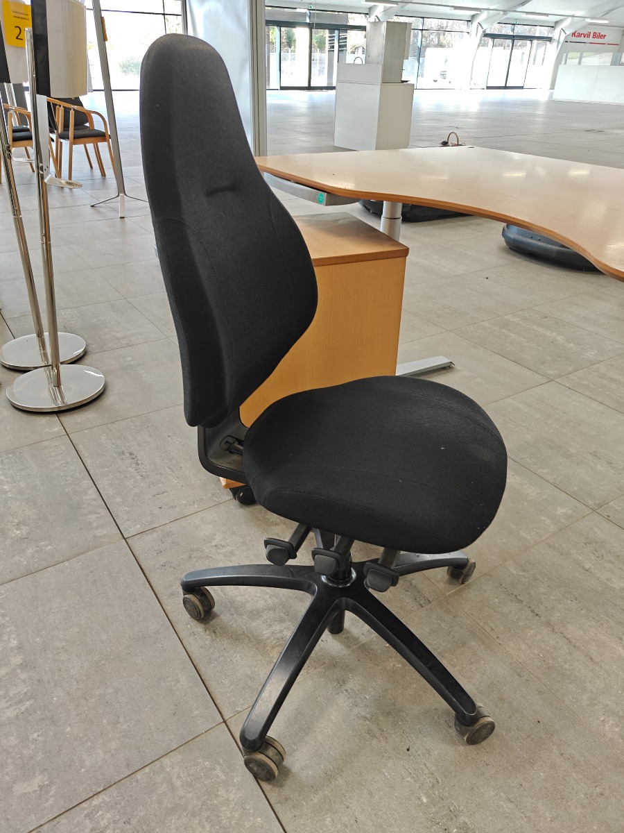 Elektrisk hæve/sænke skrivebord med træ bordplade og stålben. Mål: L: 180 cm. B: 100 cm. Dertil hører rulleskuffe med 3 skuffer, samt RH sort kontorstol. Med diverse brugsspor.