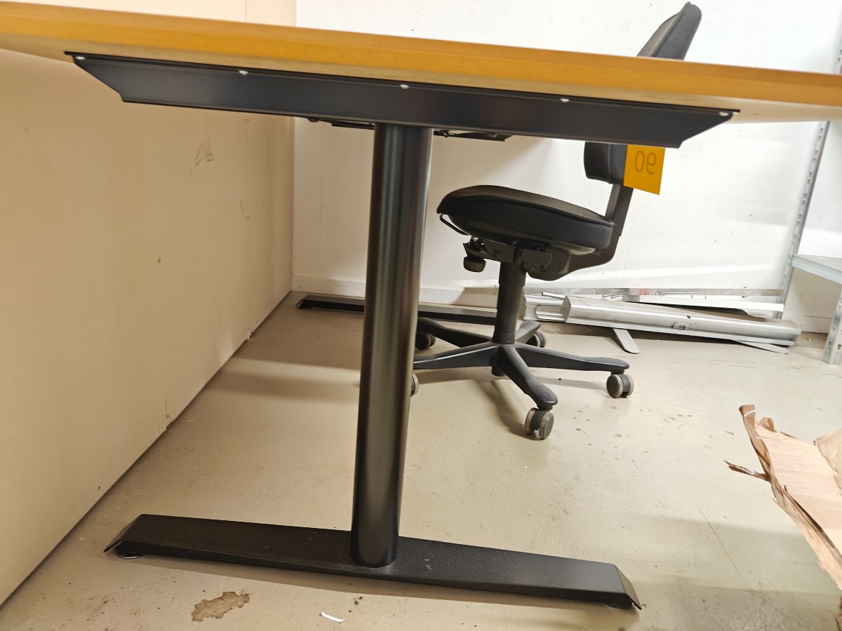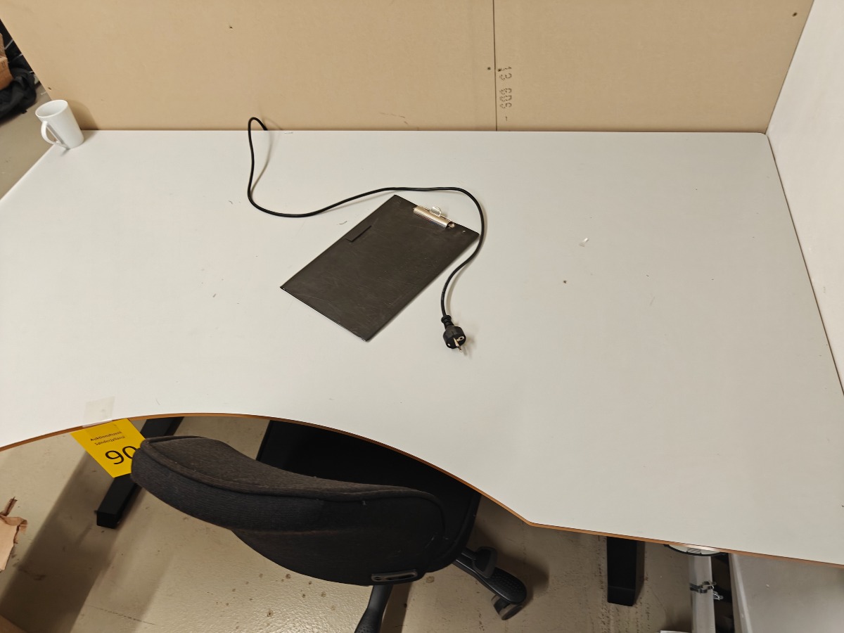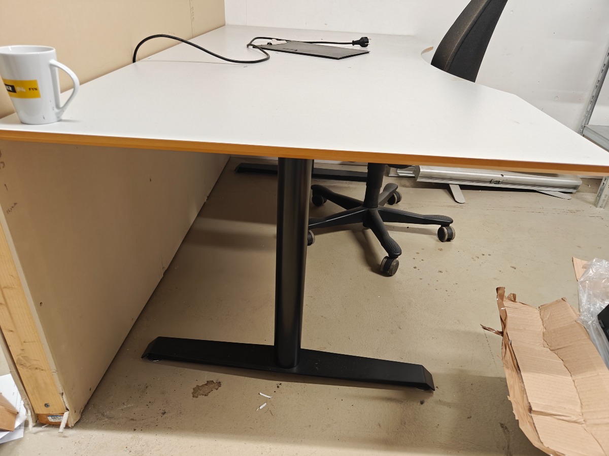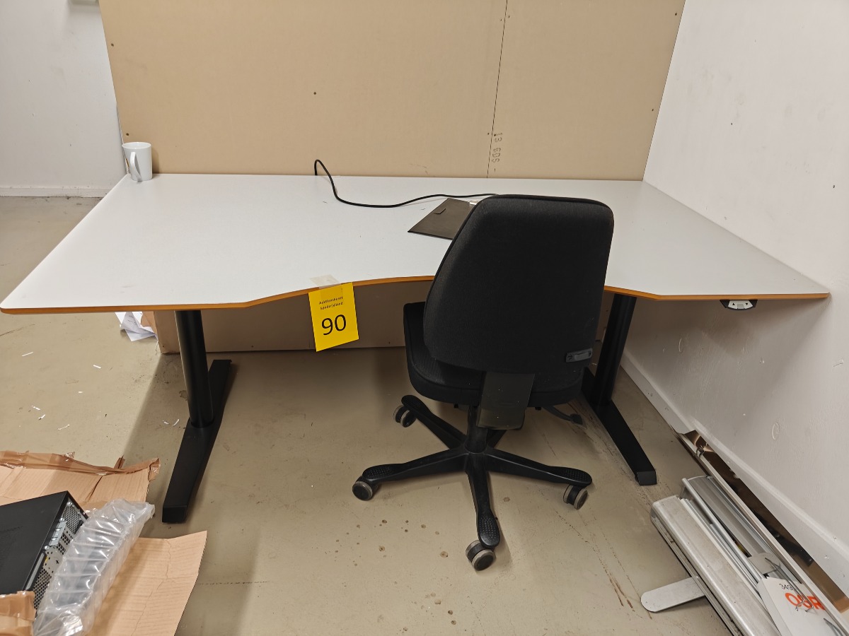 Elektrisk hæve/sænke skrivebord med hvid bordplade og sorte ben. Dertil sort kontorstol. Med diverse brugsspor.