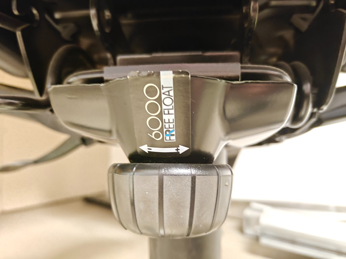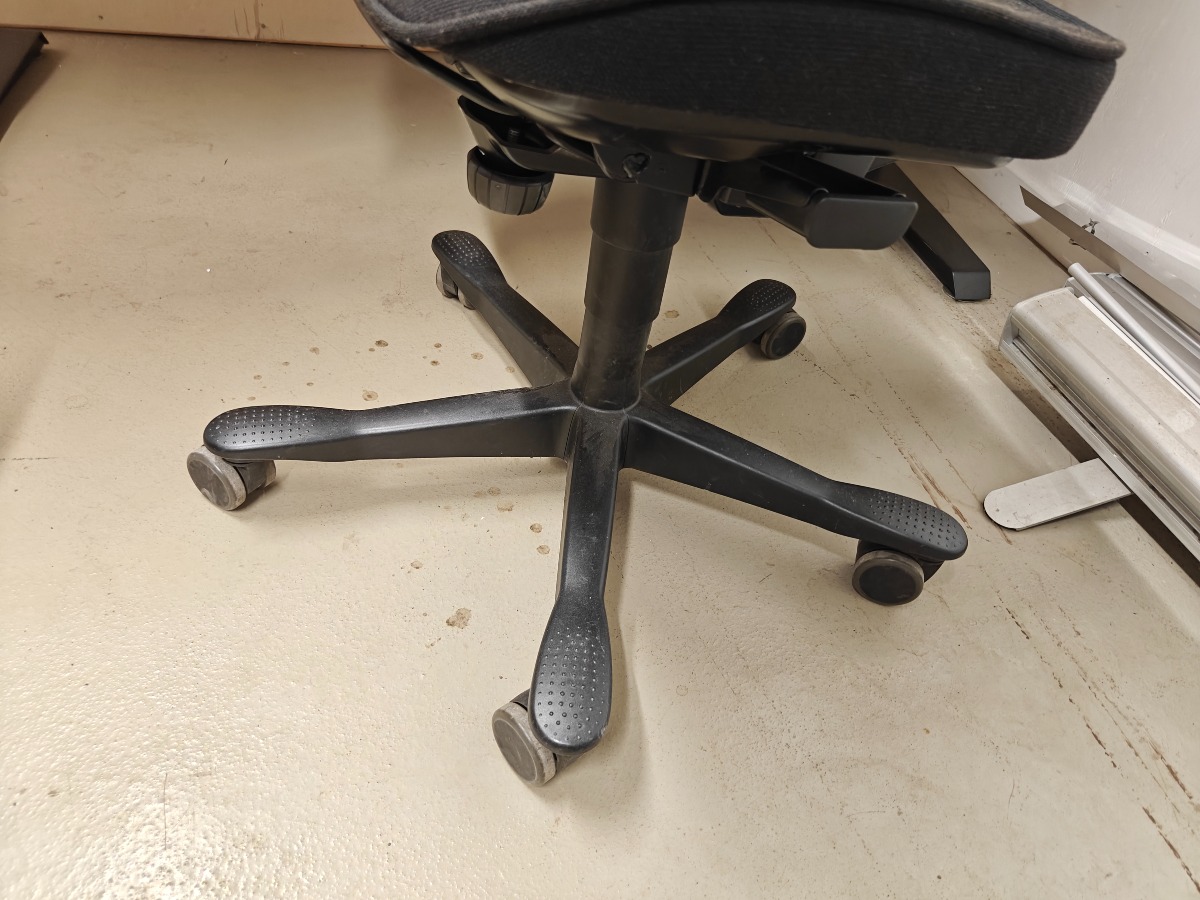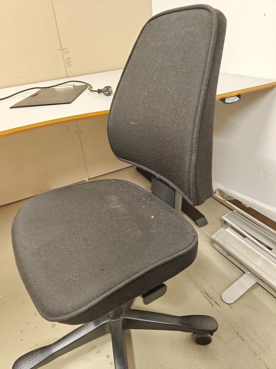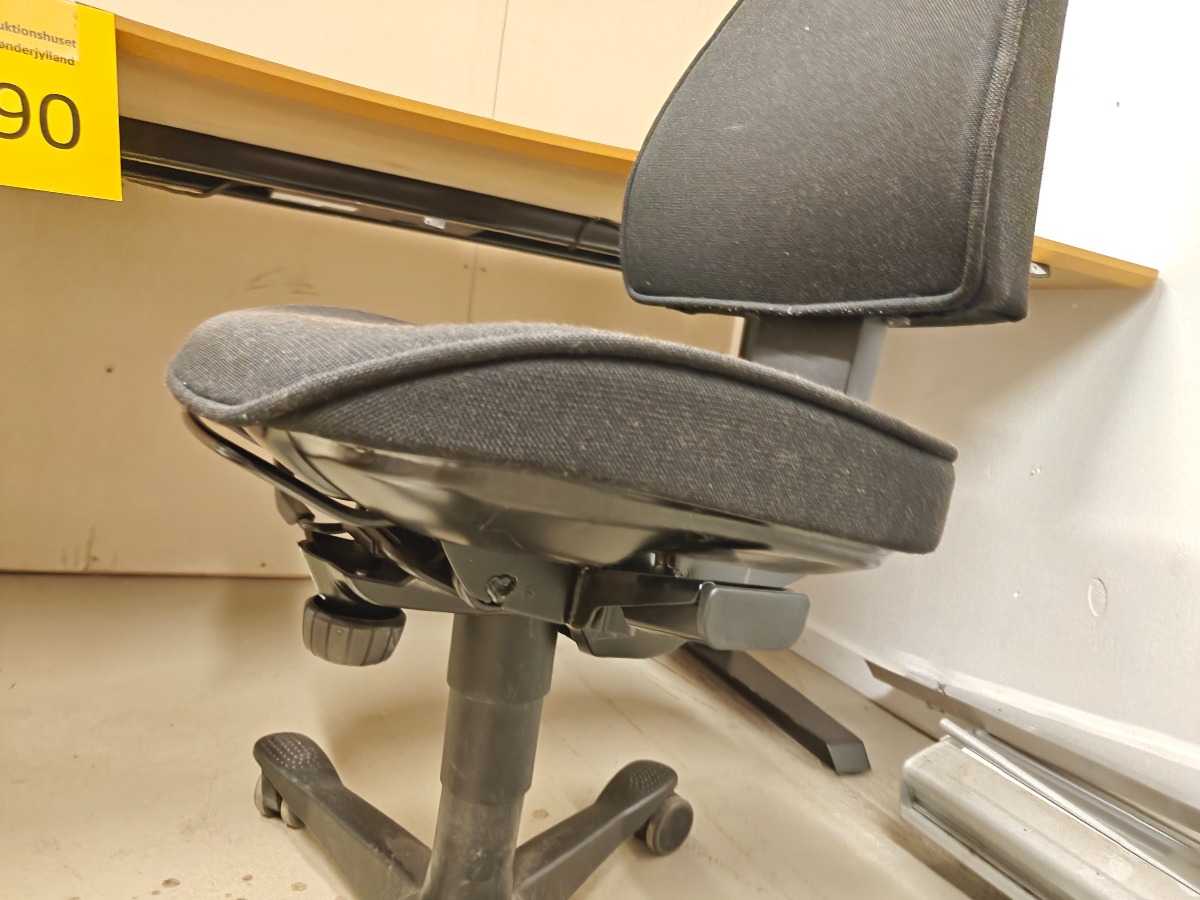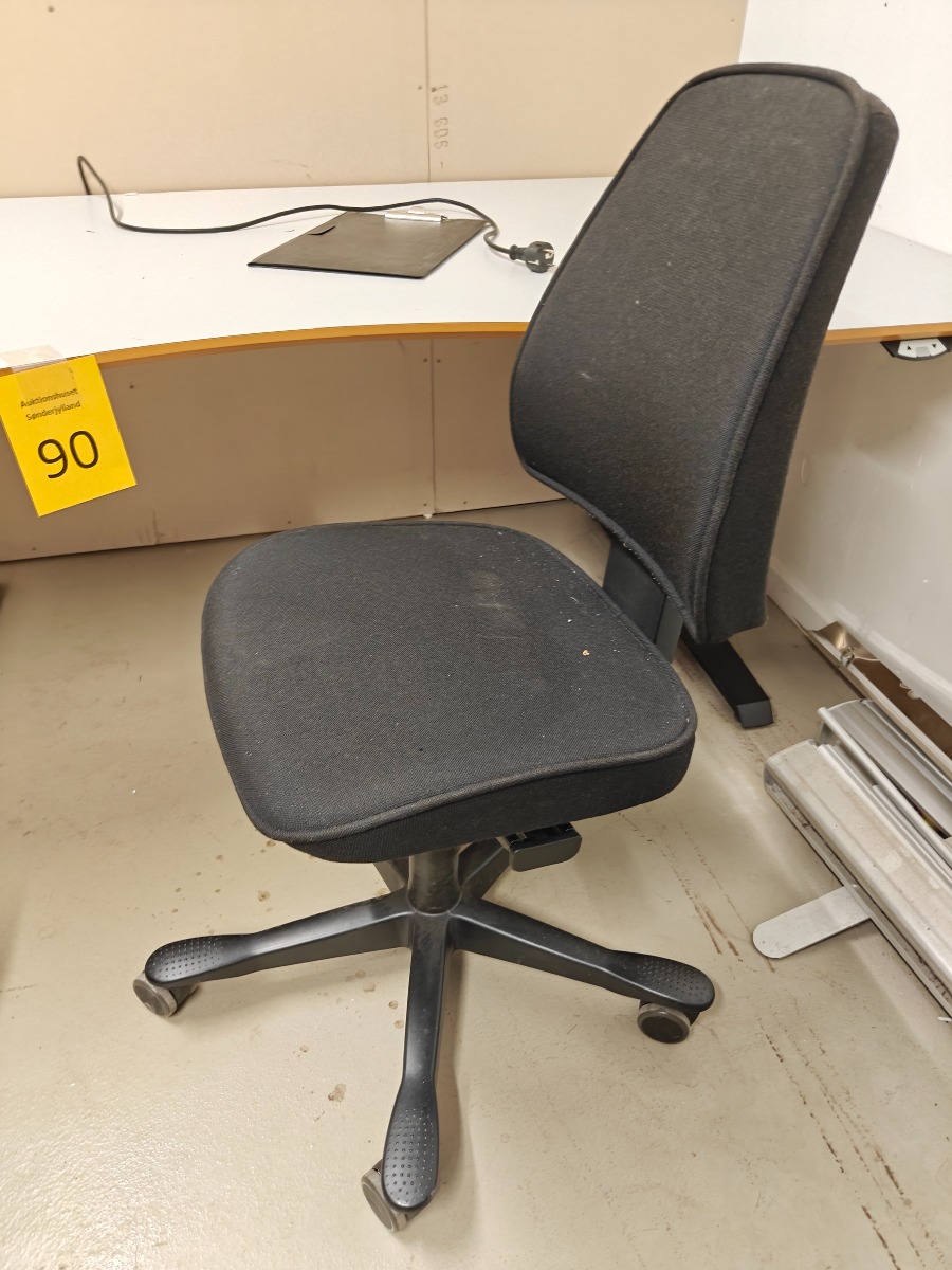 Elektrisk hæve/sænke skrivebord med hvid bordplade og sorte ben. Dertil sort kontorstol. Med diverse brugsspor.