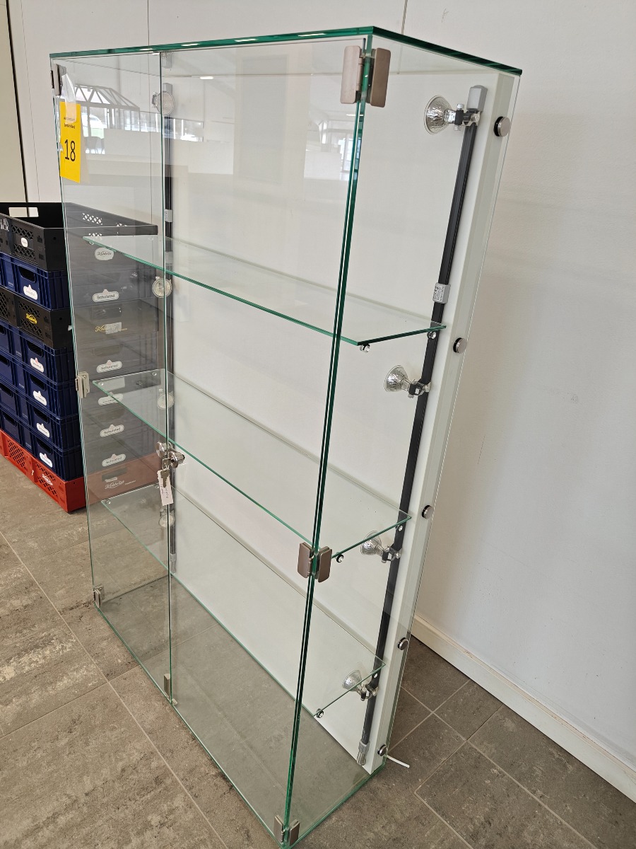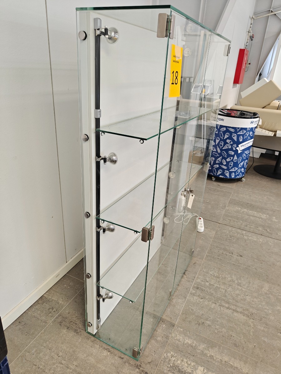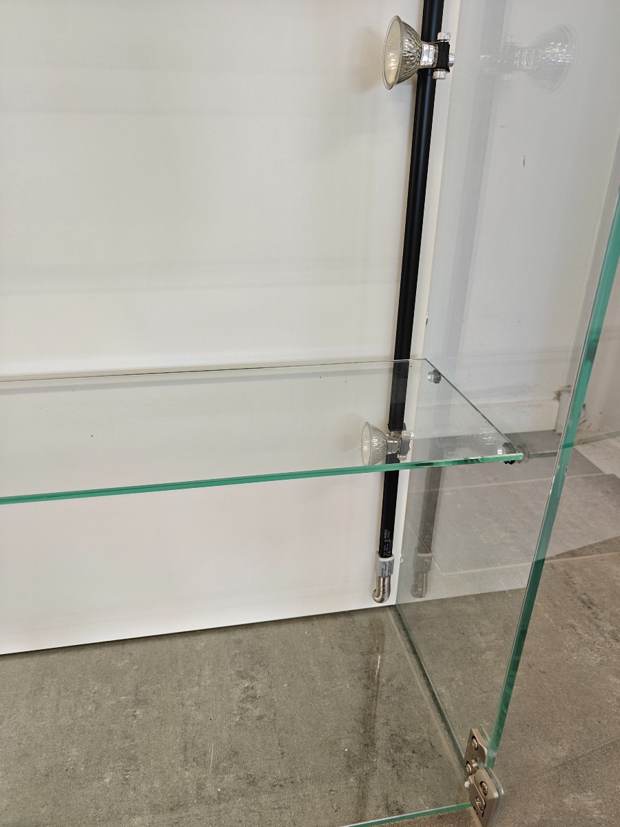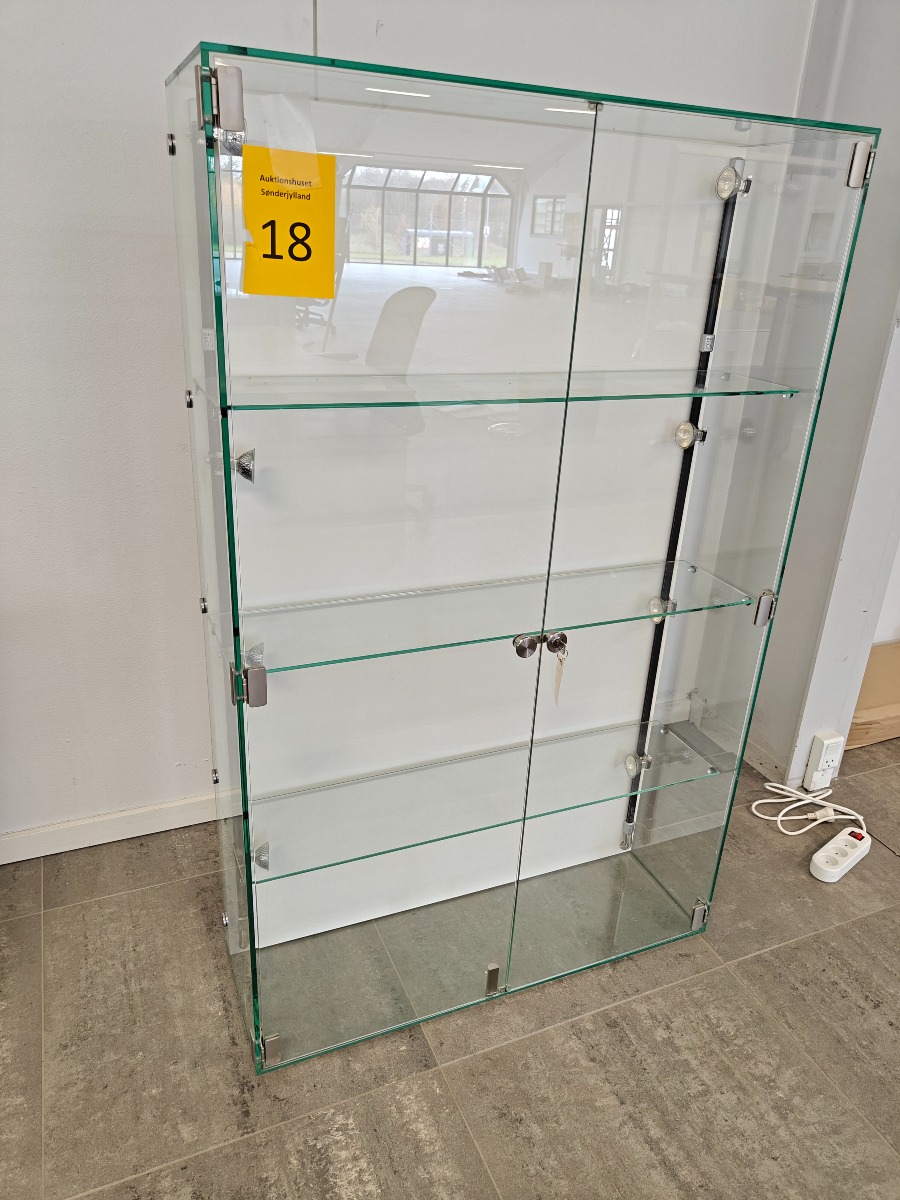Glas udstillingsmontre med lys, samt lås og nøgle. Med 3 hylder. Kan hænges op. Med alm. brugsspor.