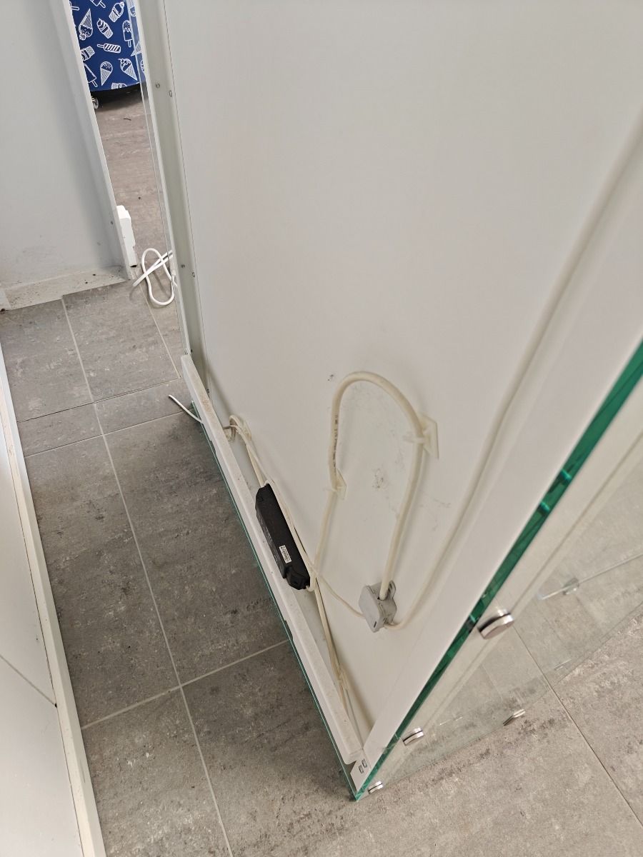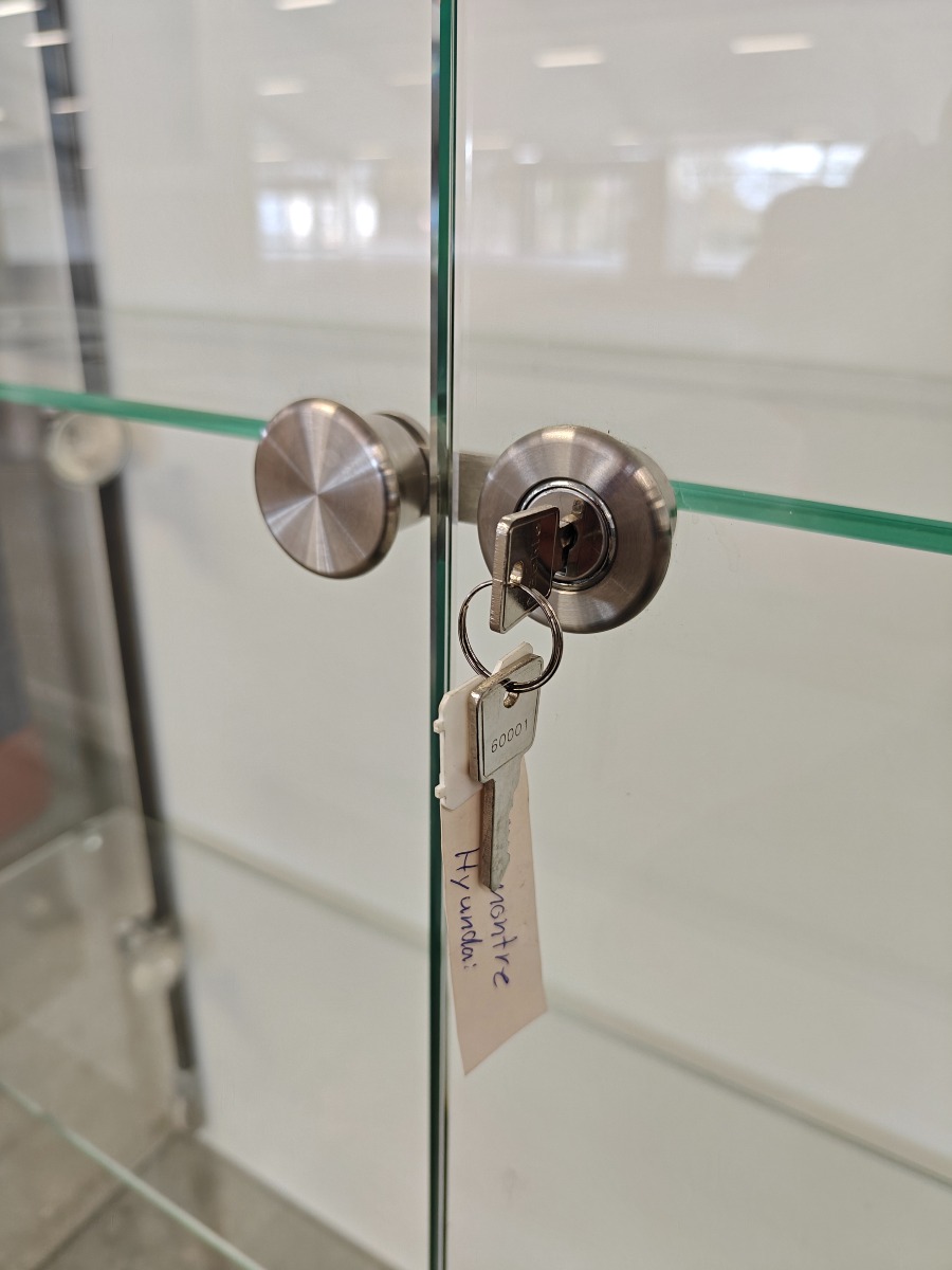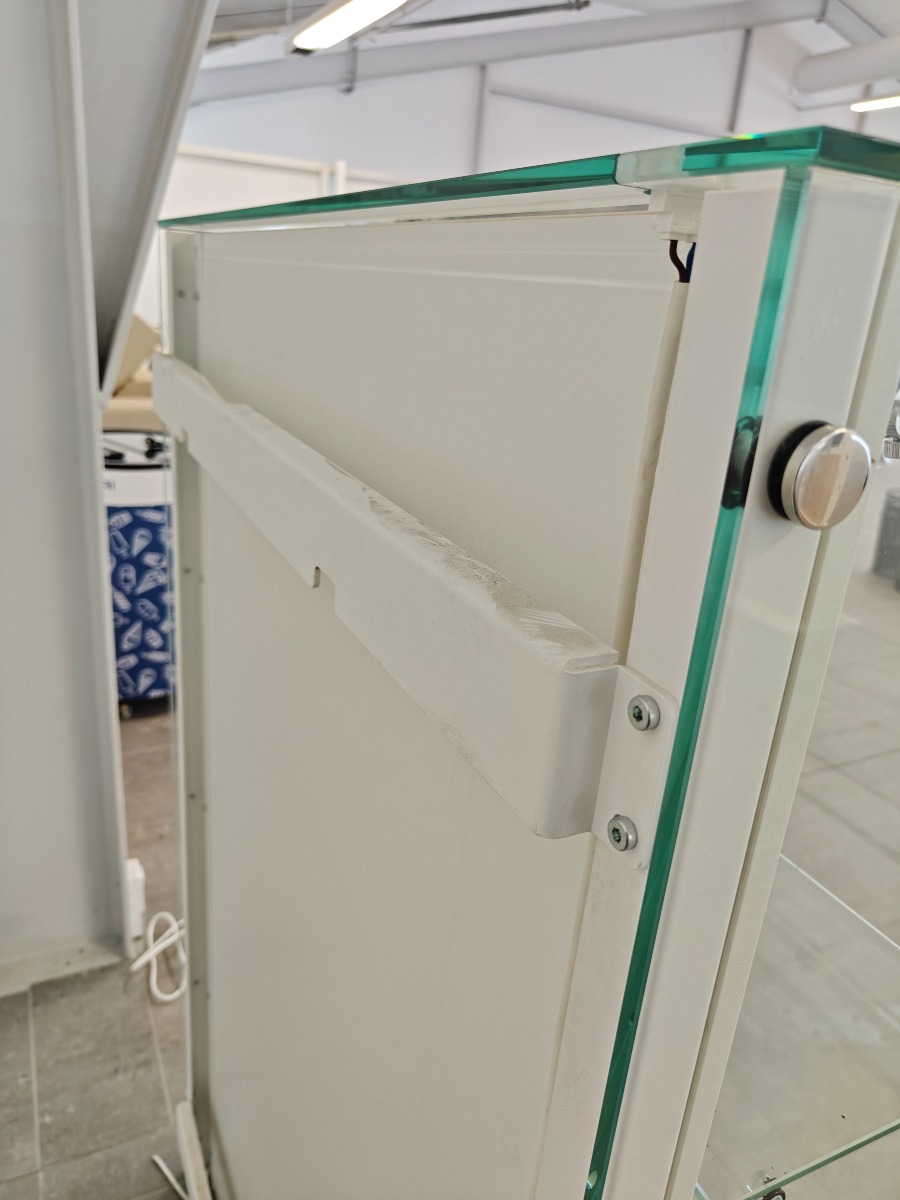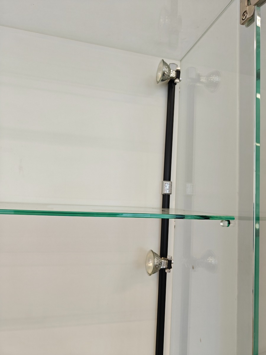 Glas udstillingsmontre med lys, samt lås og nøgle. Med 3 hylder. Kan hænges op. Med alm. brugsspor.