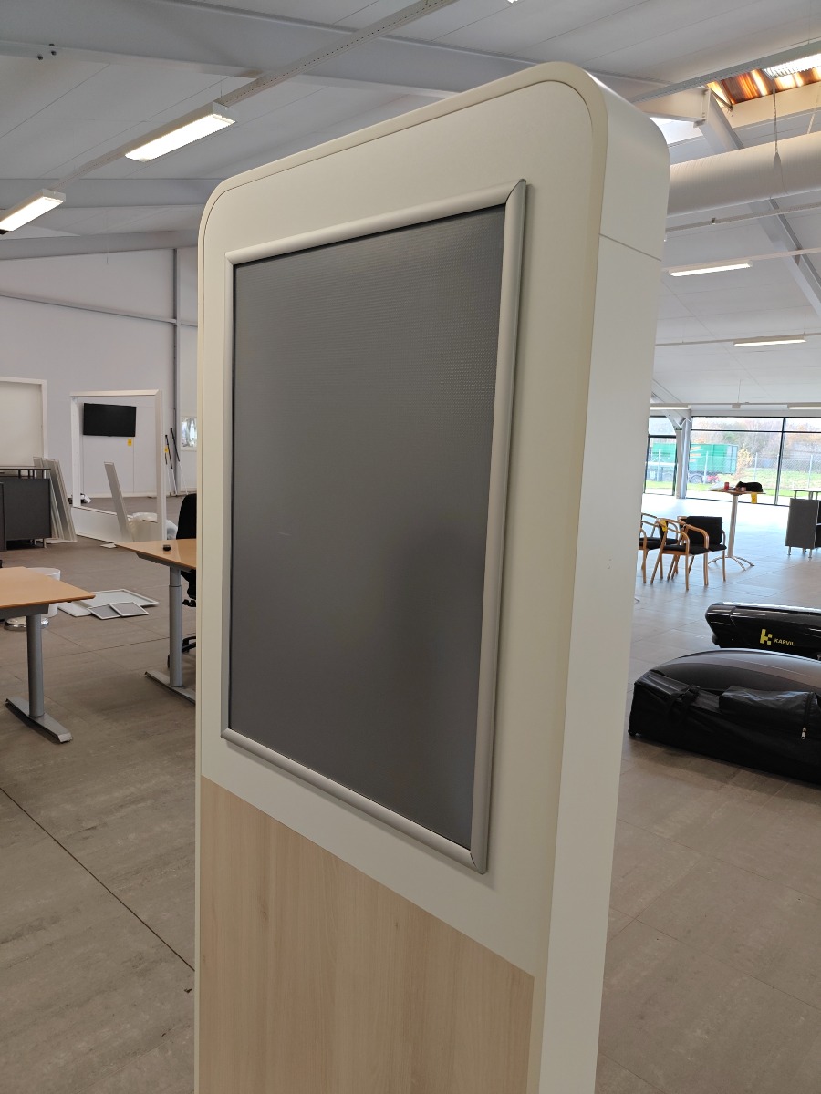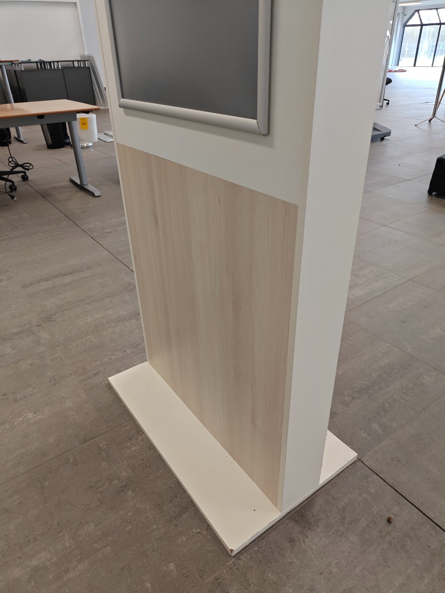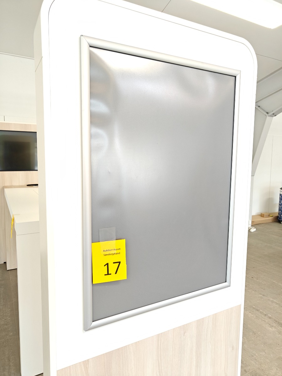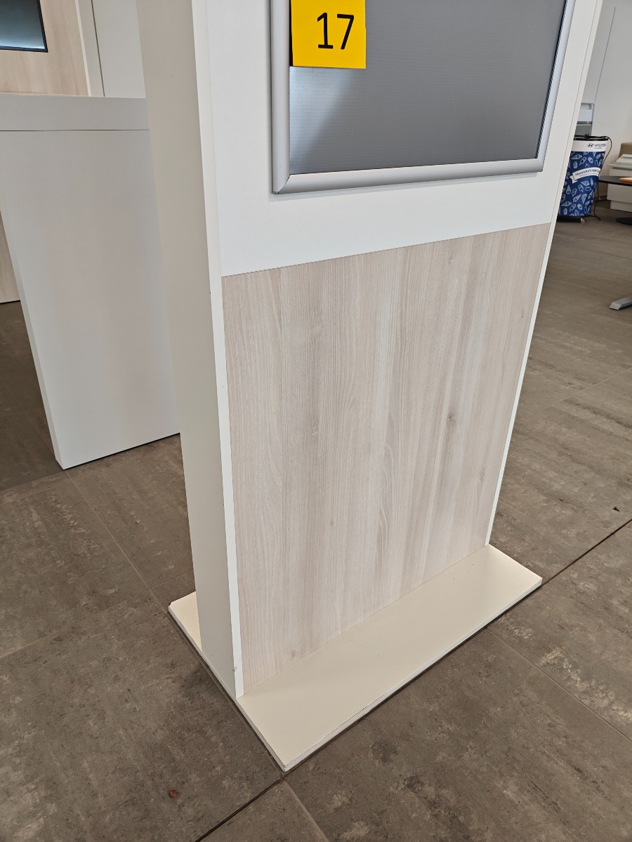 Infostander med klik-rammer på begge sider. Standeren måler B: 81 cm. D: 15,5 cm. Fodbredde: 50 cm. H: 198 cm. Brugt og med alm. brugsspor.
