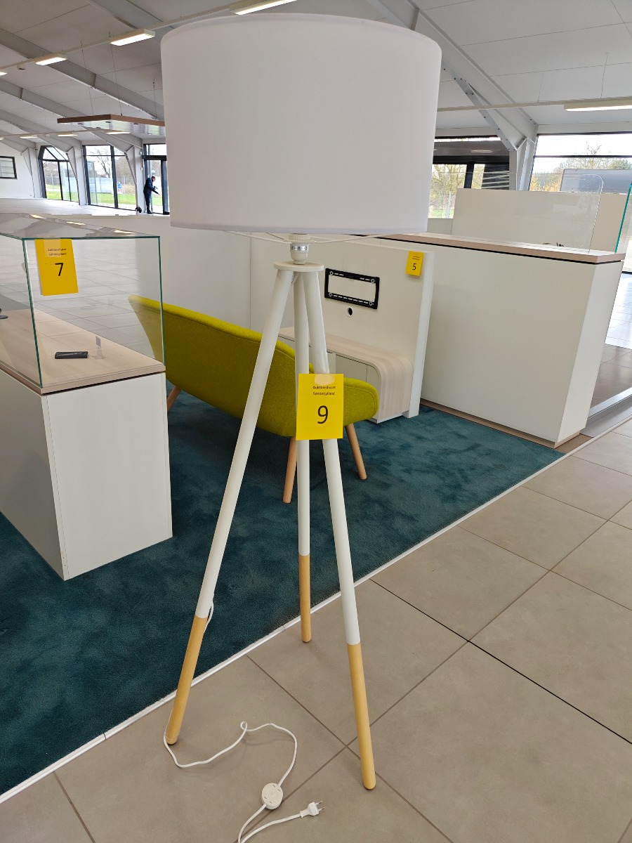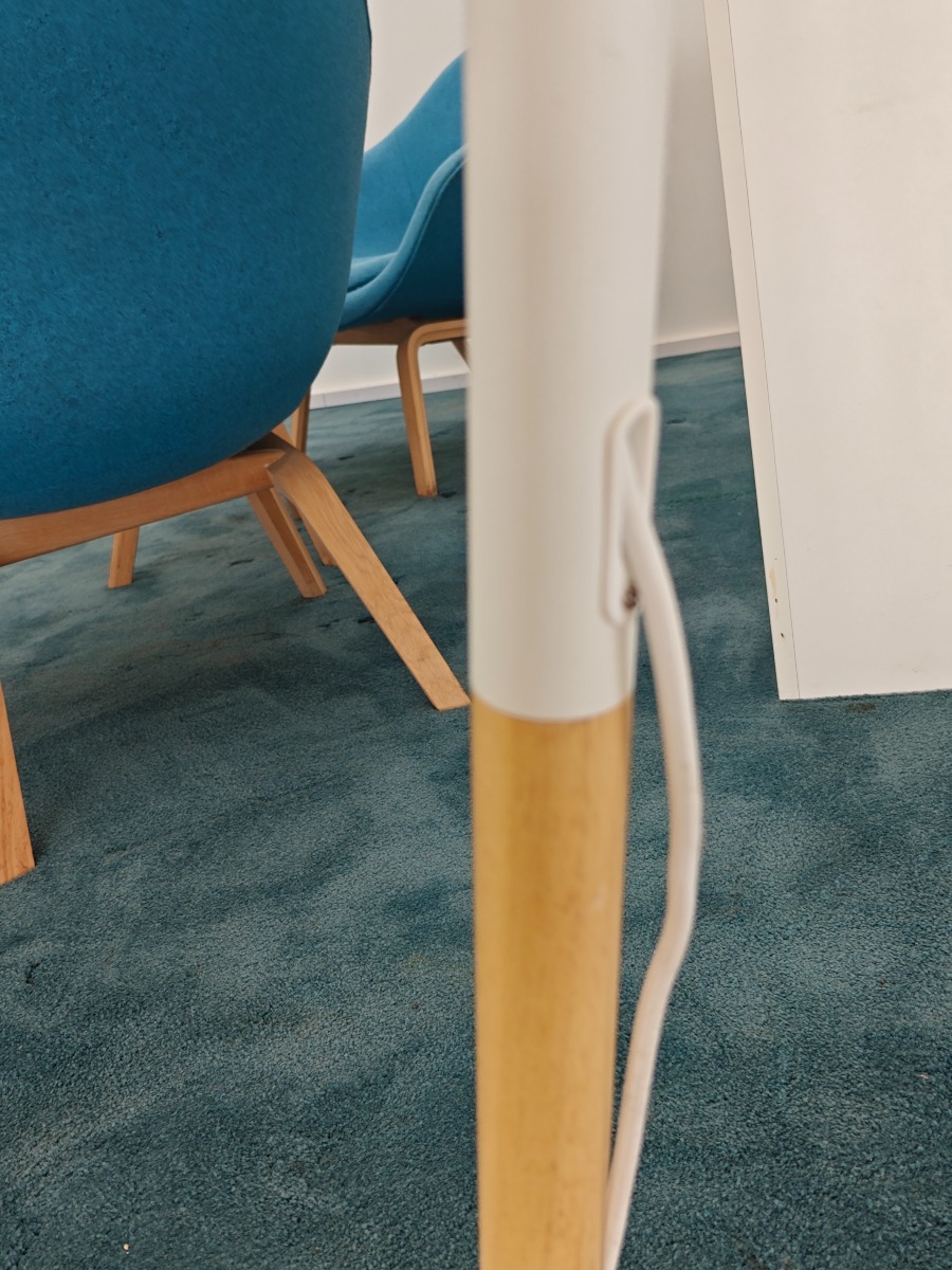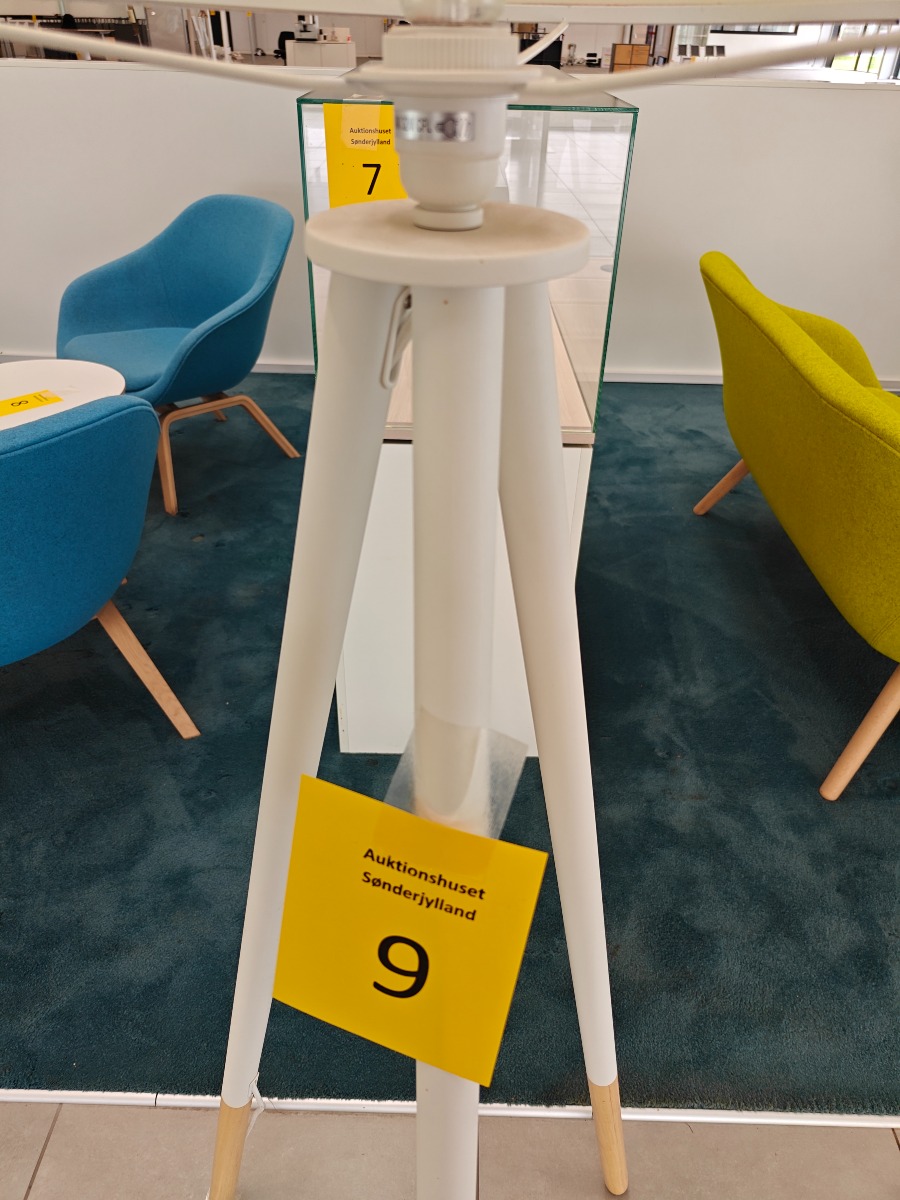 Pip gulvlampe med hvide ben med trædetalje nederst, samt hvid skærm. Den måler 155 cm høj og 70 cm lang. E27-fatning. Trænger lige til en klud. Med alm. brugsspor.