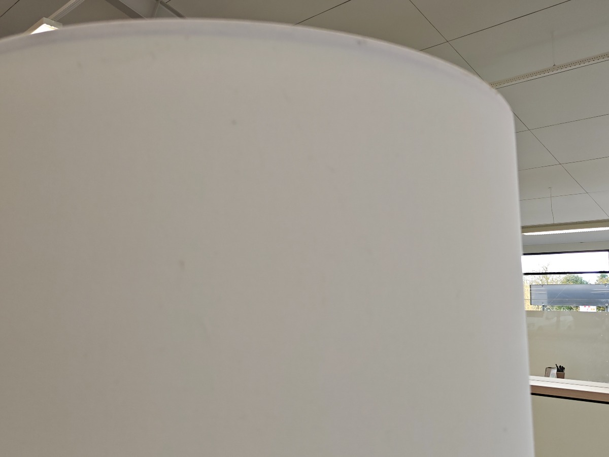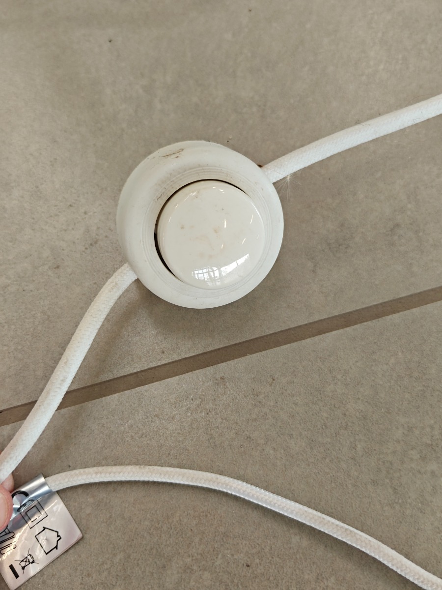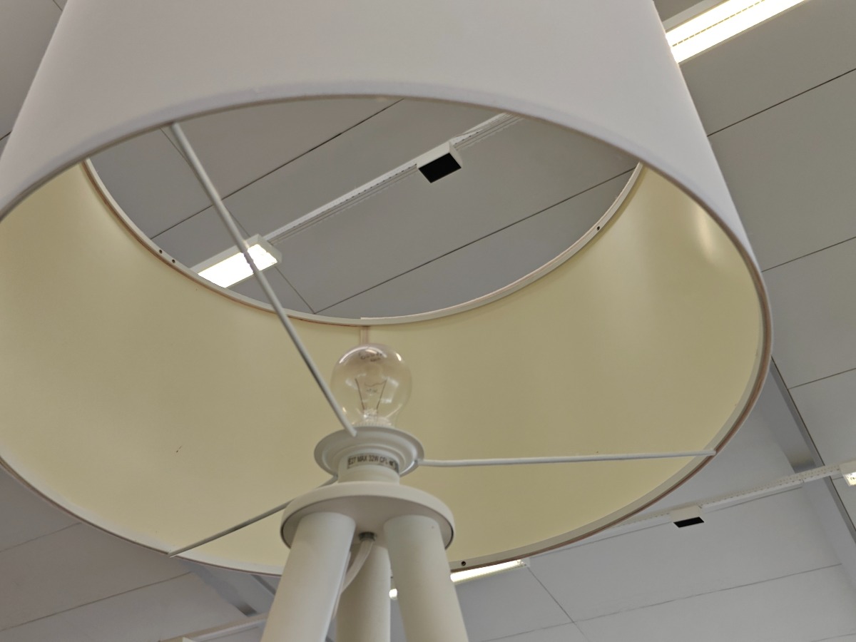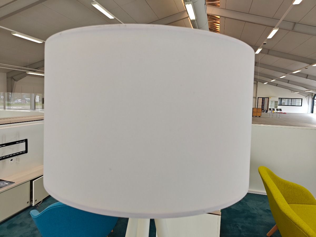 Pip gulvlampe med hvide ben med trædetalje nederst, samt hvid skærm. Den måler 155 cm høj og 70 cm lang. E27-fatning. Trænger lige til en klud. Med alm. brugsspor.