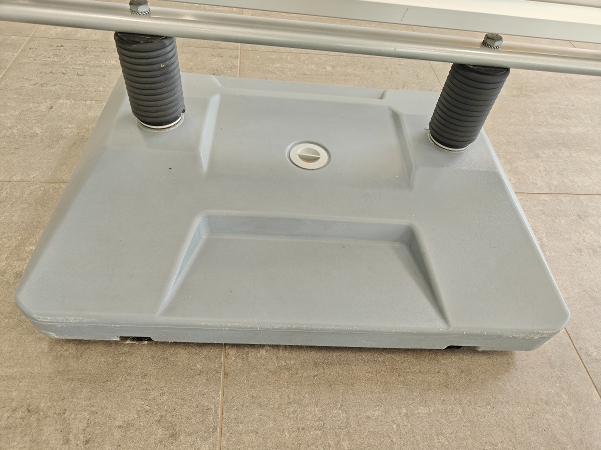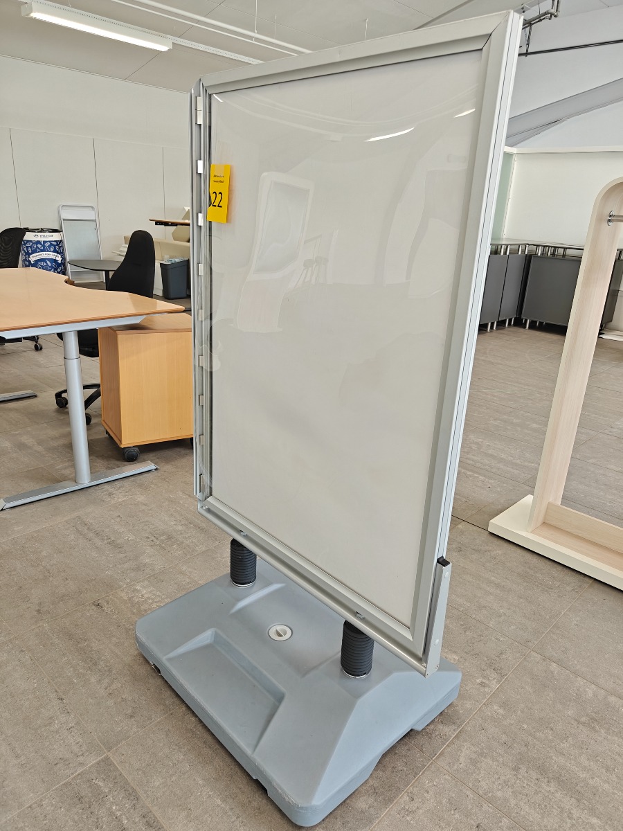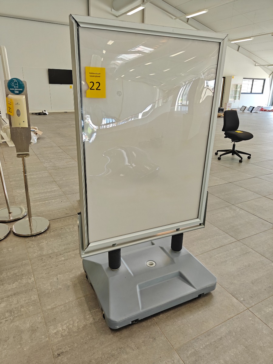Reklameskilt / gadeskilt på hjul. Den mangler en skinne i den ene side og er en smule i stykker i toppen. Mål: 92 x 168 cm. Brugt og med brugsspor.
