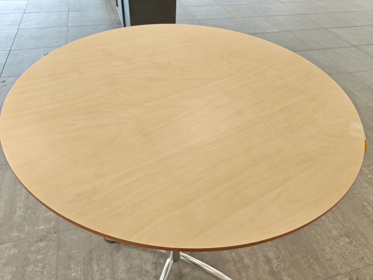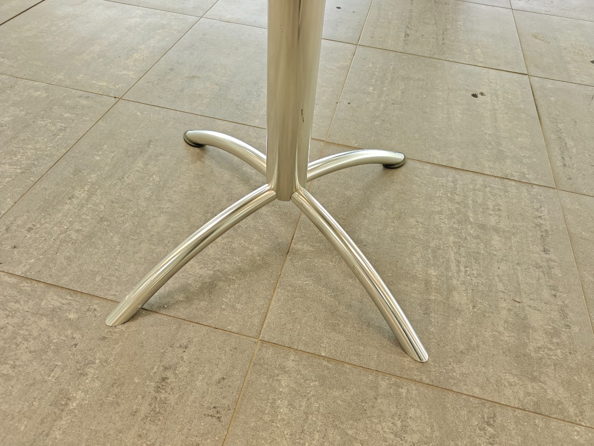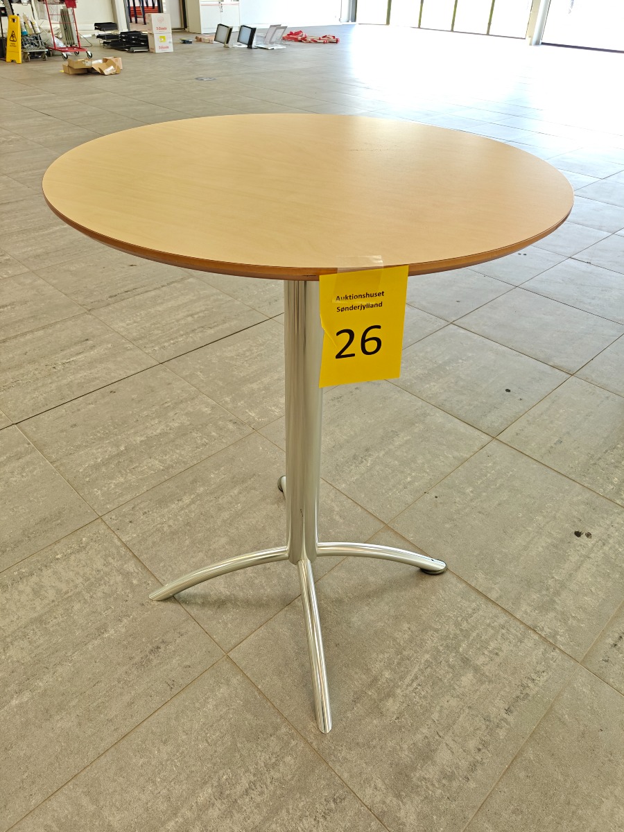 Ståbord som måler H: 107 cm, Ø: 80 cm. Med stålben. Med alm. bruggspor.