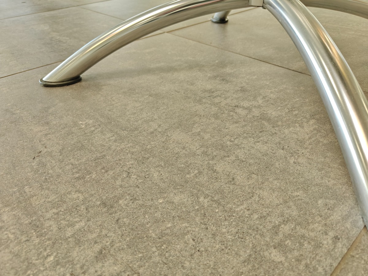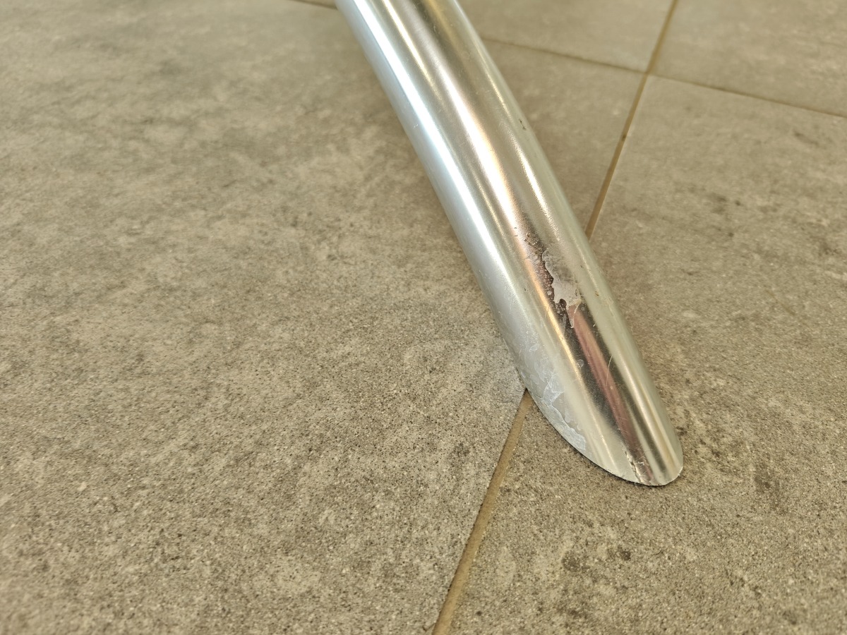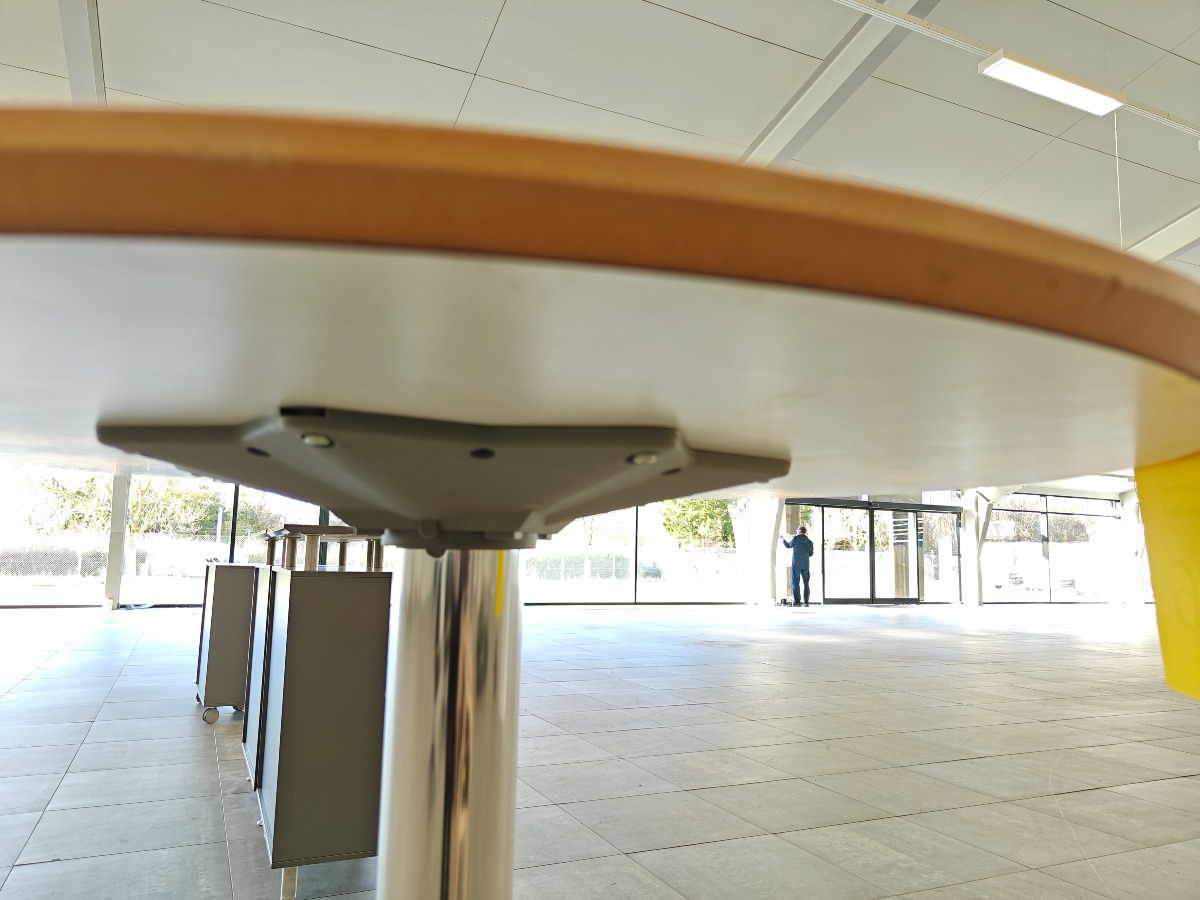 Ståbord som måler H: 107 cm, Ø: 80 cm. Med stålben. Med alm. bruggspor.