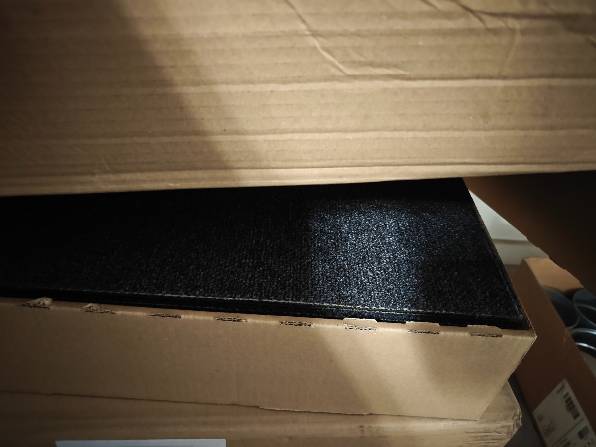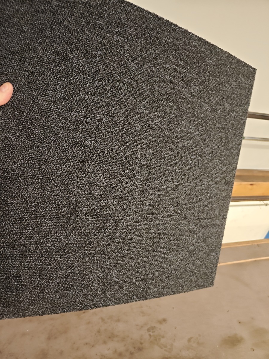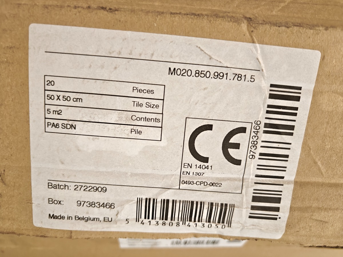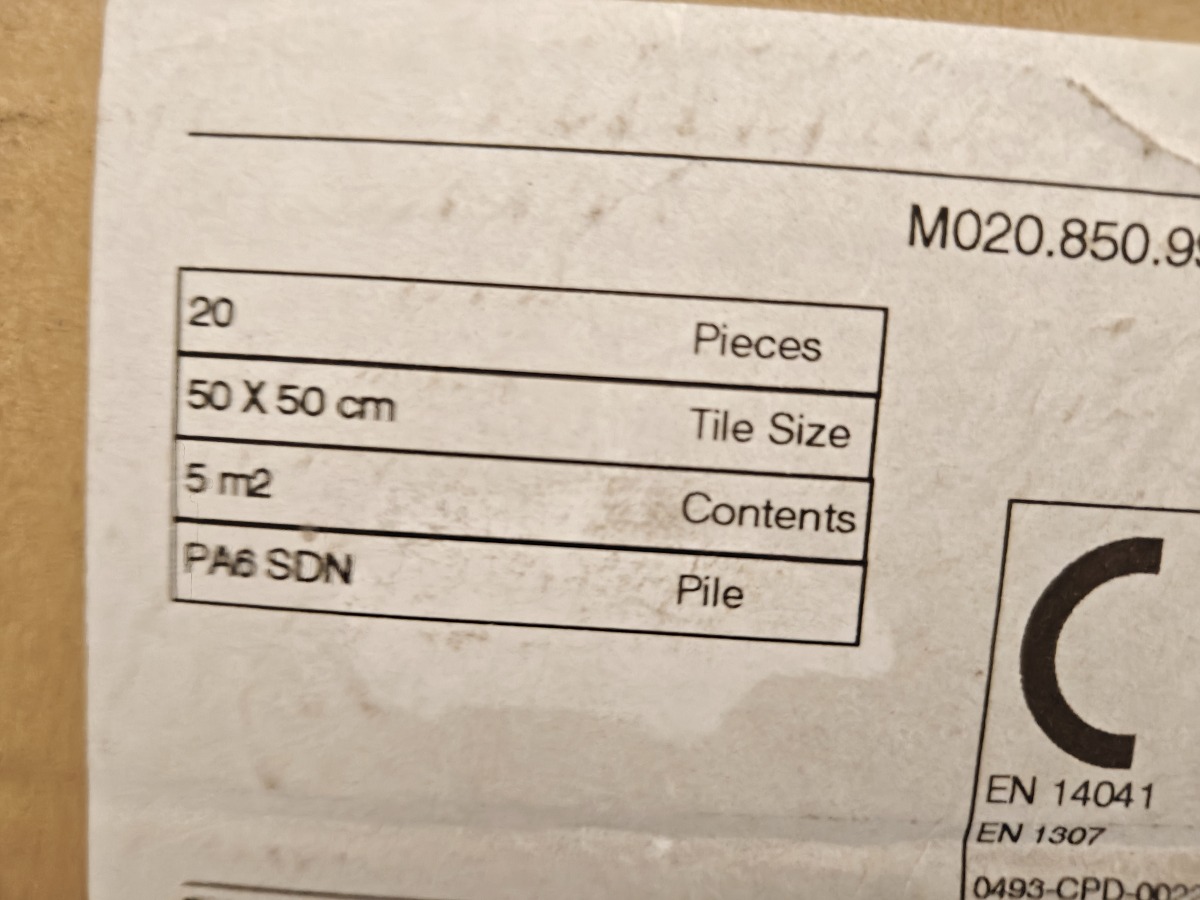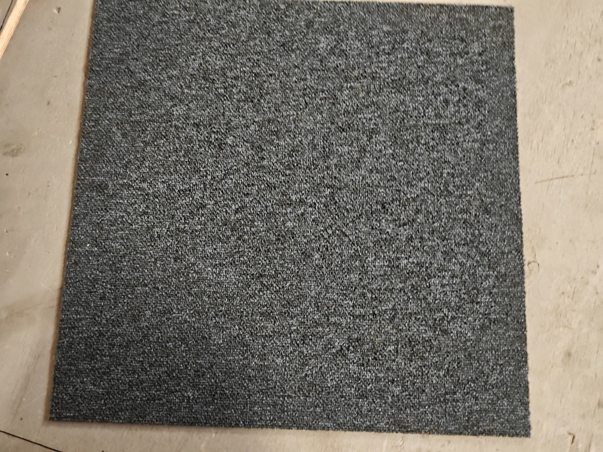 4 kasser tæppefliser med 20 stk. i hver. De måler 50 x 50 cm. Der er til 20m2. Ubrugte.