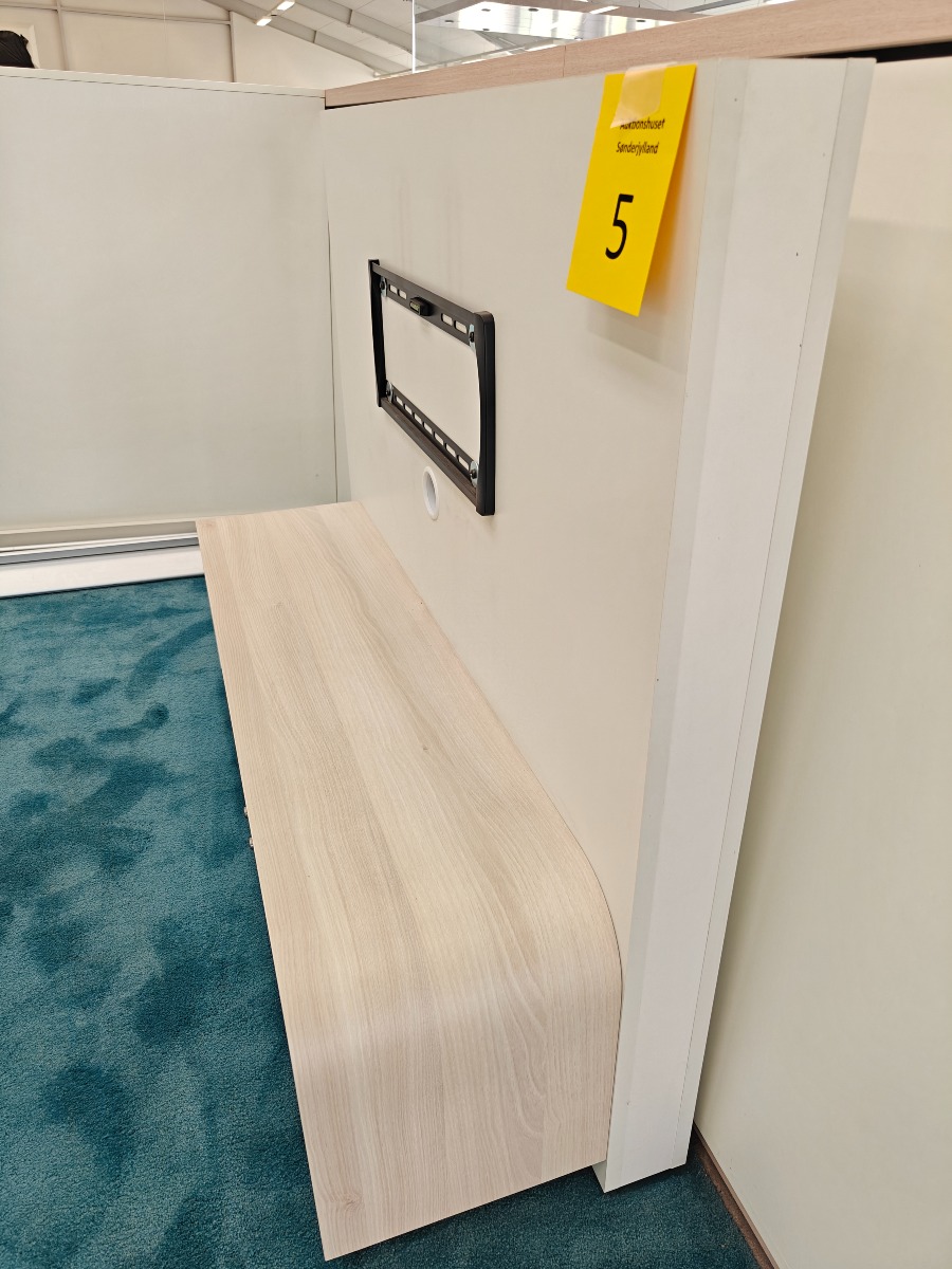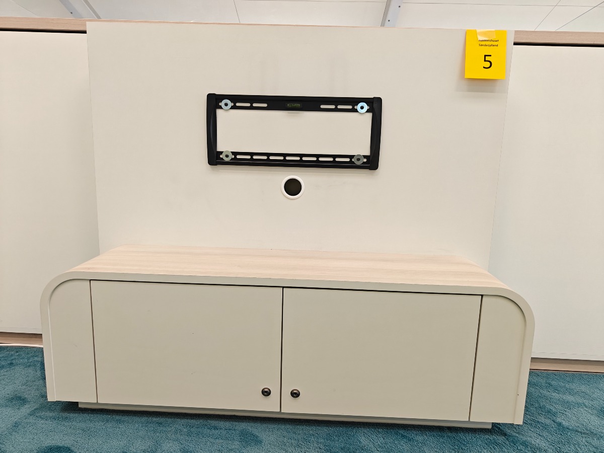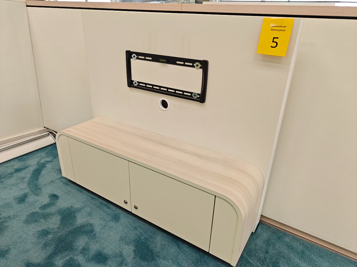 Møbel til TV - med buet TV-bord i lys træfarve og 2 stk. låger - denne sidder på en hvid bagvæg, hvorpå der kan monteres TV. Selve bagvæggen måler B: 120 cm. D: 10 cm. Kommoden måler L: 120 x D: 40 x H: 41 cm. Med alm. brugsspor.