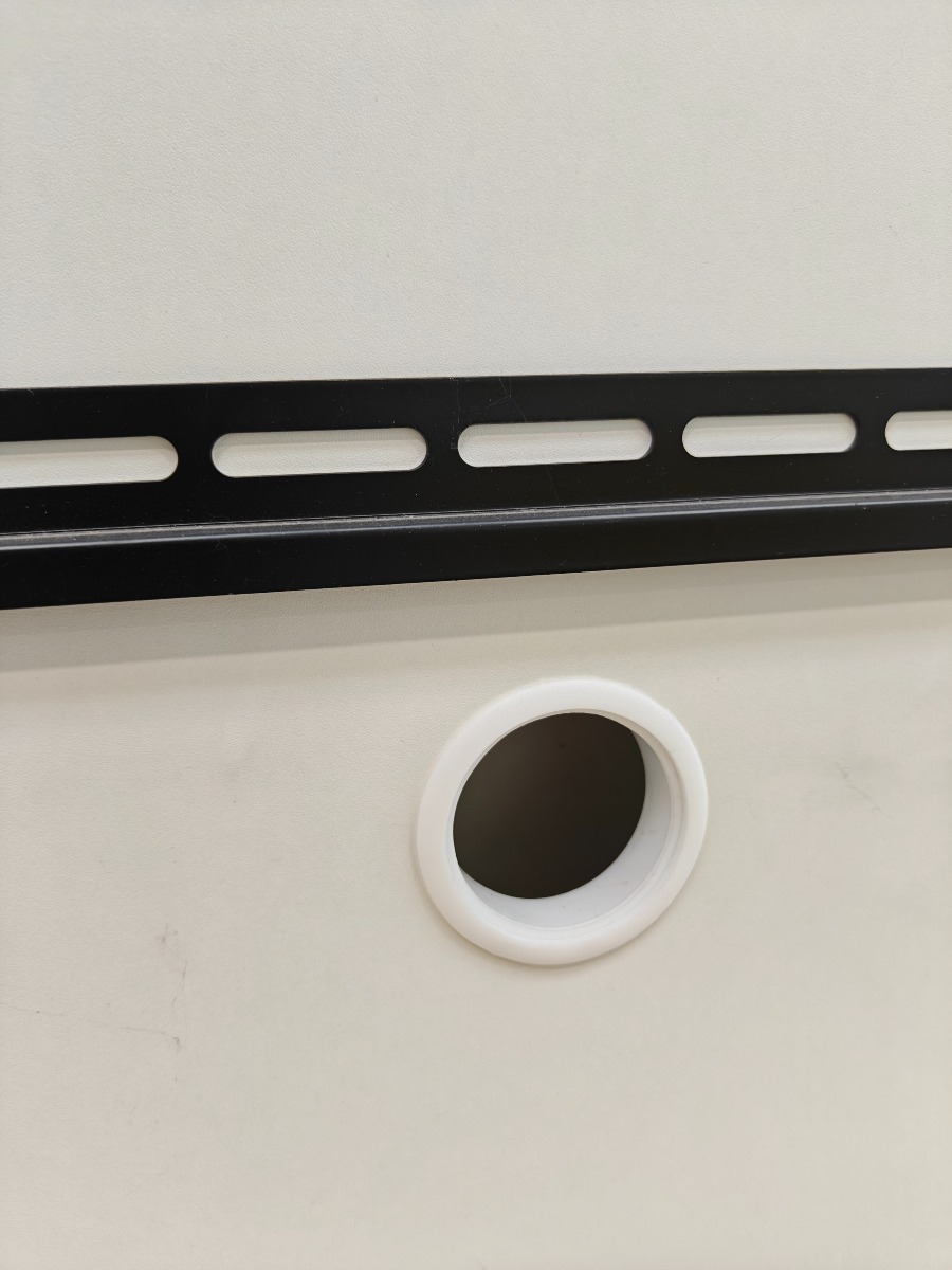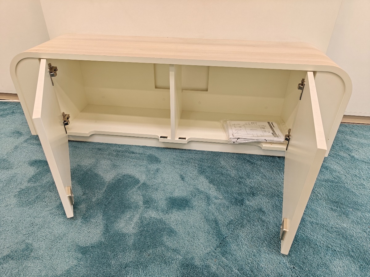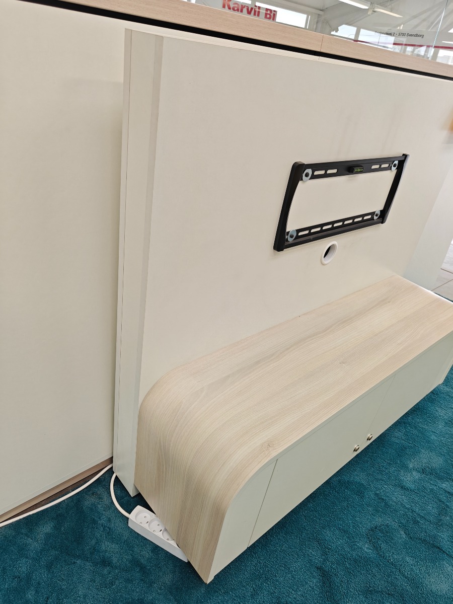 Møbel til TV - med buet TV-bord i lys træfarve og 2 stk. låger - denne sidder på en hvid bagvæg, hvorpå der kan monteres TV. Selve bagvæggen måler B: 120 cm. D: 10 cm. Kommoden måler L: 120 x D: 40 x H: 41 cm. Med alm. brugsspor.
