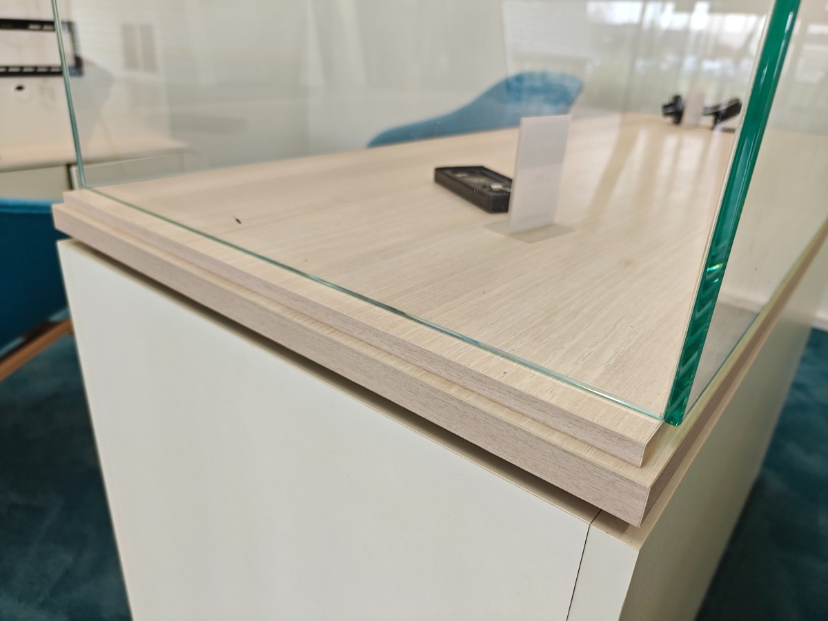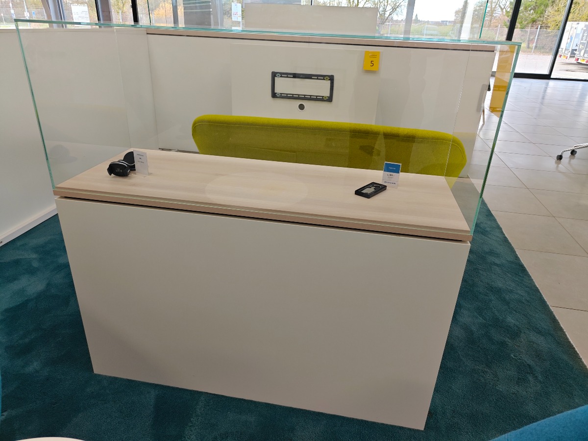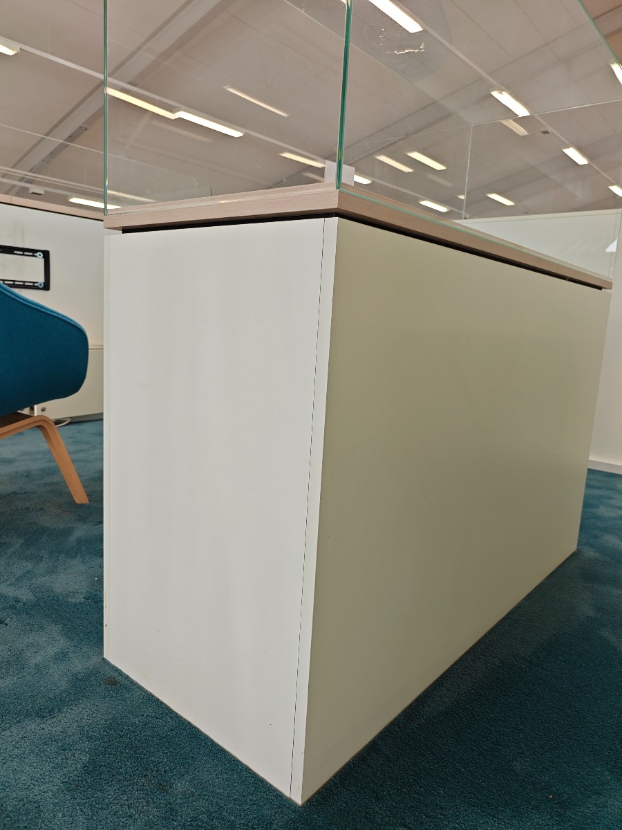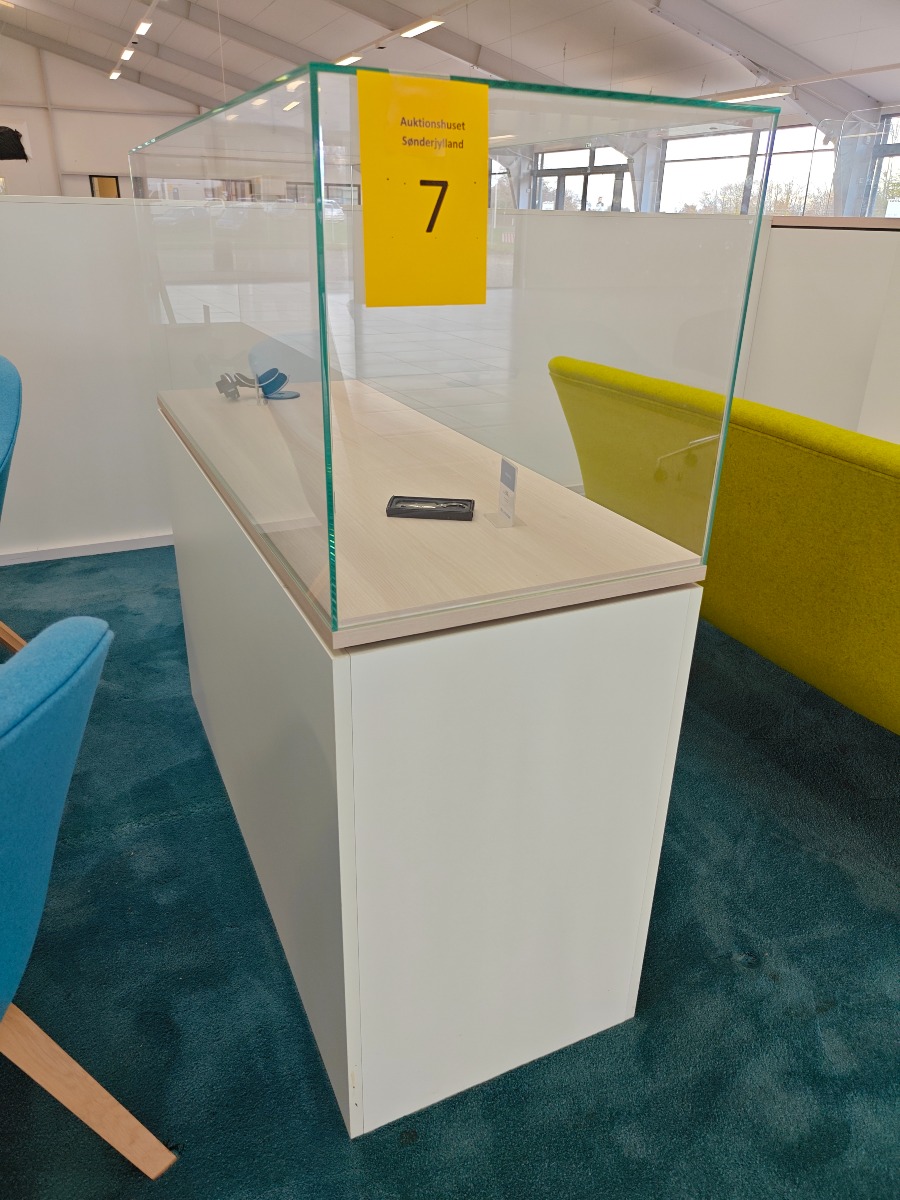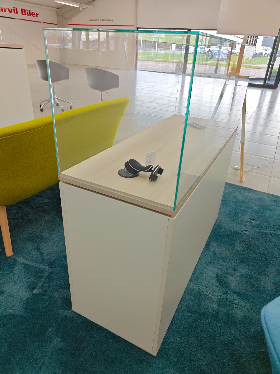 Udstillingsmontre med hvid bund, bordplade i lys træfarve, samt glas. Det måler L: 120 cm. B: 45 cm. H: 120 cm. Med alm. bruggspor.