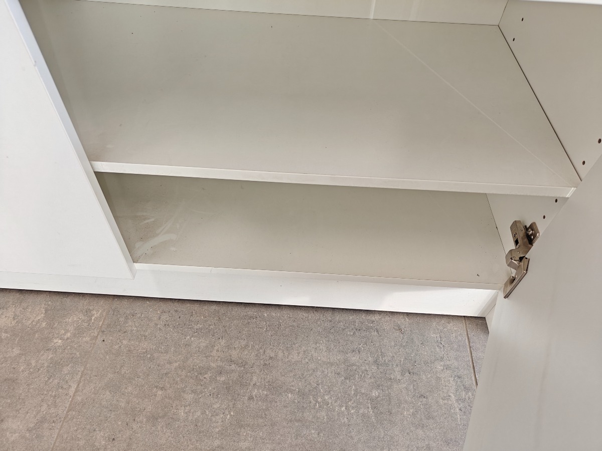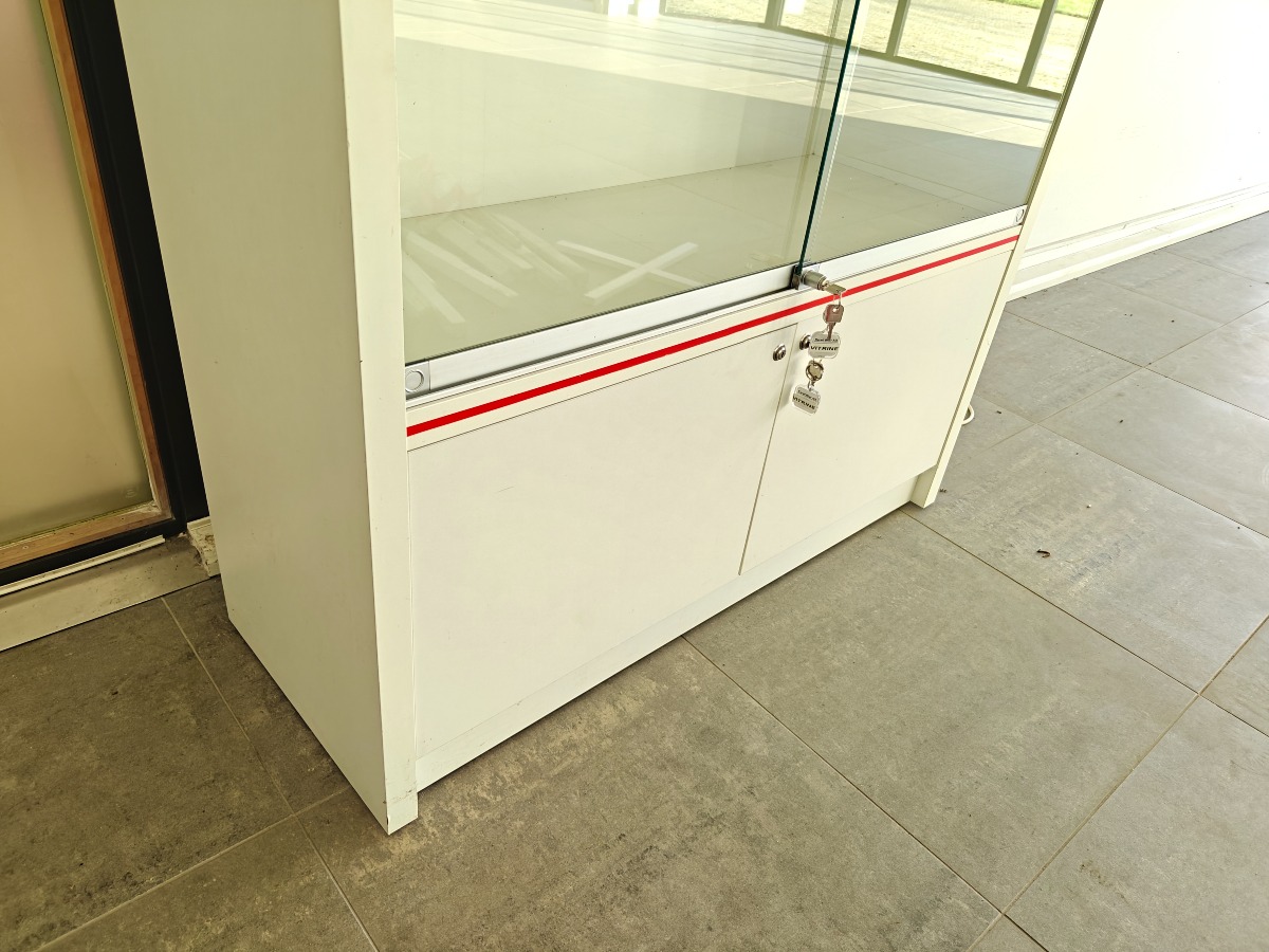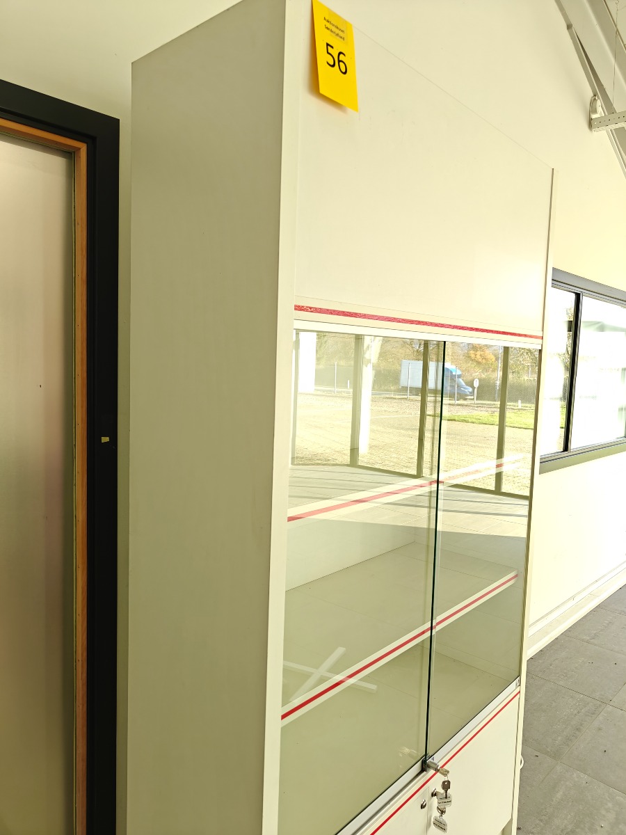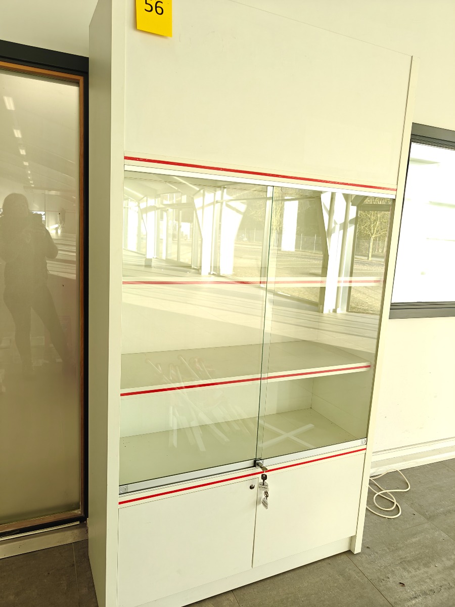 Udstillingsskab med glas-skydelåger, samt 2 låger nederst. Der medfølger nøgle. Den måler 120 cm i bredden.
