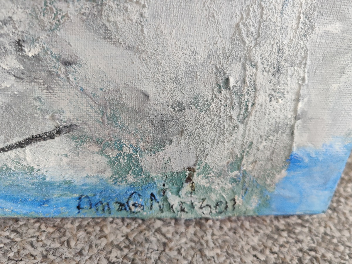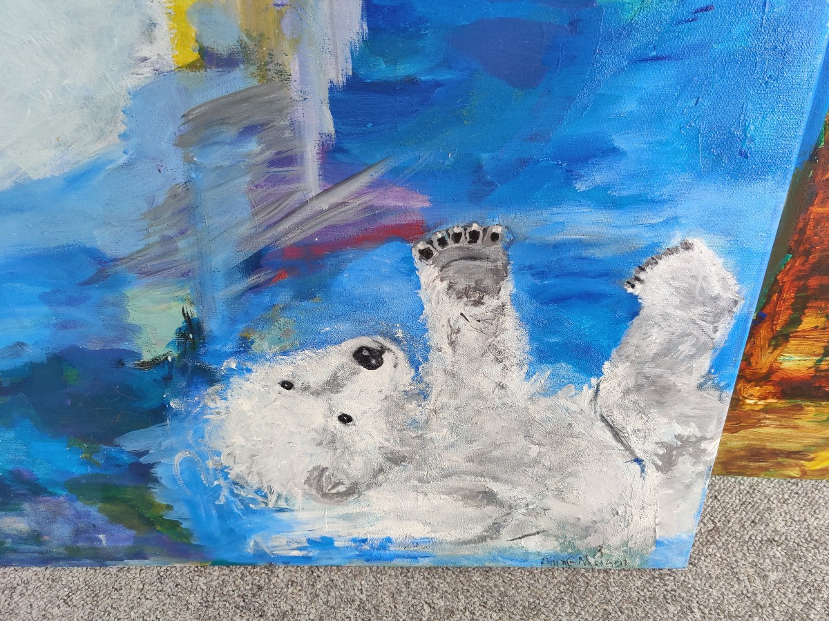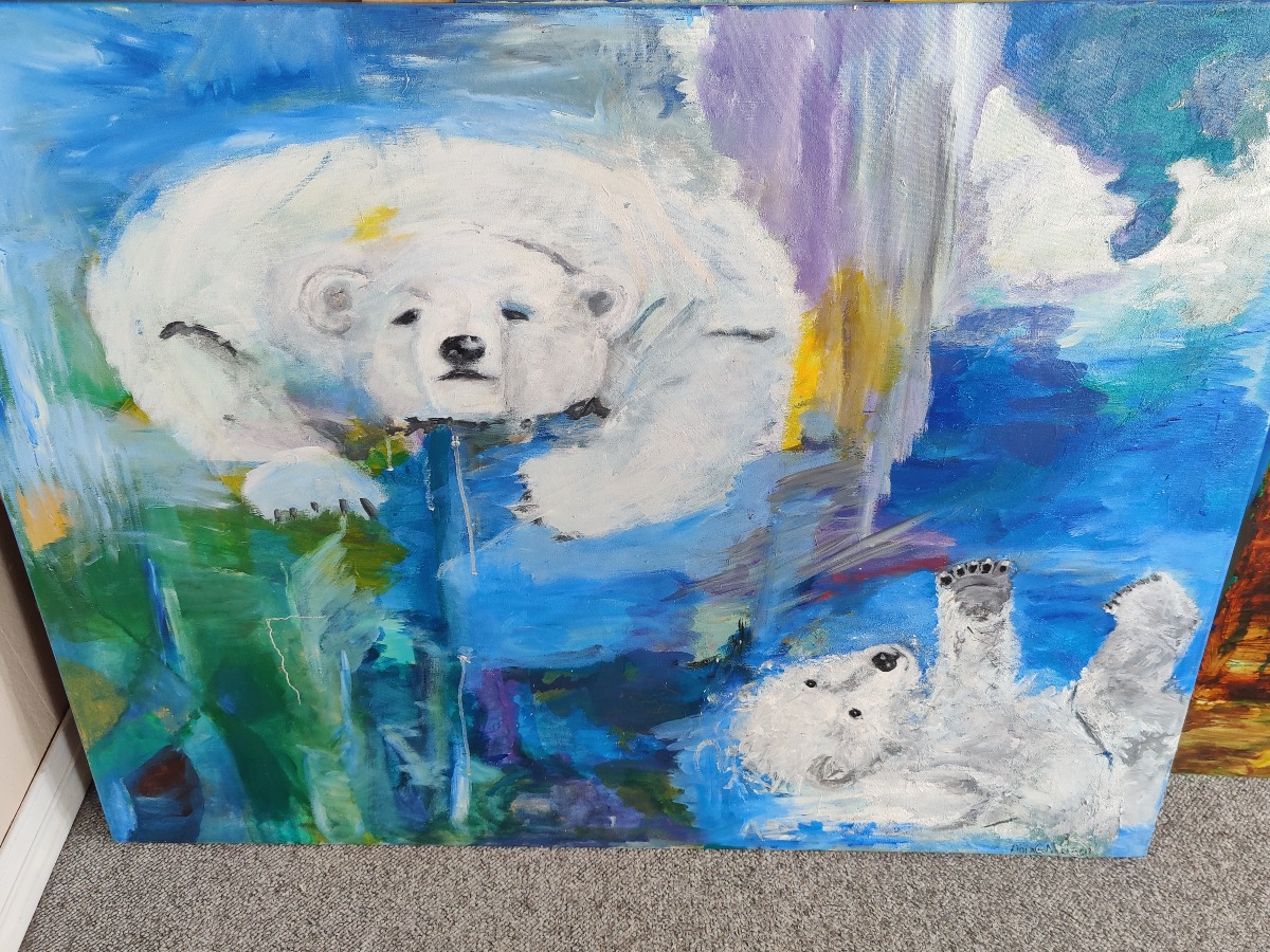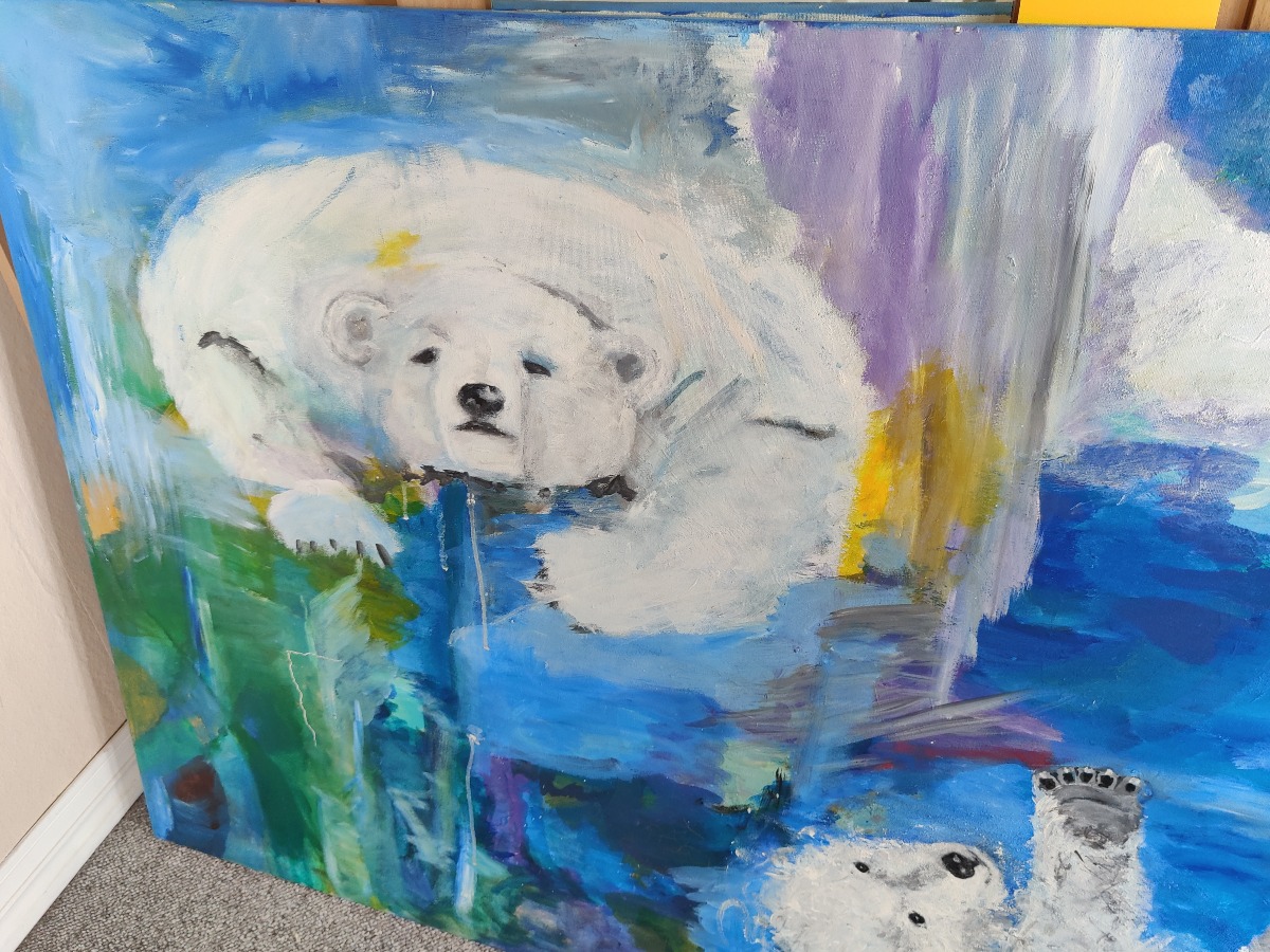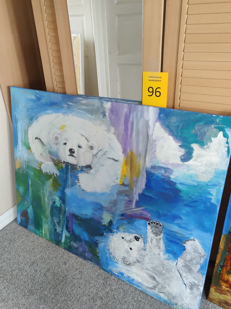 Anja Geding Nielsen. Motiv med isbjørne. Sign. Anja G. Nielsen. 91 x 120 cm.