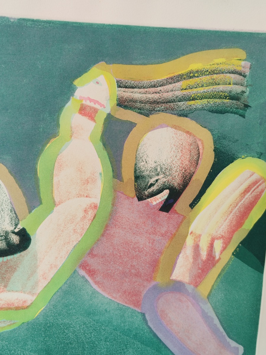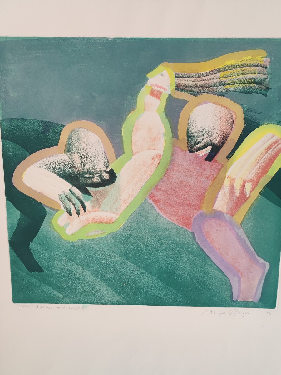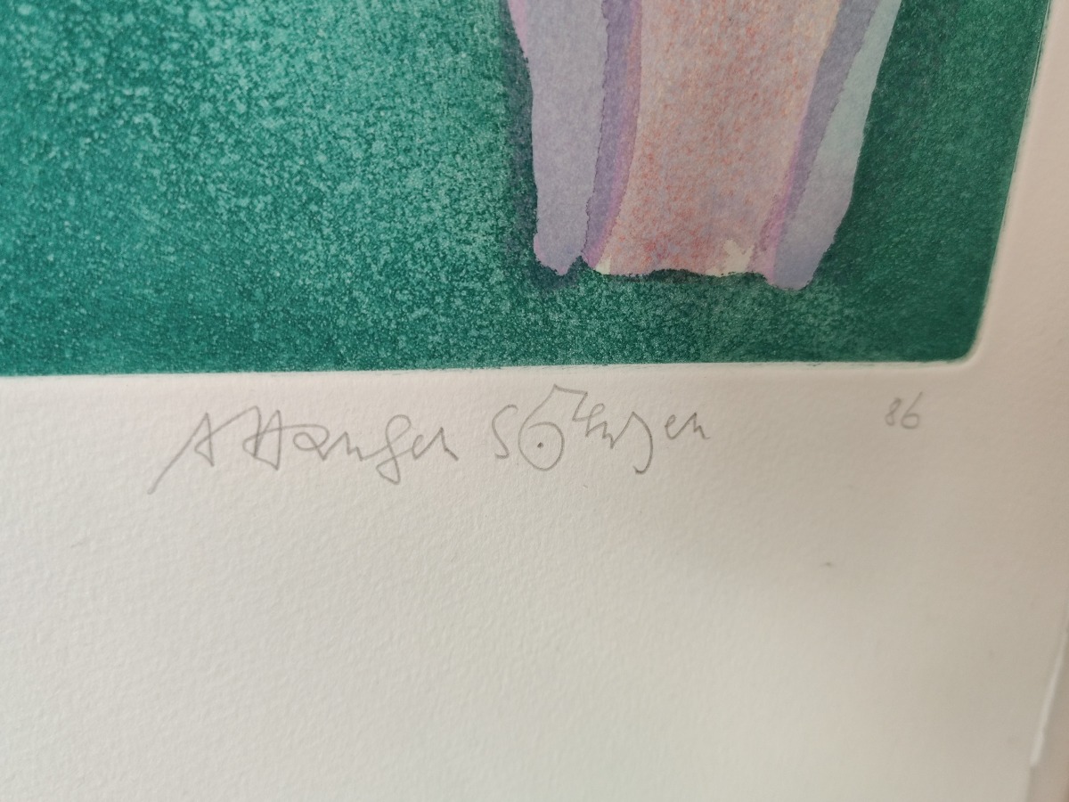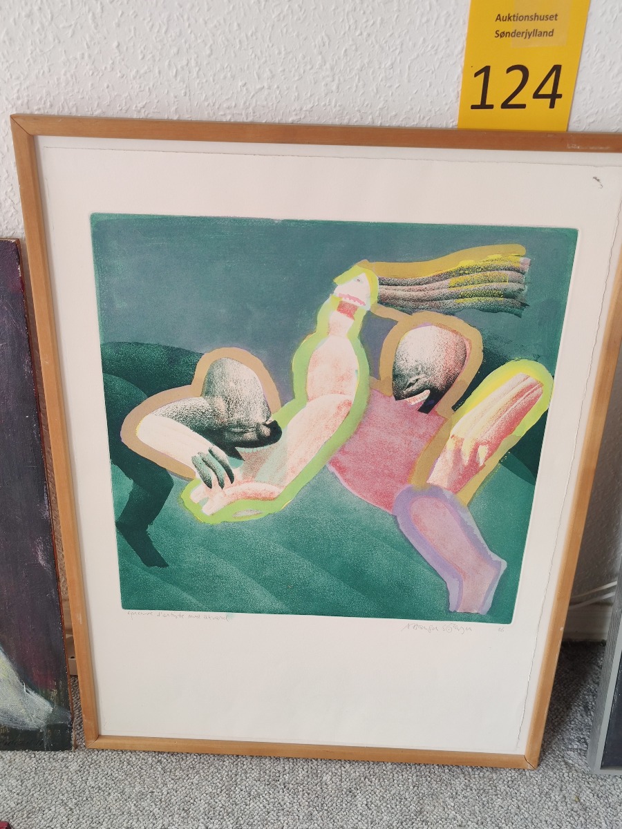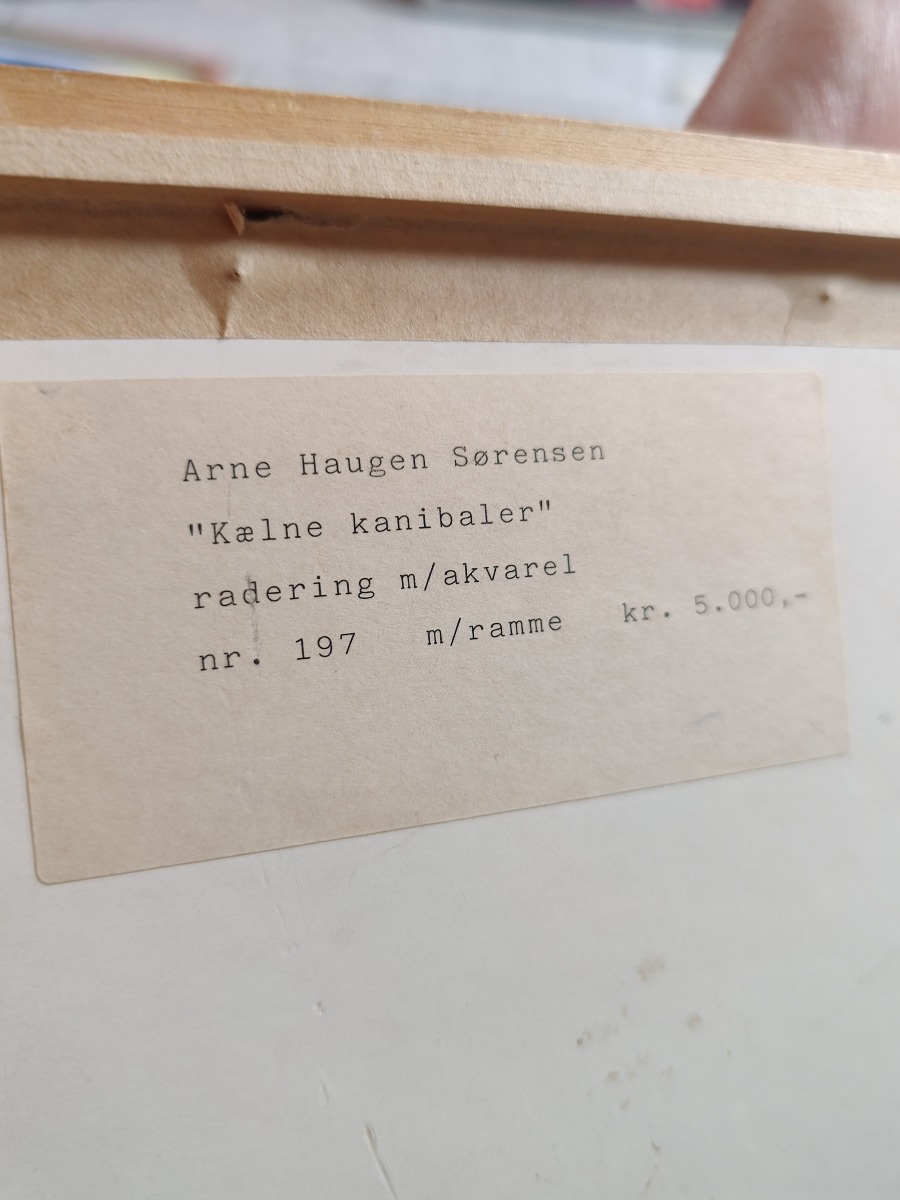 Arne Haugen Sørensen "Kælne Kanibaler". Radering og akvarel. Beskrevet og signeret A. Haugen Sørensen 86 med bly. Udgået fra Galleri Asbæk.