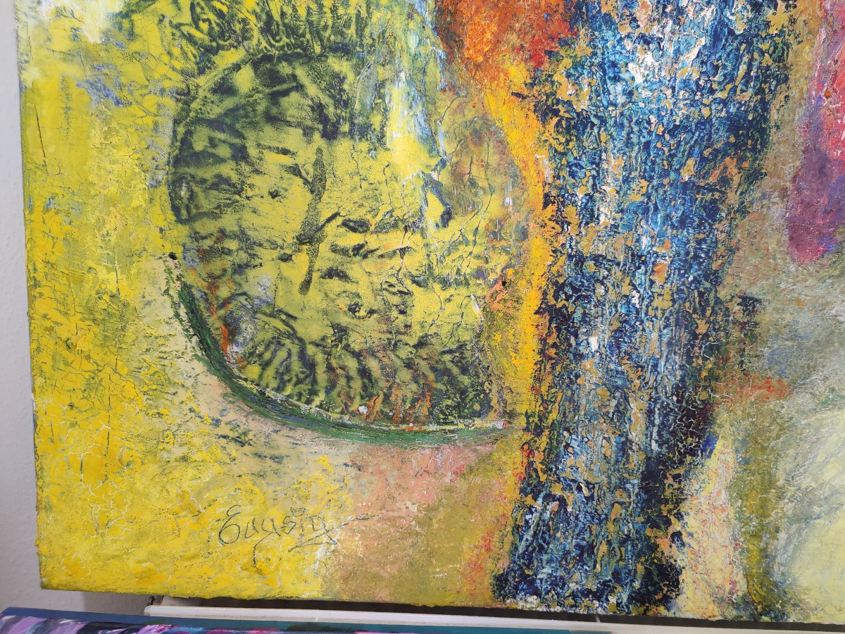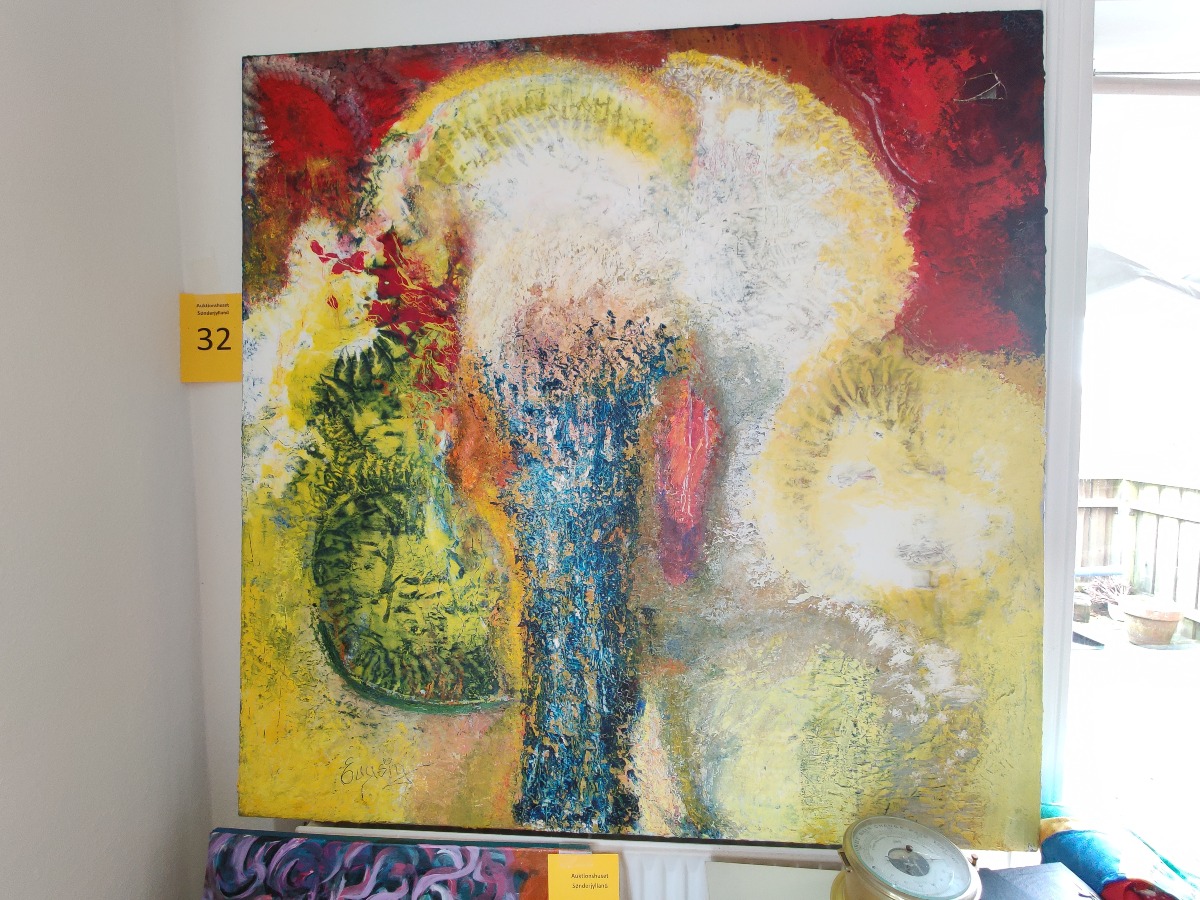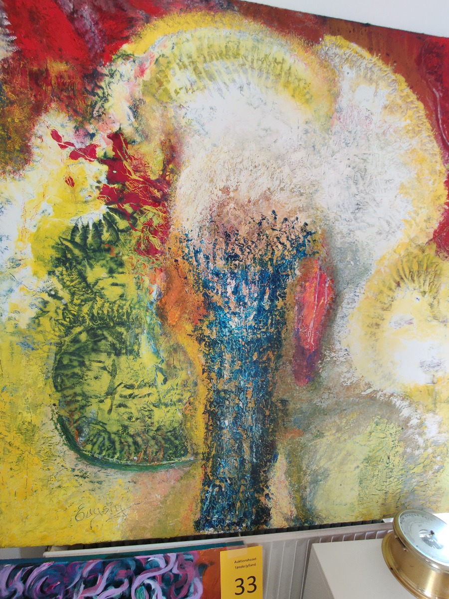 Engsig figurkombination. Olie på lærred. Sign. Engsig. 125 x 125 cm. Skade på lærred i øverste højre hjørne.
