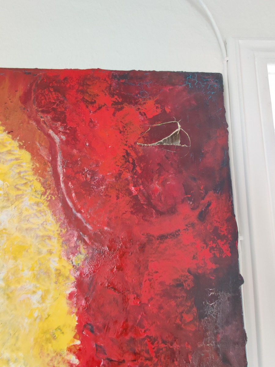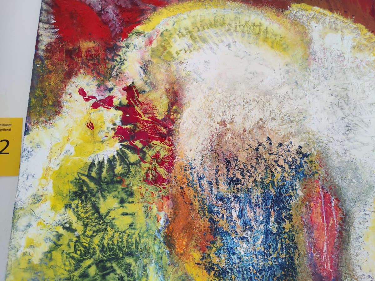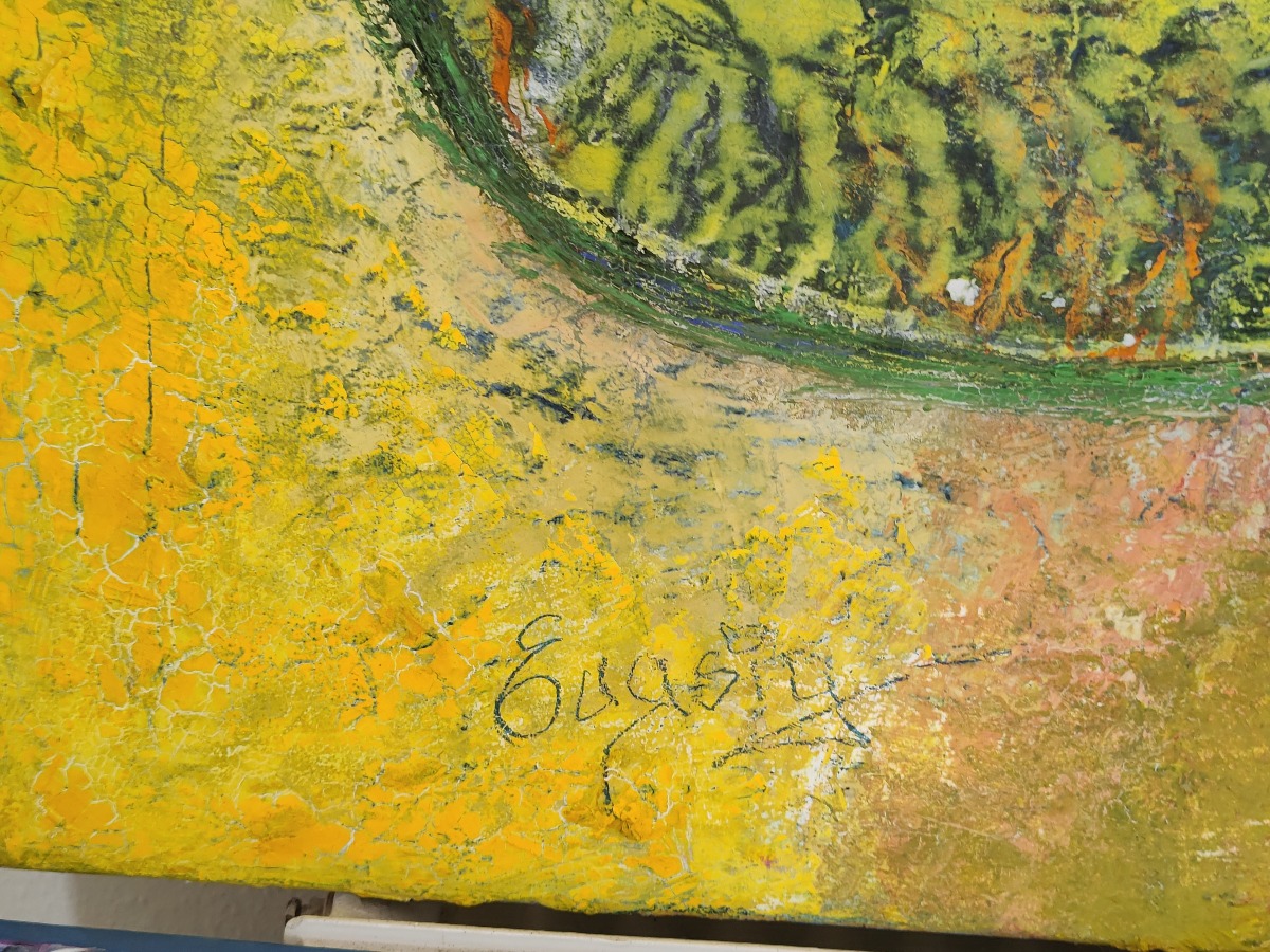 Engsig figurkombination. Olie på lærred. Sign. Engsig. 125 x 125 cm. Skade på lærred i øverste højre hjørne.