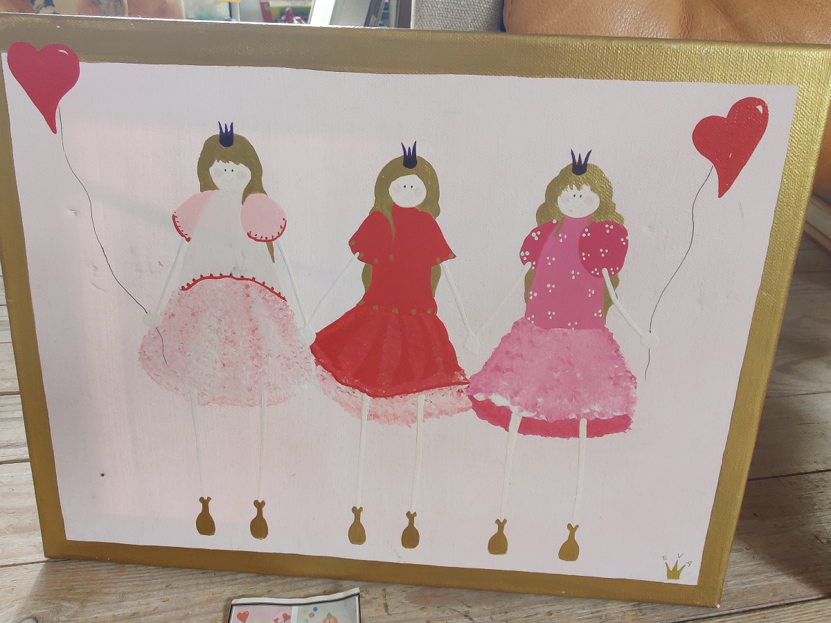 Eva F. Madsen Motiv af tre prinsesser. Akryl på lærred. Sign. Eva på lærred og blændramme. 30 x 40 cm.