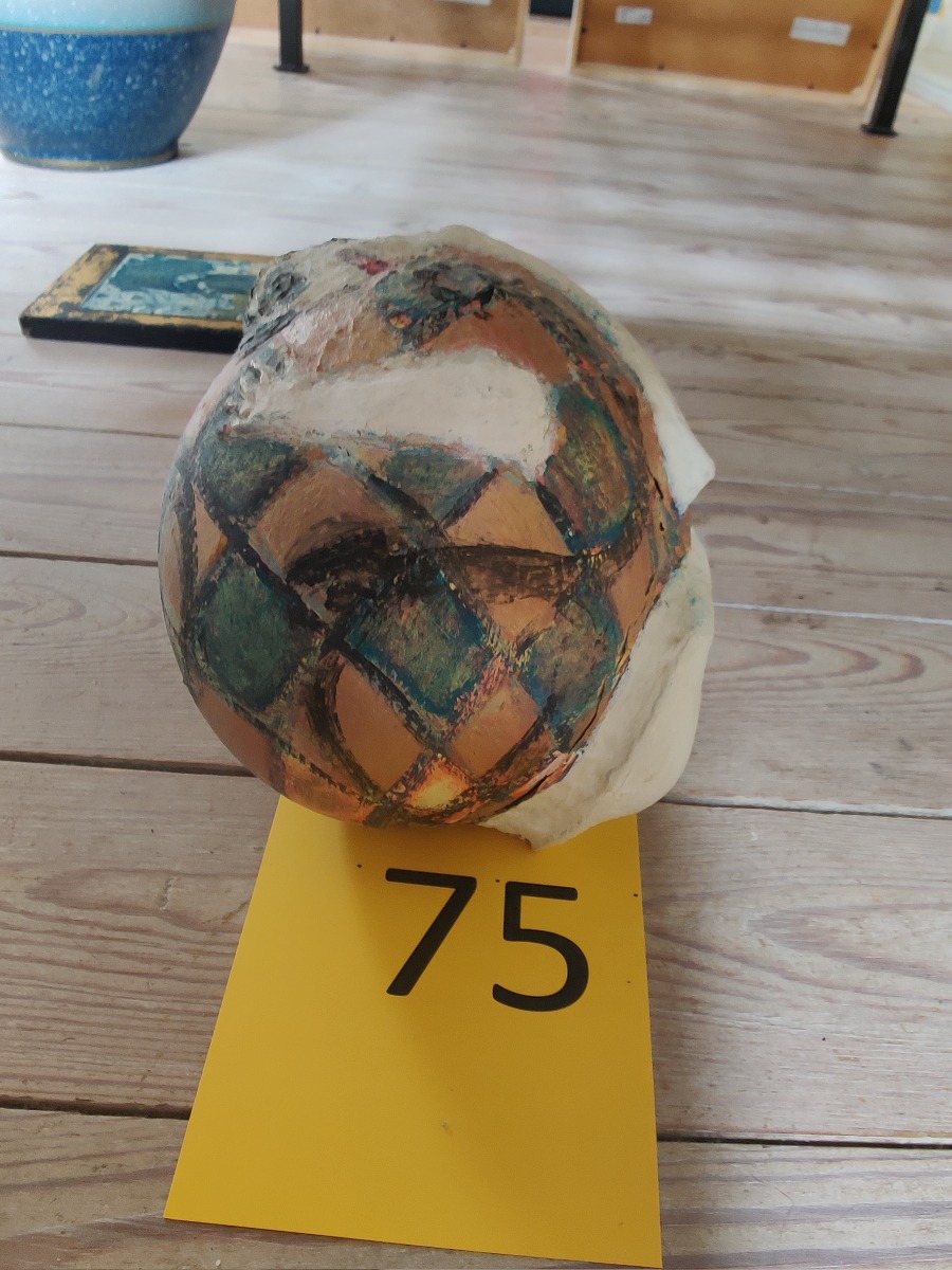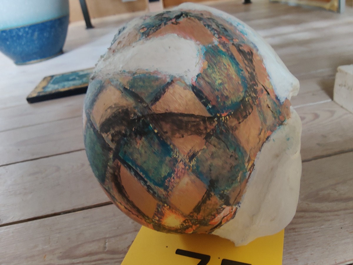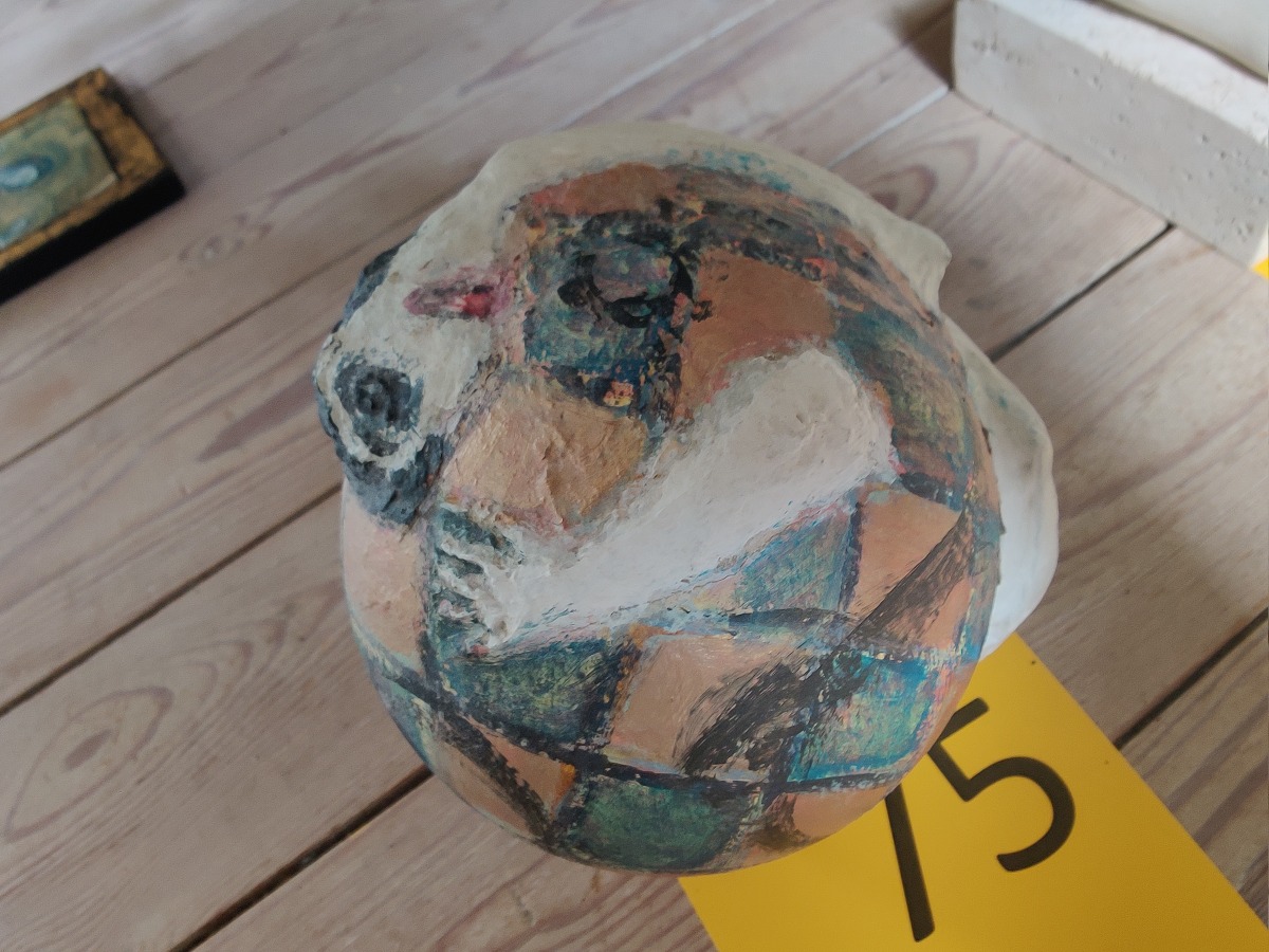 Figur af kvinde omfavnende æg. Ant. keramisk materiale. med koldbemalet dekoration. Mindre skader antageligt. Utydeligt signeret. 17 x 16 cm.