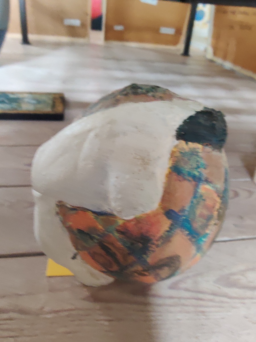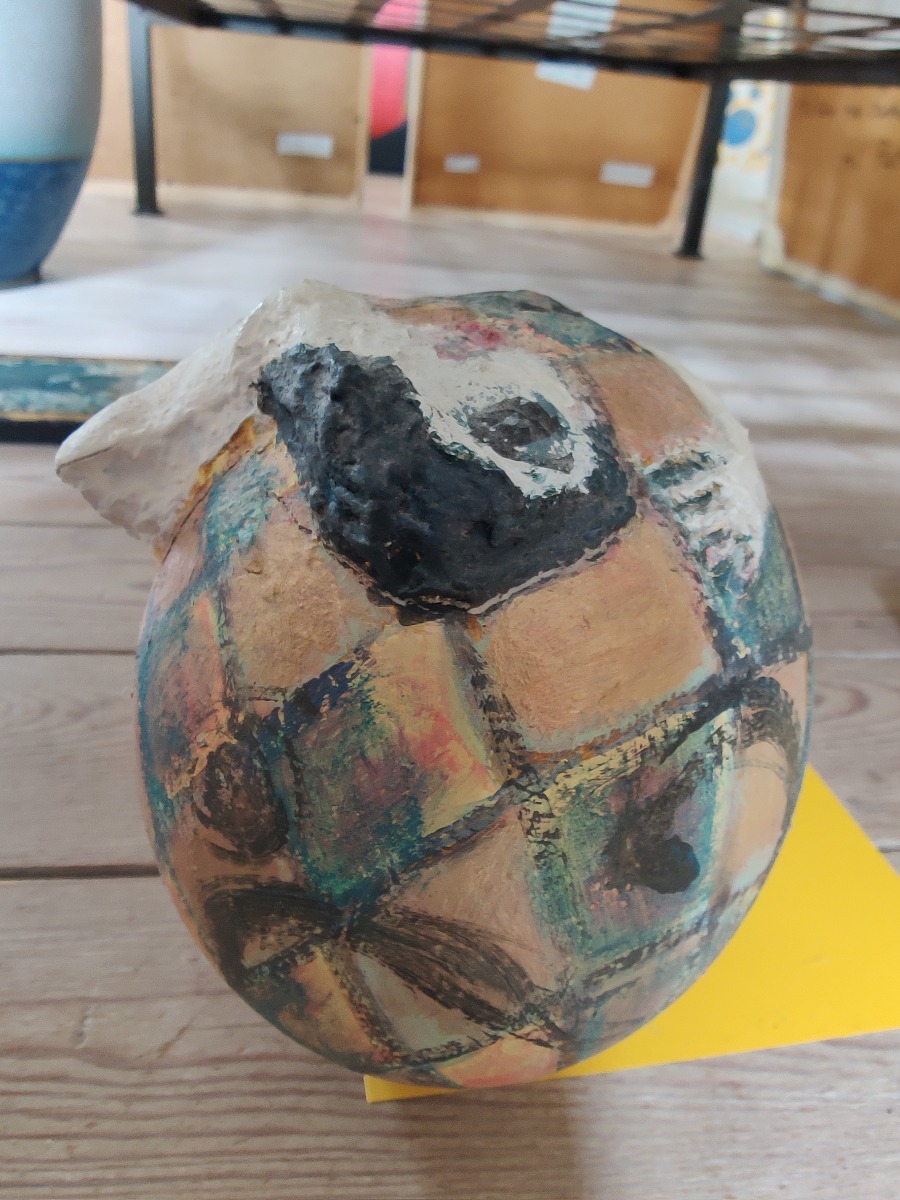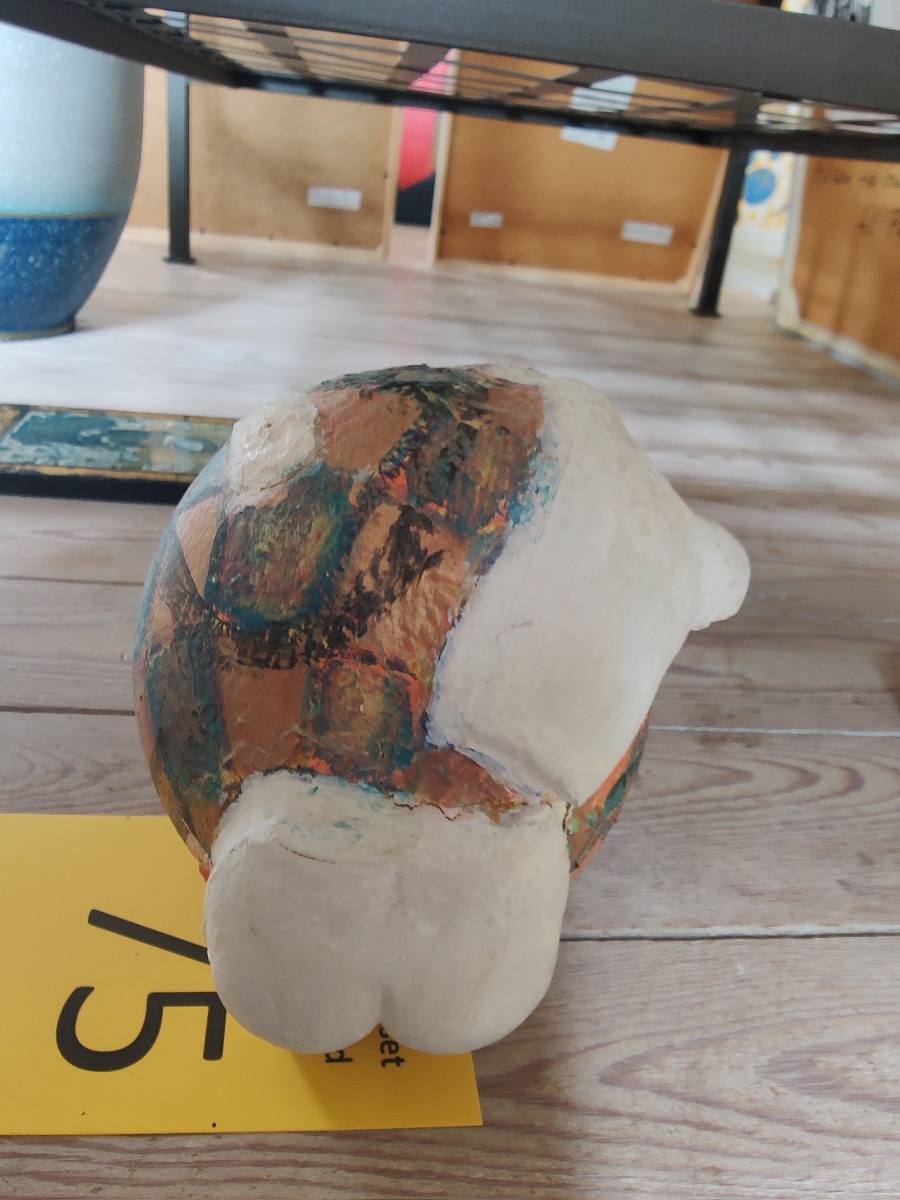 Figur af kvinde omfavnende æg. Ant. keramisk materiale. med koldbemalet dekoration. Mindre skader antageligt. Utydeligt signeret. 17 x 16 cm.