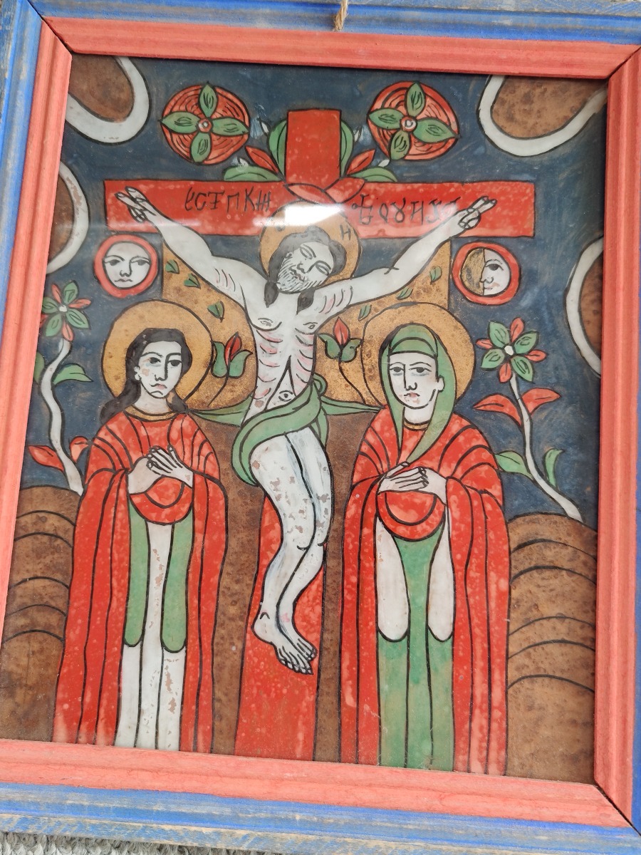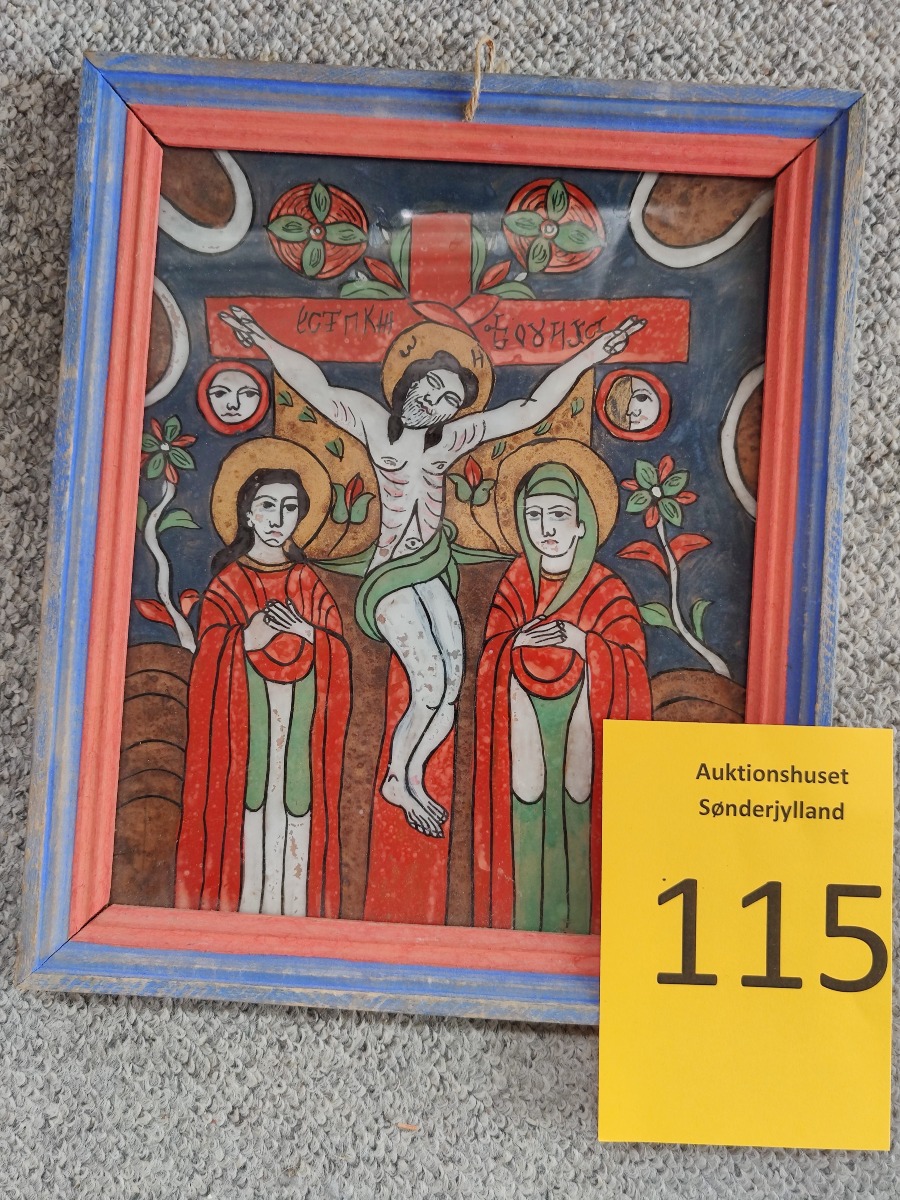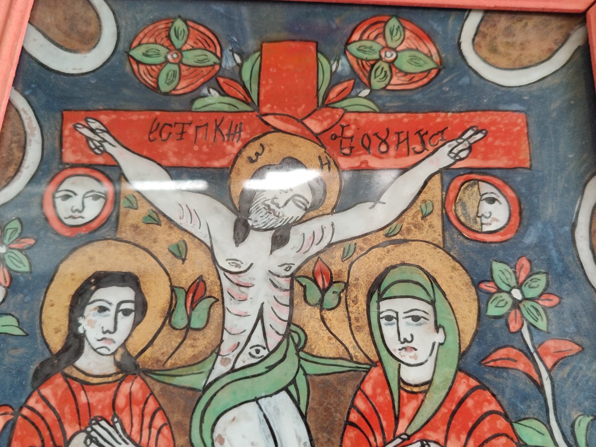 Ikon med Kristus på korset. Indrammet bag glas. Beskrivelse bag på ramme. 35 x 29 cm.