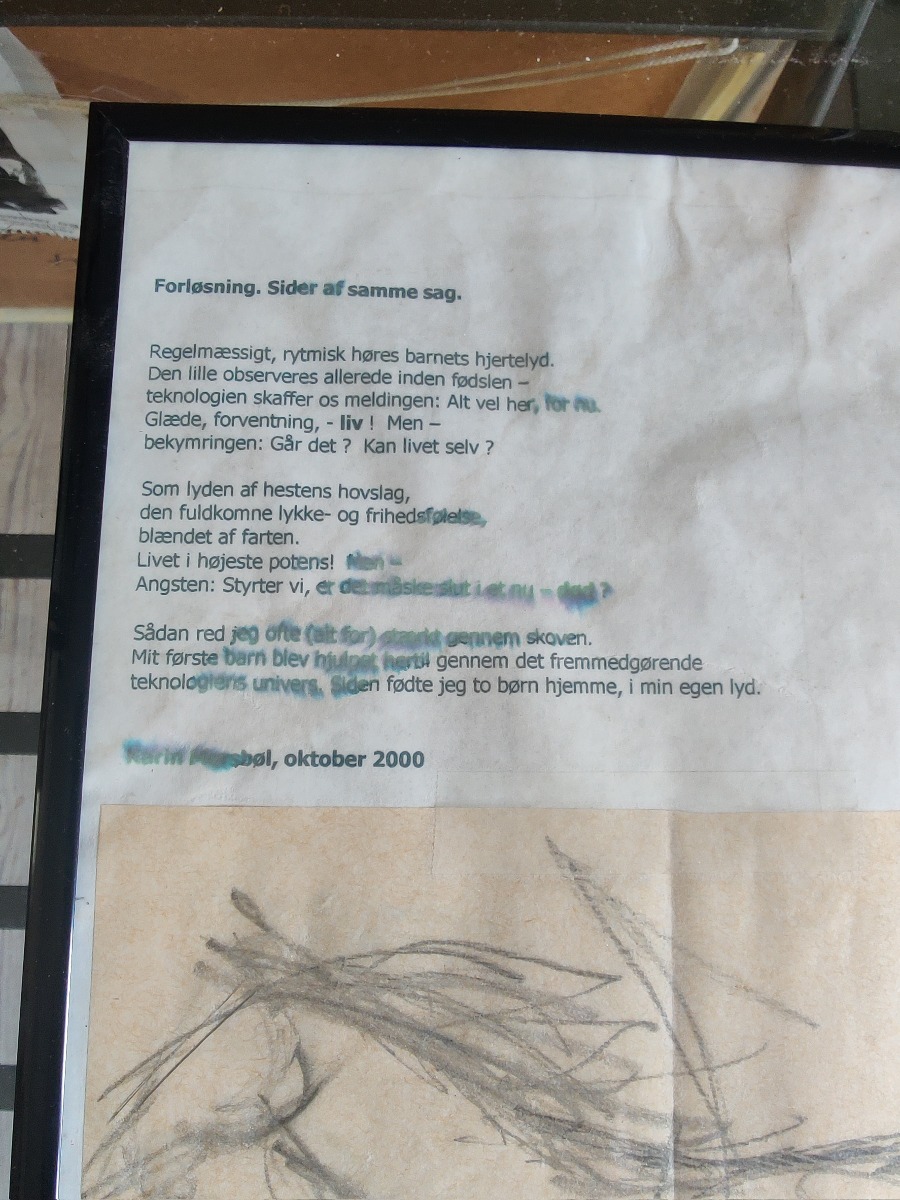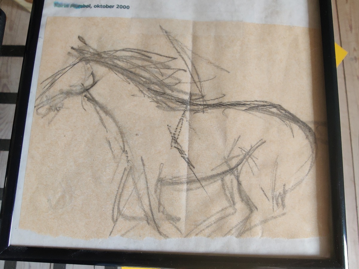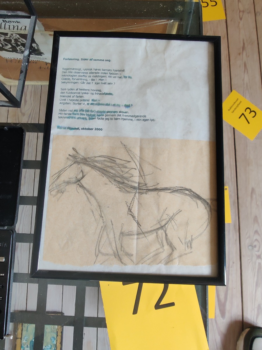Karin Morsbøl Digt og tegning. Motiv af hest tegnet med bly på vokspapir. Hele værk 31 x 21 cm. Fremstår med vandskade.