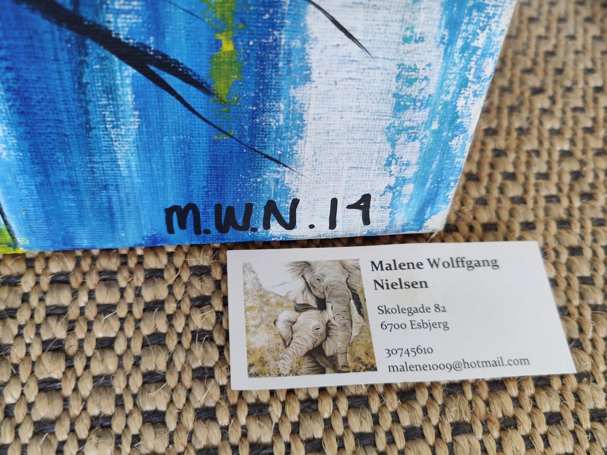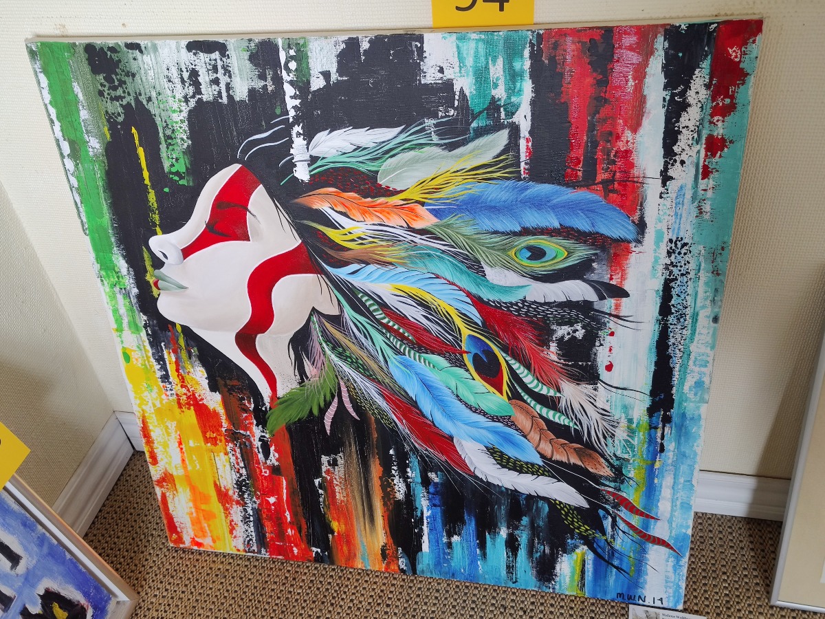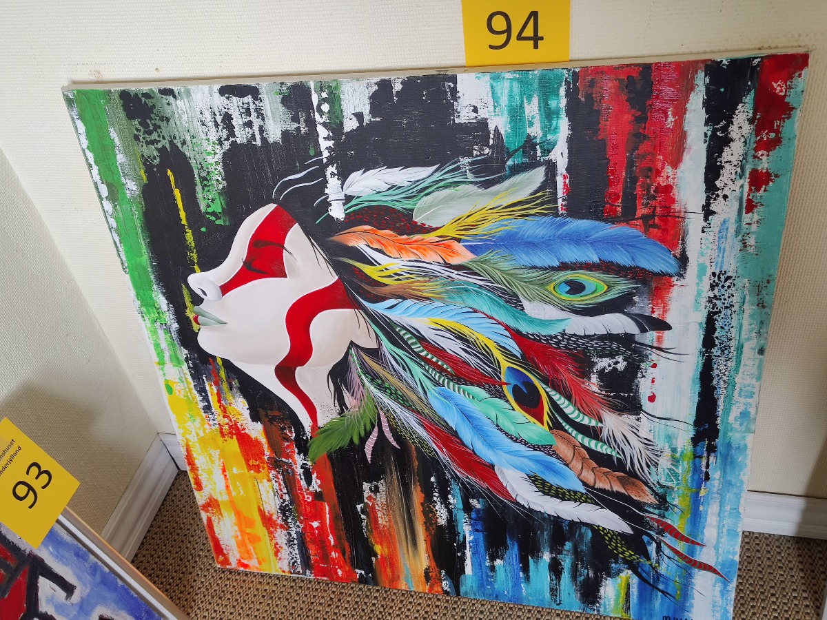 Malene Wolffgang Nielsen. Maskeskildring. Akryl på lærred. Sign. MWN 14 og dedikation på bagside. 80 x 80 cm.