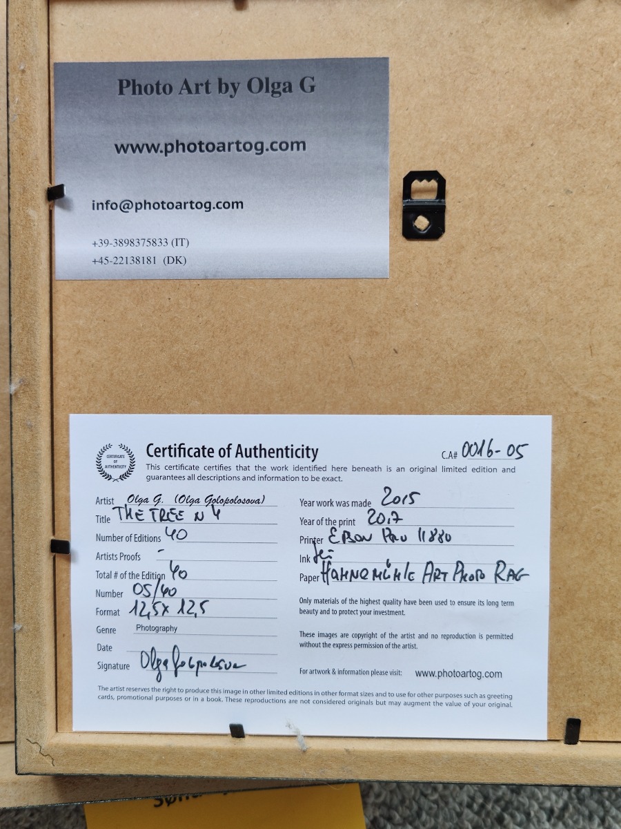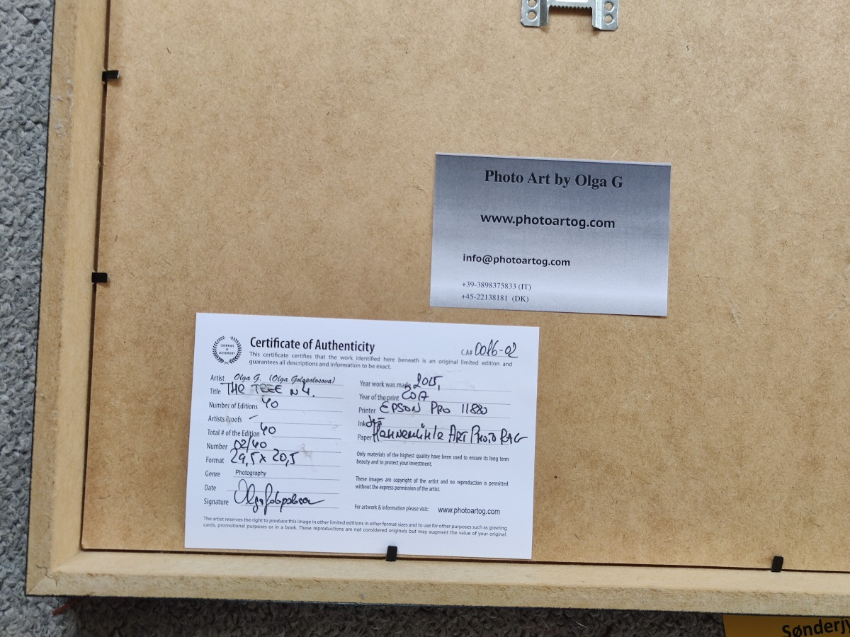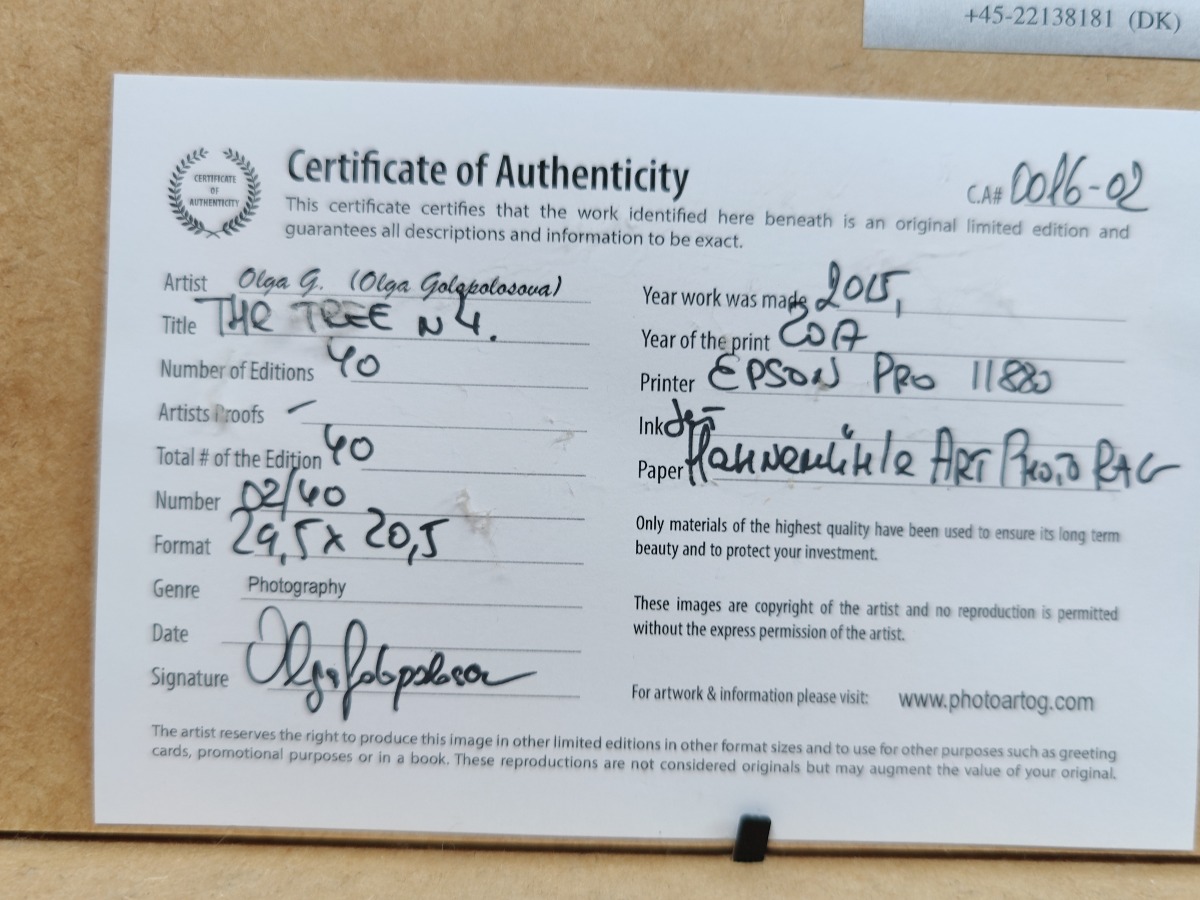 Olga Golspolosova. Fotoprint af træer. 33 x 43 cm. og 25 x 25 cm.