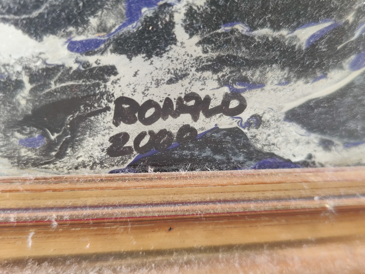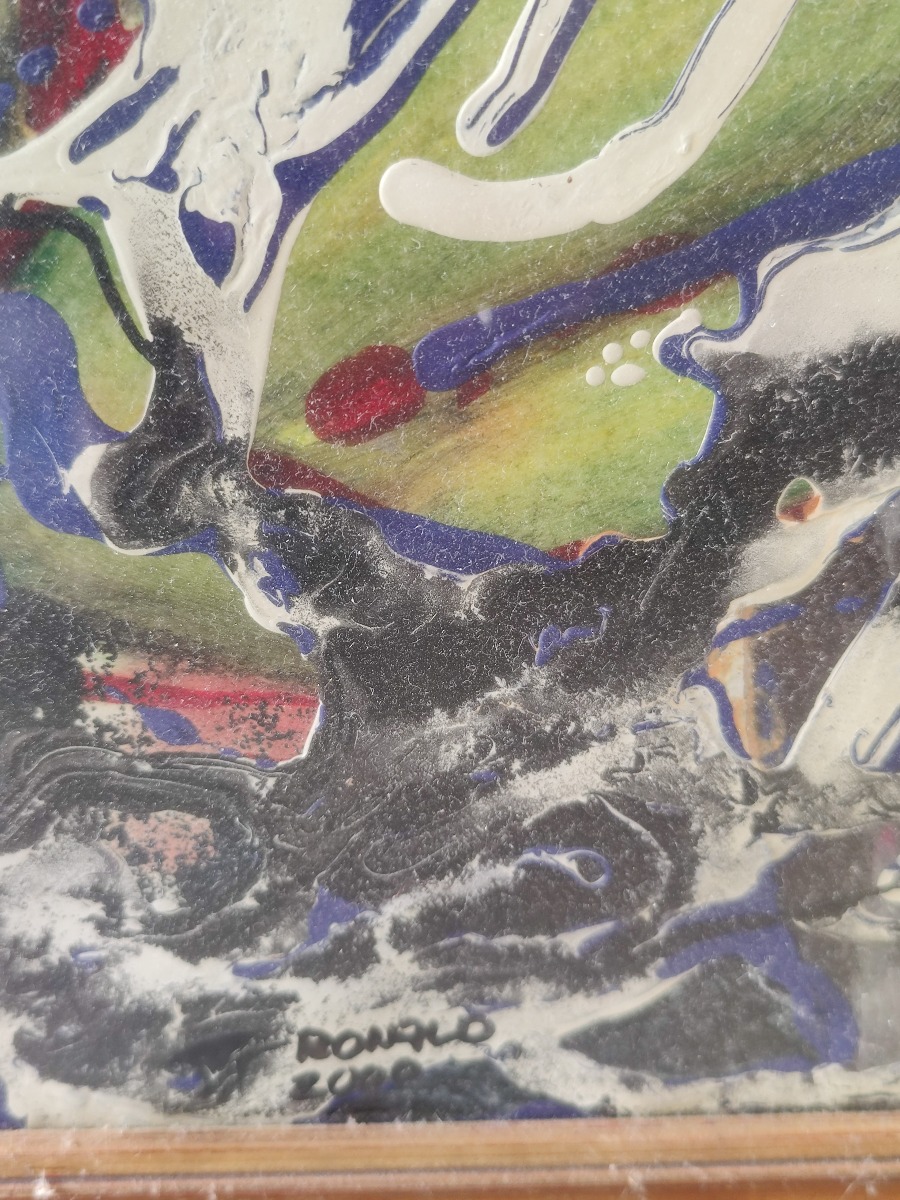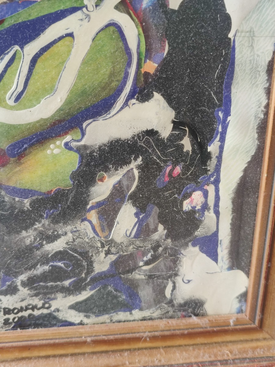 Ronald. Collage med abstrakt motiv. Akryl og papircollage. Sign. Ronald 2000. 53 x 45 cm.