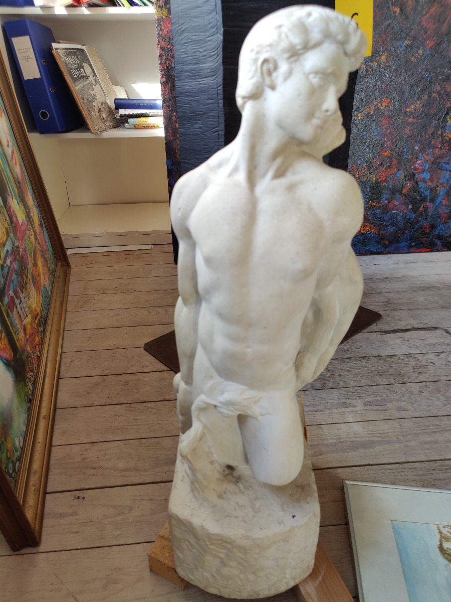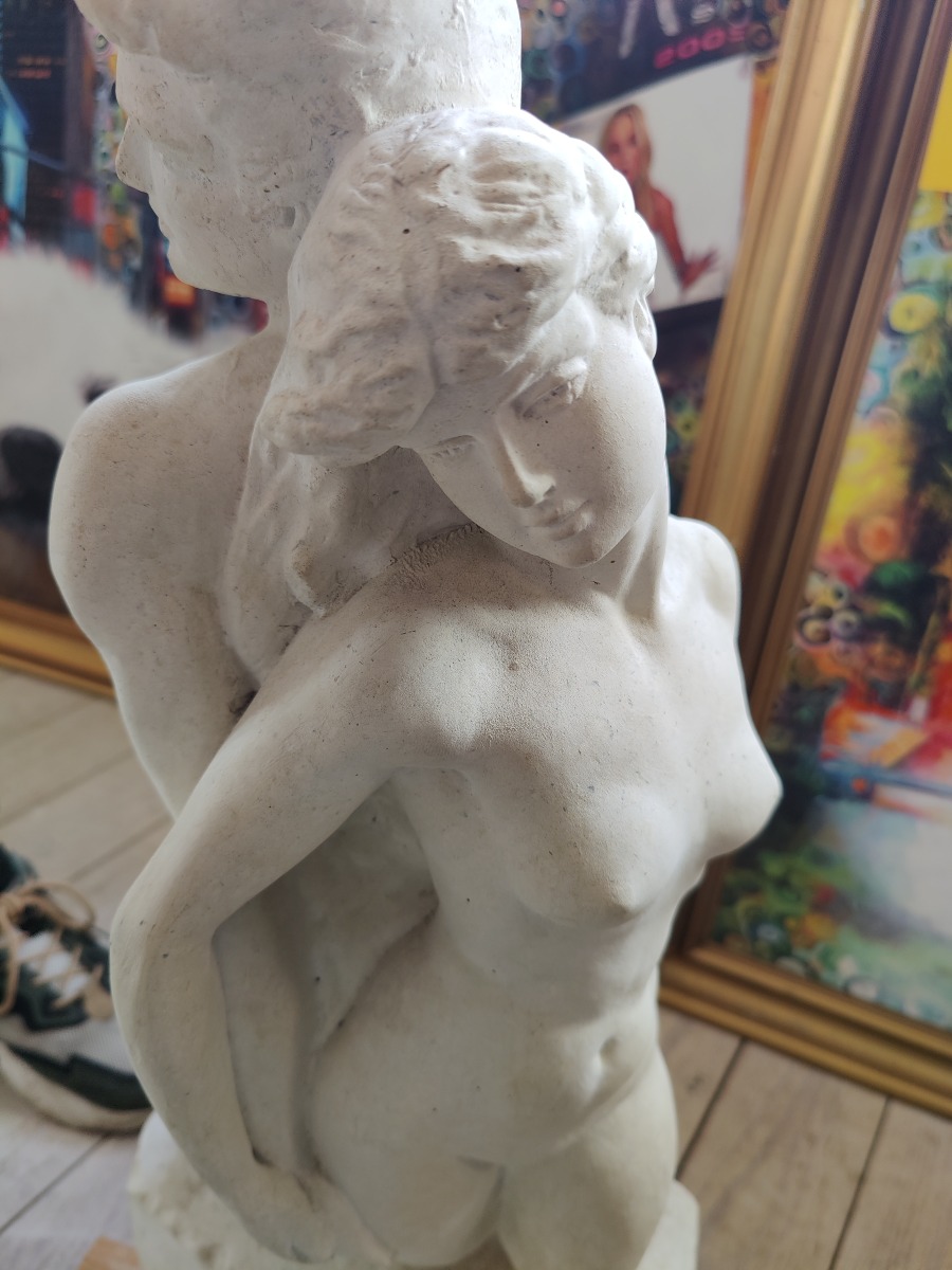 Skulptur af støbt marmor. Kvinde og mand. H. 64 cm. Sokkel 27 x 19 cm.