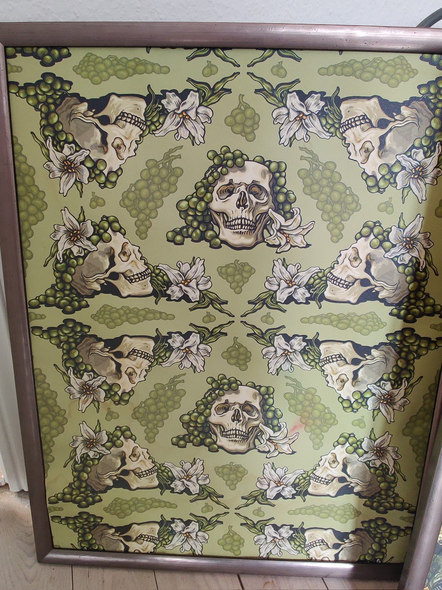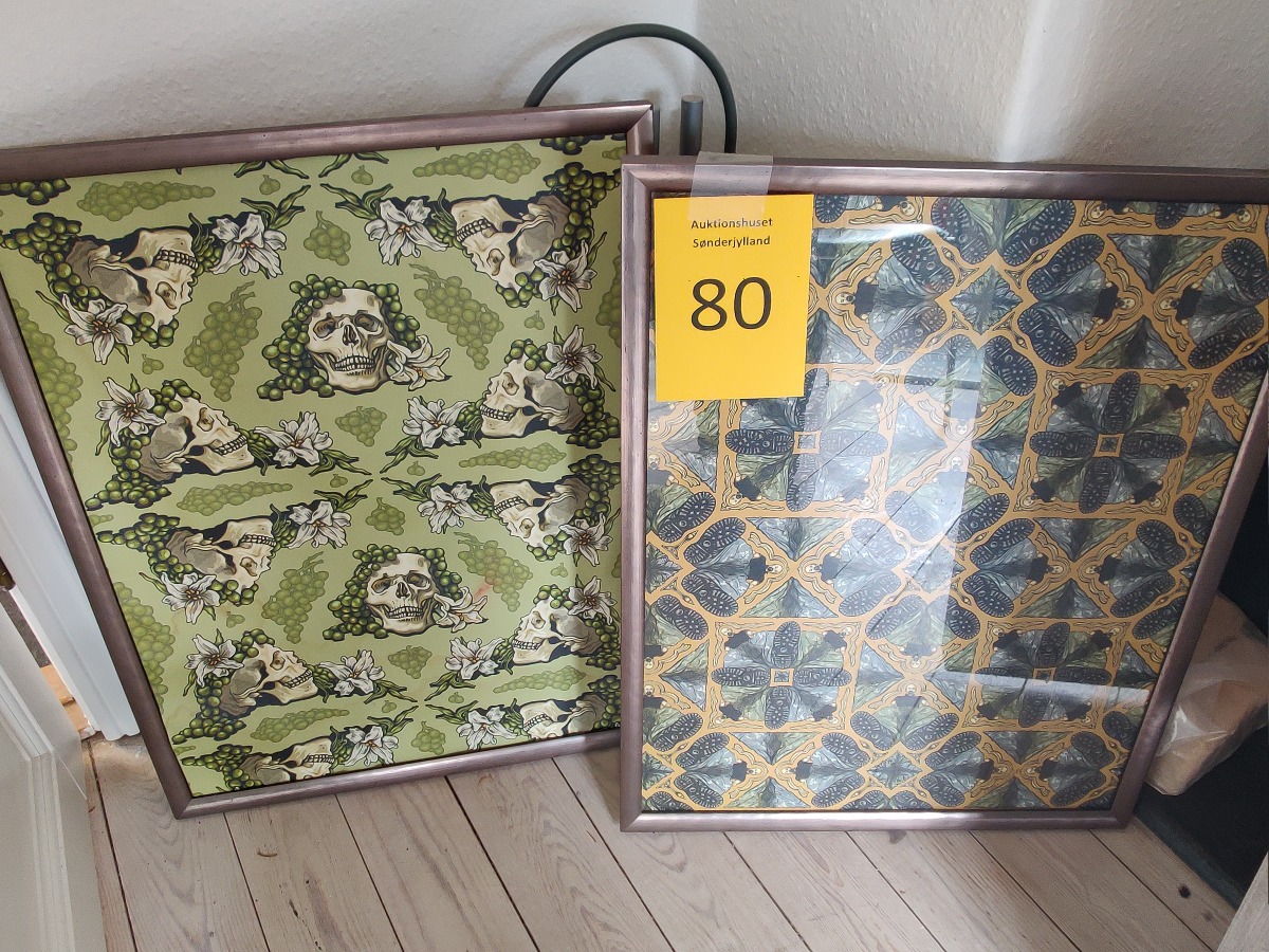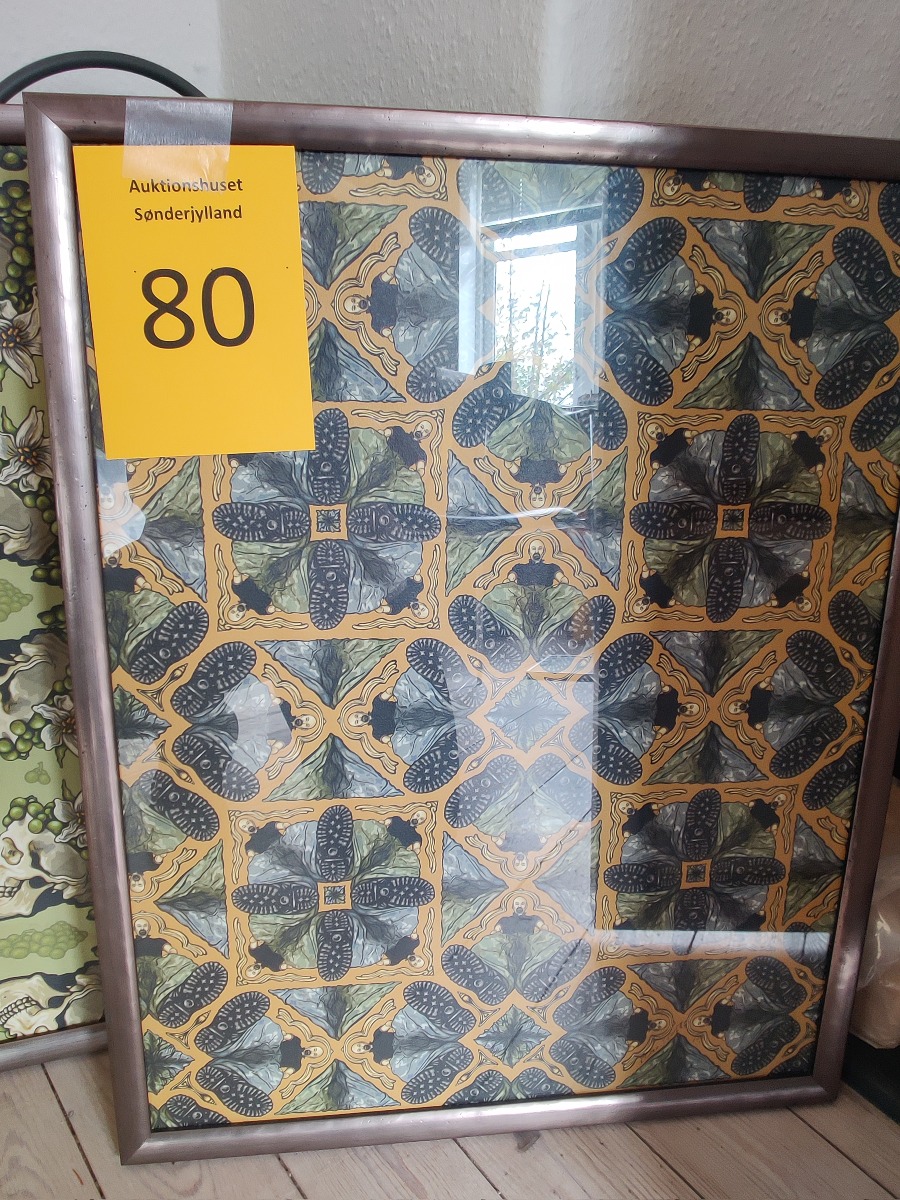 To værker fra projektet "Kunst til tiden på tapetet" fra Esbjerg Kunstmuseum. To stykker kunsttapet kunstnere ikke identificeret. 70 x 63 cm.