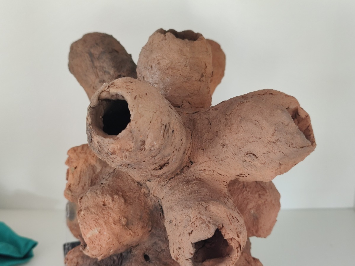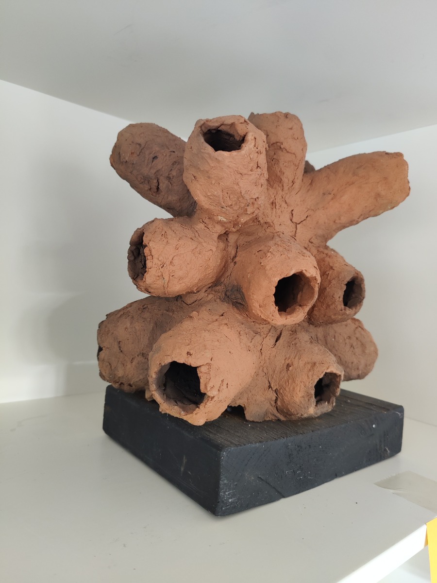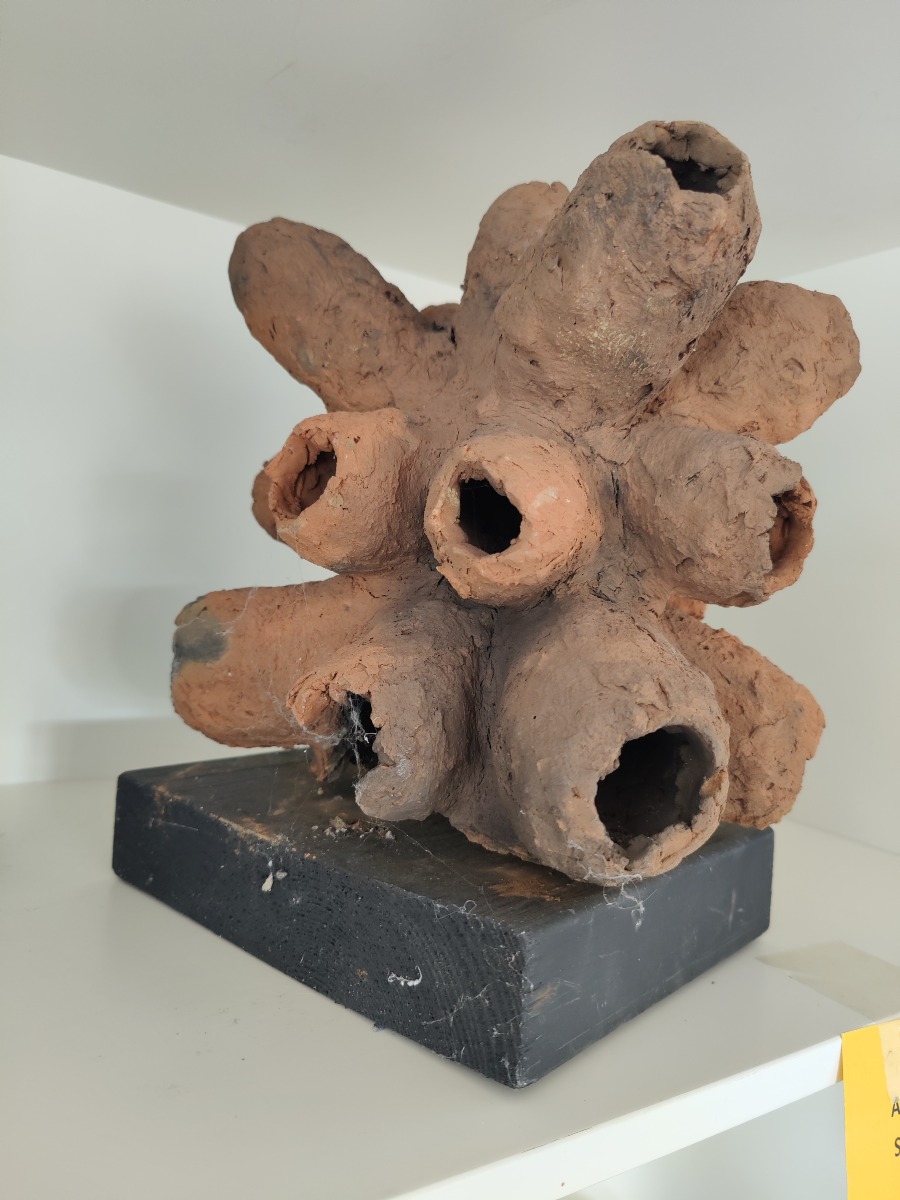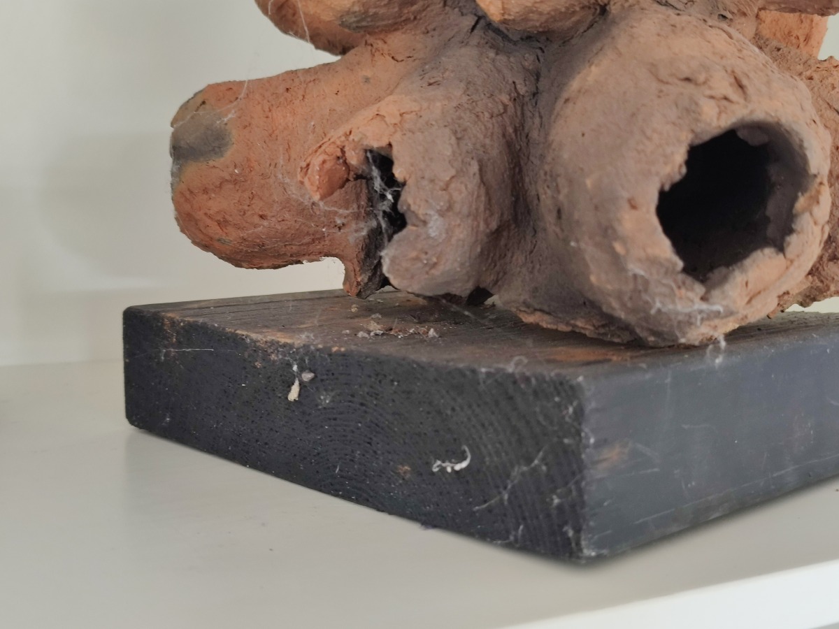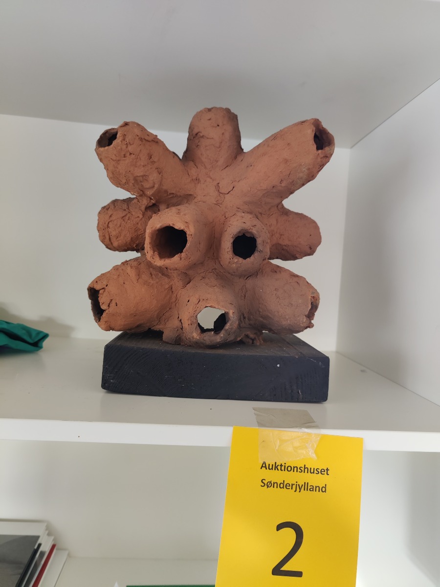 Ubk. kunstner. Figur af ler på træsokkel Organisk form. 32 x 23 x 18 cm.