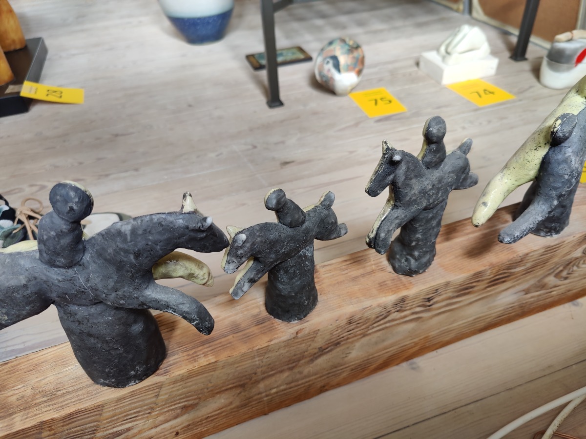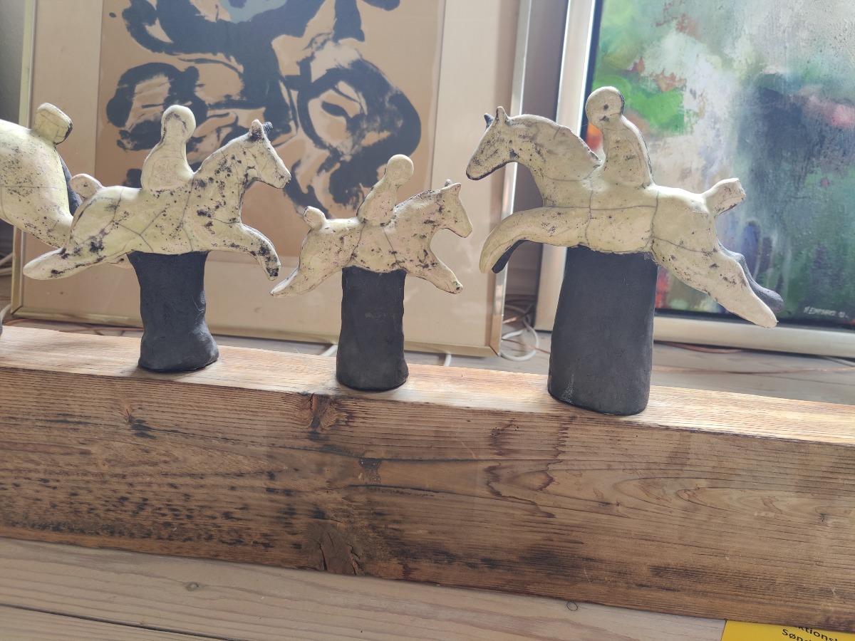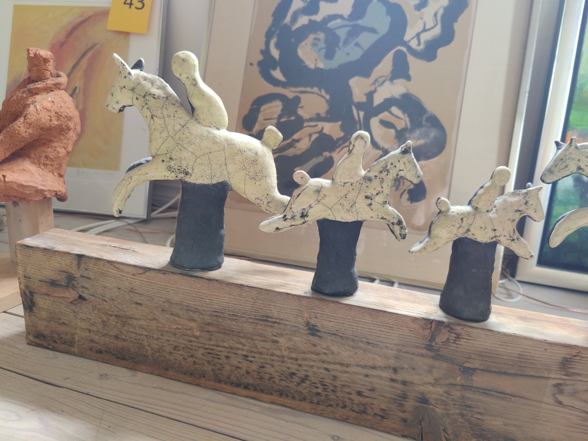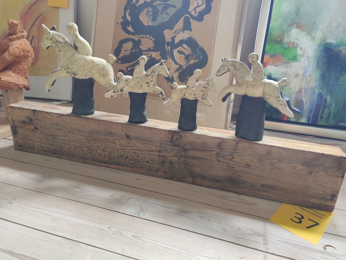 Ubk. kunstner. Installation med 4 heste med ryttere. 4 heste med ryttere af rakubrændt ler, monteret på træstykke. 40 x 95 x 7  cm.