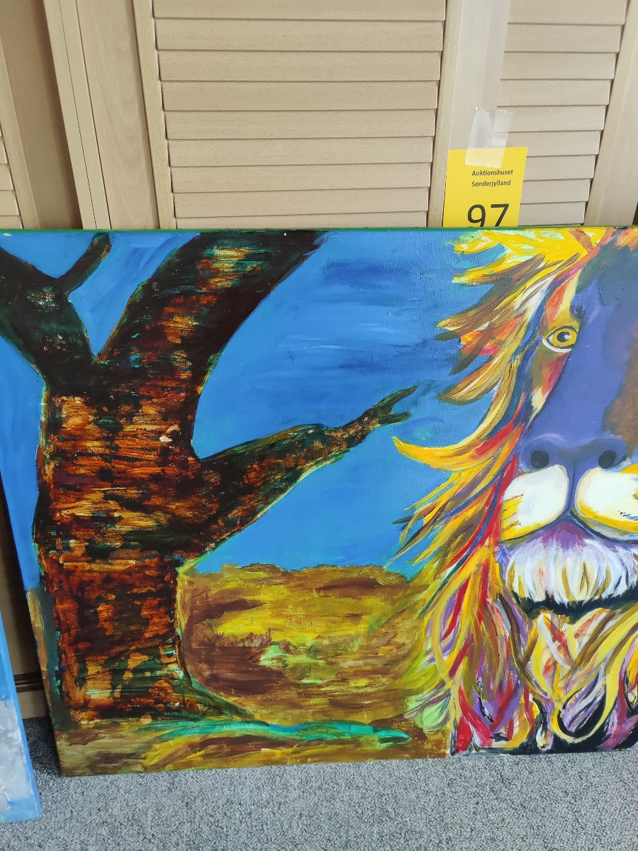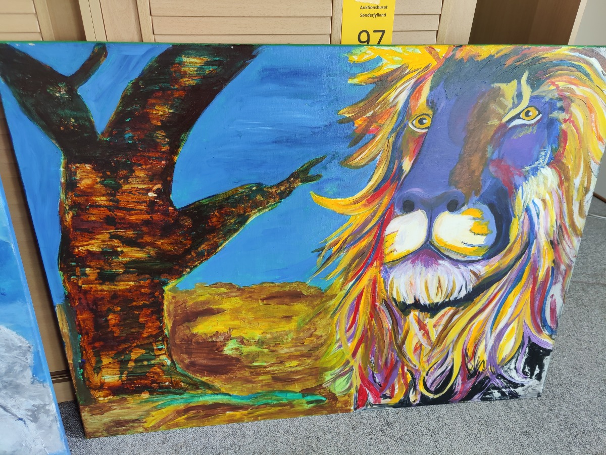 Ubk. kunstner. Løve og baobabtræ. Akryl på lærred. Umiddelbart usign. 90 x 120 cm.